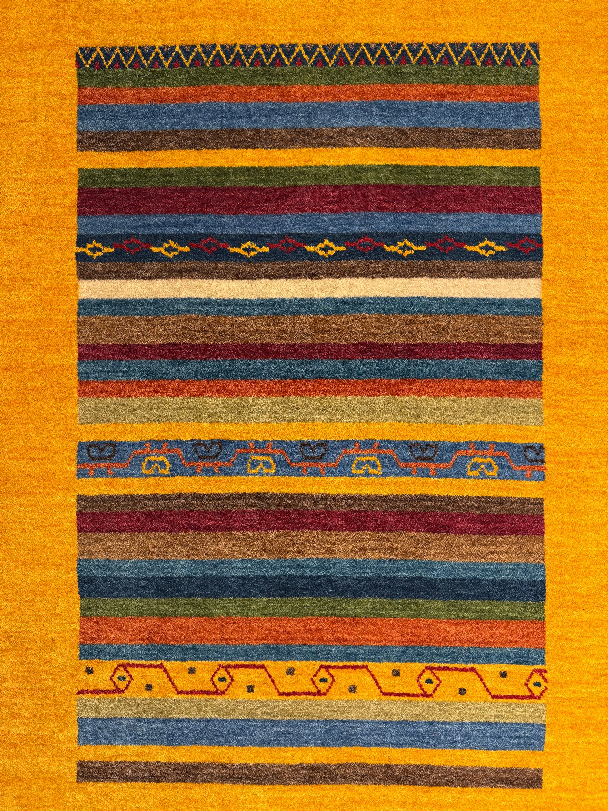 Color Loom Serisi CL-0003 el dokuma halısı, sarı zemin üzerine yerleştirilmiş renkli çizgiler ve etnik motiflerle yaşam alanına neşe ve canlılık katıyor. Türk halıcılık geleneğini modern bohem bir yorumla sunan bu özel parça tamamen el yapımıdır ve her biri eşsizdir.