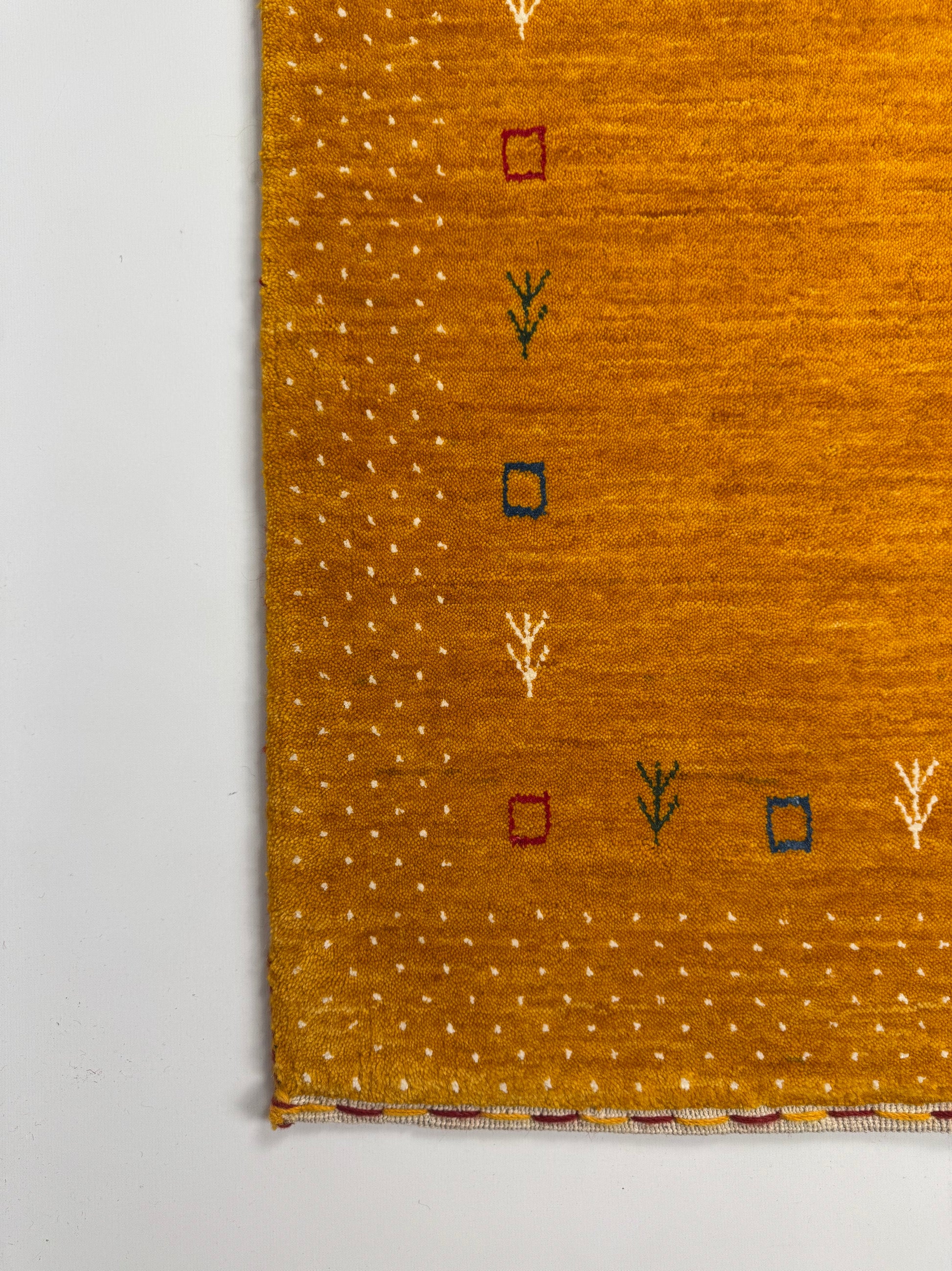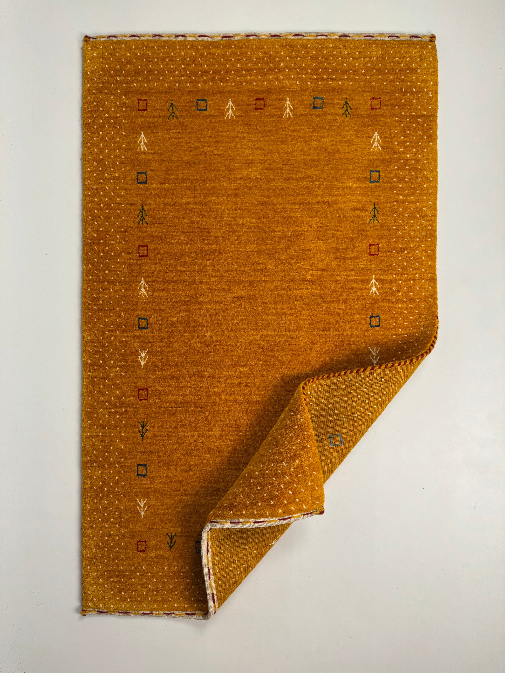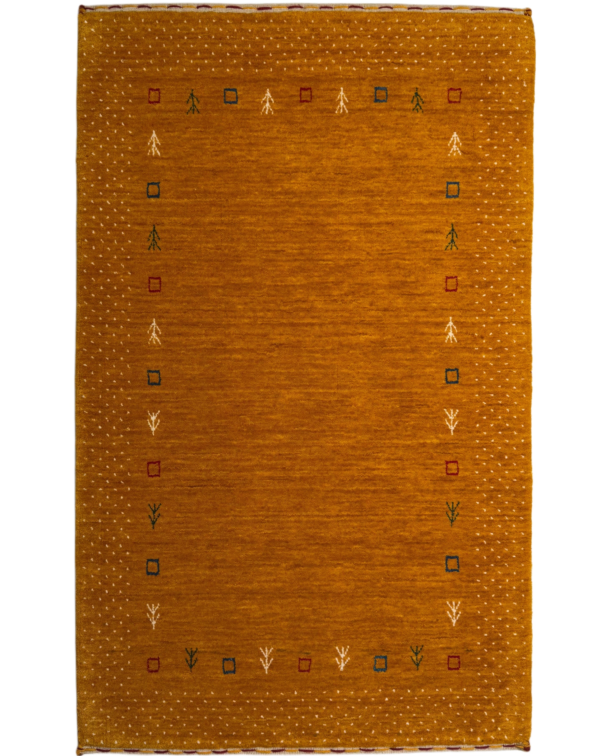 Color Loom Serisi CL-0012 el dokuma halısı, sıcak sarı-turuncu tonları üzerine işlenen küçük kare ve ağaç motifleriyle dikkat çeker. Minimalist görünümü otantik detaylarla buluşturan bu özel halı, yaşam alanınıza hem sıcaklık hem de kültürel bir dokunuş katar.
