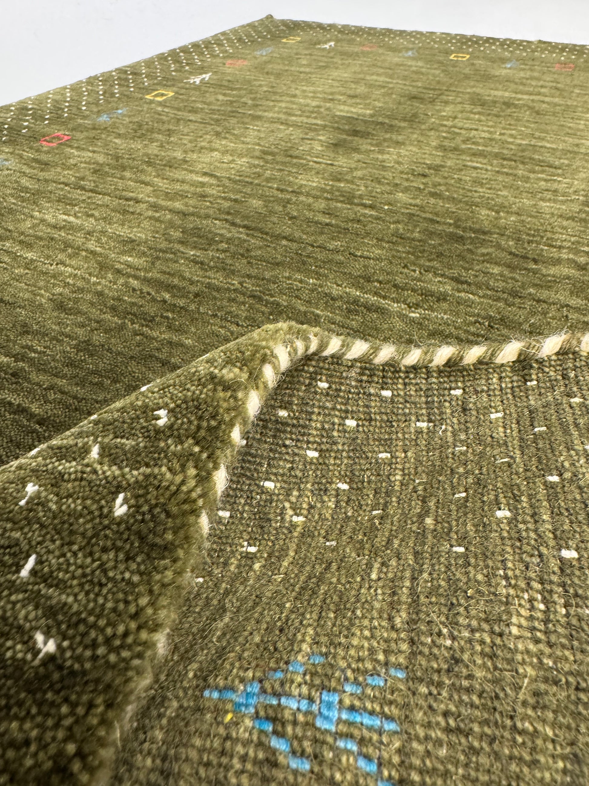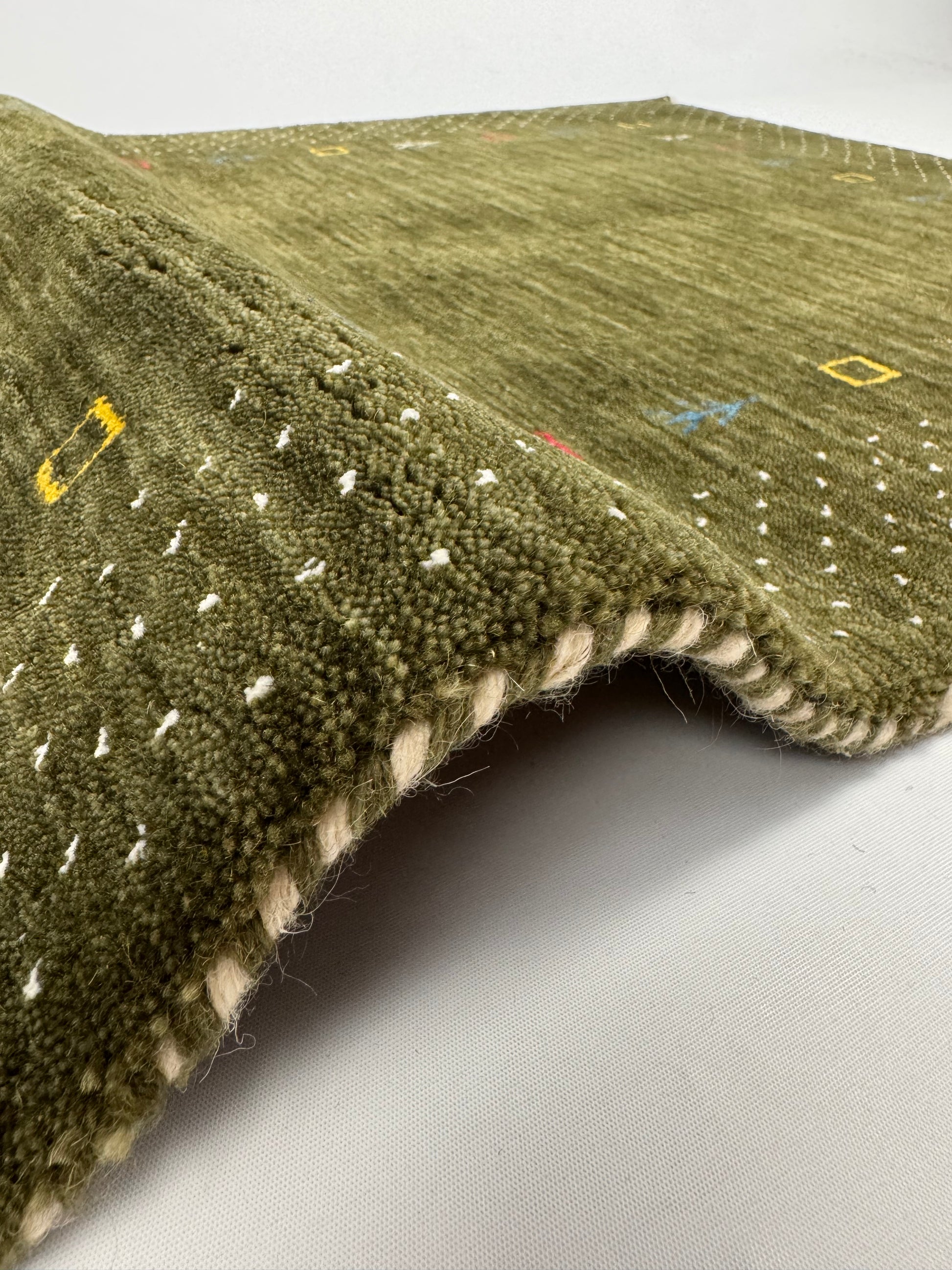 Color Loom Serisi CL-0013 el dokuma halısı, doğal yeşil tonları üzerine işlenen kare ve ağaç motifleriyle otantik bir görünüm sunar. Sade dokusunu küçük motif detaylarıyla zenginleştiren bu halı, yaşam alanınıza hem sıcaklık hem de özgünlük katar.