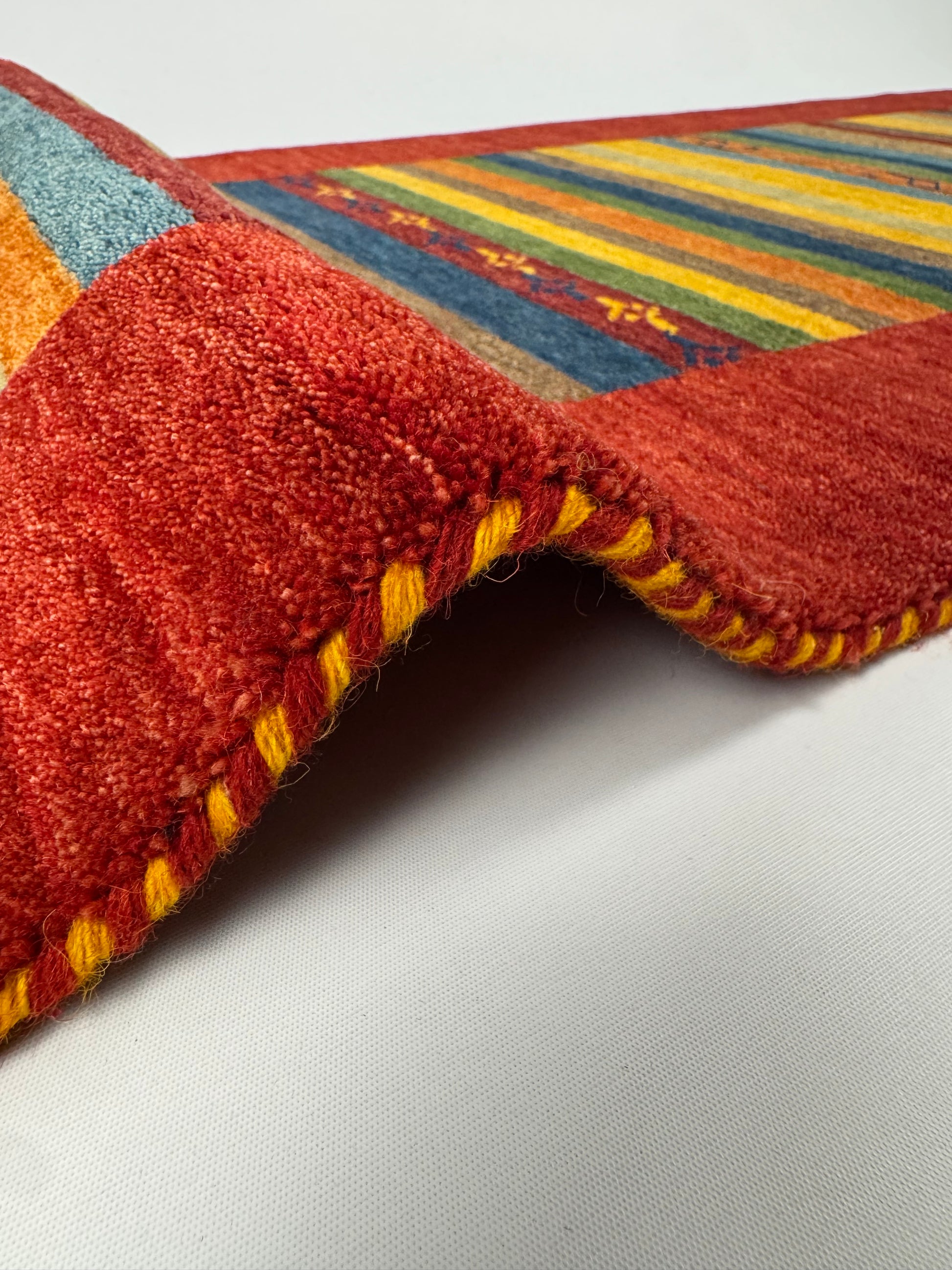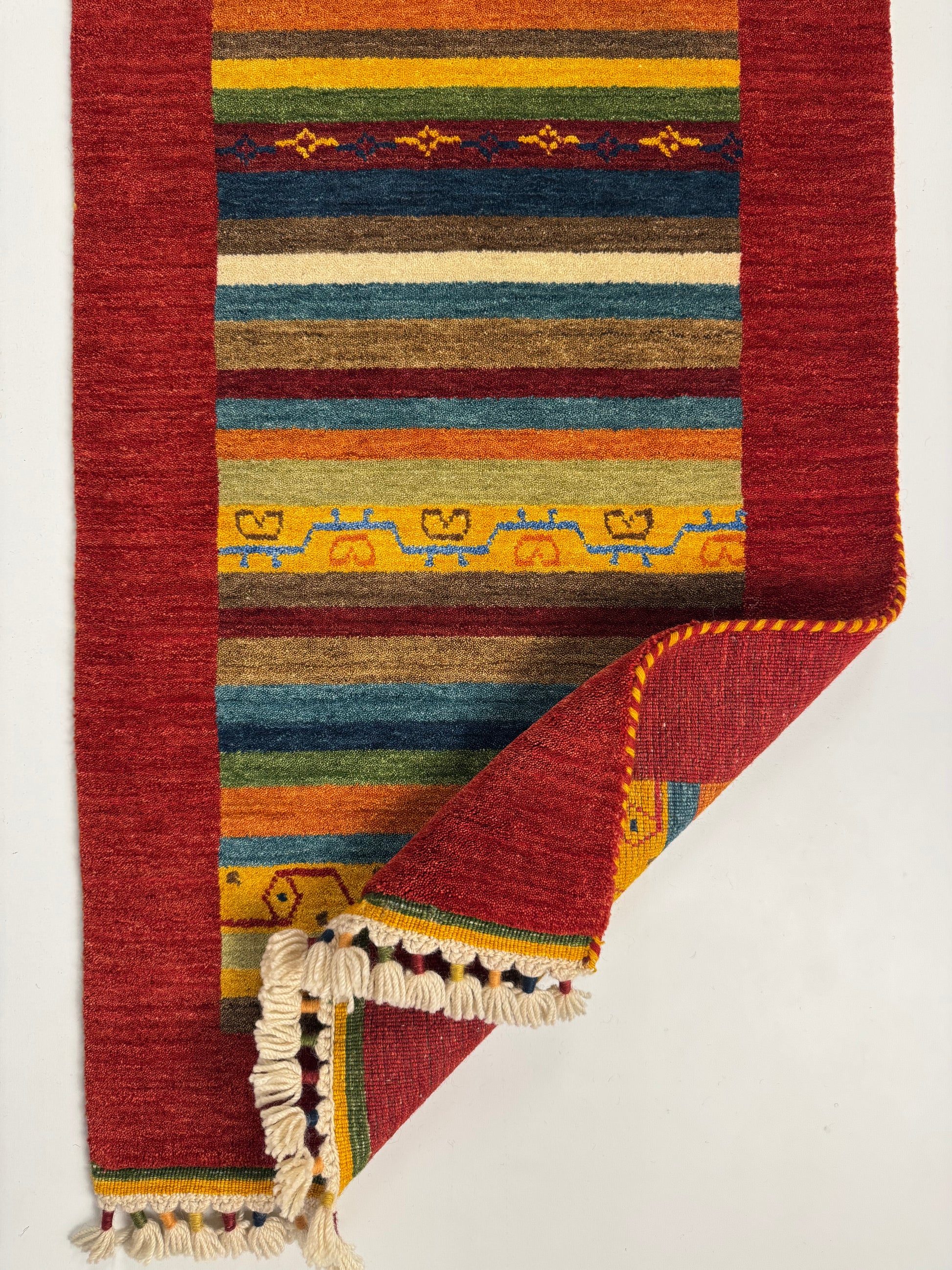 Color Loom Serisi CL-0017 el dokuma halısı, kırmızı bordürleri ve iç kısmında yer alan renkli çizgilerle dikkat çeker. Yolluk formunda tasarlanan bu özel halı, koridor, antre veya dar alanlar için ideal bir seçenektir. El emeğiyle hazırlanan motifler, modern bohem dekorasyonlarla kusursuz bir uyum sağlar.