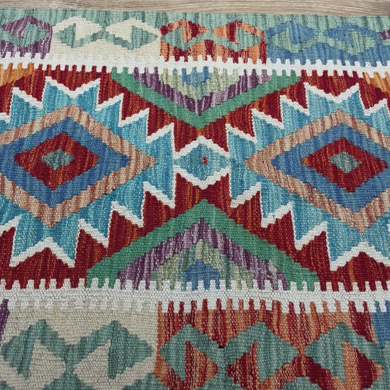 El Dokuma Çok Renkli Küçük Kilim – Kırmızı Turuncu Mavi Geometrik Desenli Otantik Halı (0.57 x 0.91 m) | Nomad Glow Serisi NG-0012