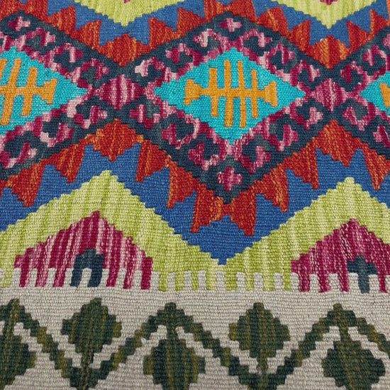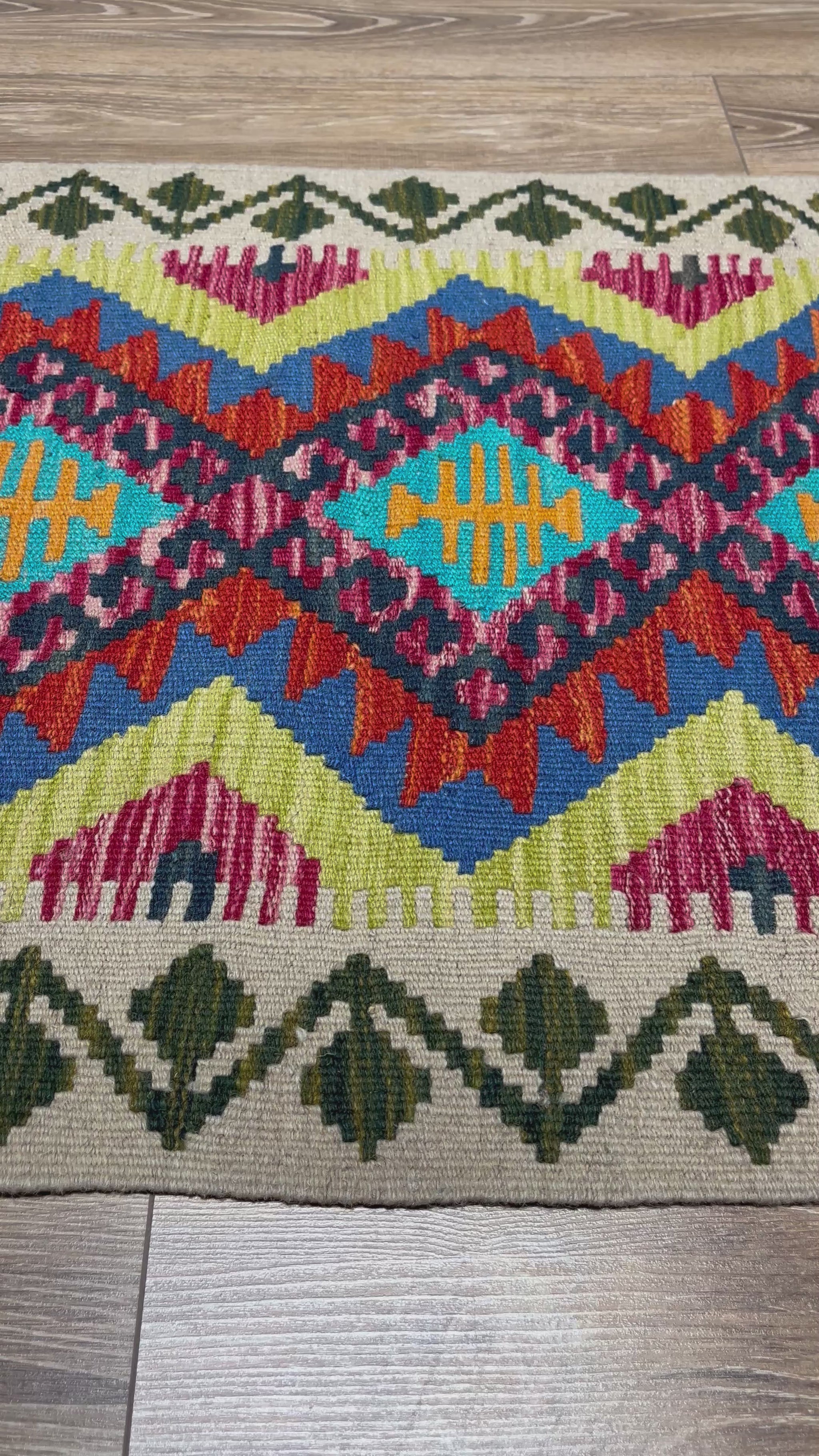 El Dokuma Renkli Küçük Kilim – Kırmızı Sarı Mavi Geometrik Desenli Otantik Halı (0.65 x 0.90 m) | Nomad Glow Serisi NG-0011