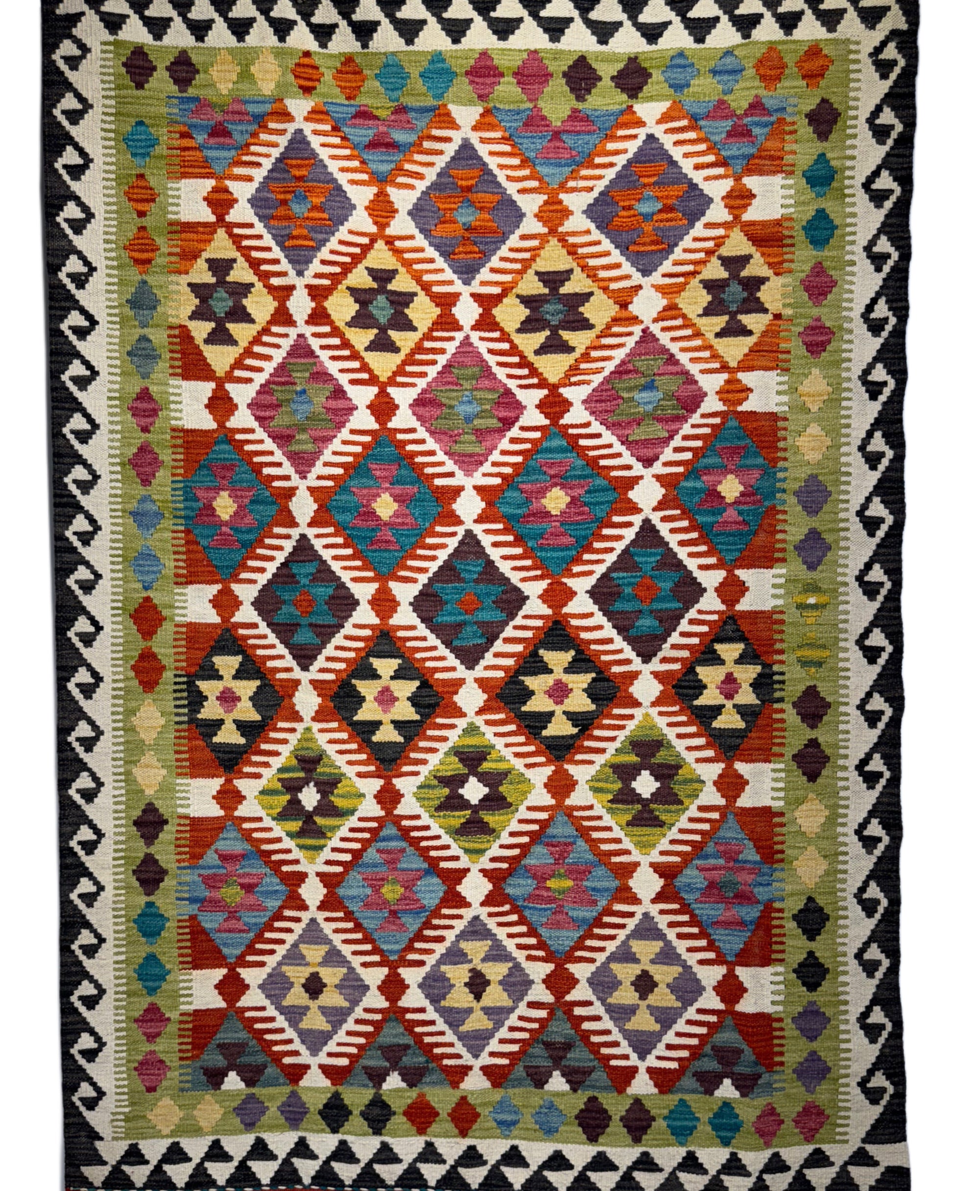 Nomad Glow koleksiyonunun NG-0031 kodlu bu el dokuma kilimi, fıstık yeşili zemin üzerinde kırmızı ve mavi tonlarda işlenen elmas motifleriyle göz alıcı bir görünüm sunuyor. Canlı renk geçişleriyle hareketlenen desenler, siyah-beyaz kenar bordürleriyle çerçevelenerek güçlü bir kontrast oluşturuyor. Zarif el işçiliğinin ürünü olan bu kilim, bohem ve otantik mekanlara sıcaklık ve özgün bir karakter katıyor. Orta boyutu sayesinde salon, oturma odası ve giriş alanlarında rahatlıkla kullanılabilir.