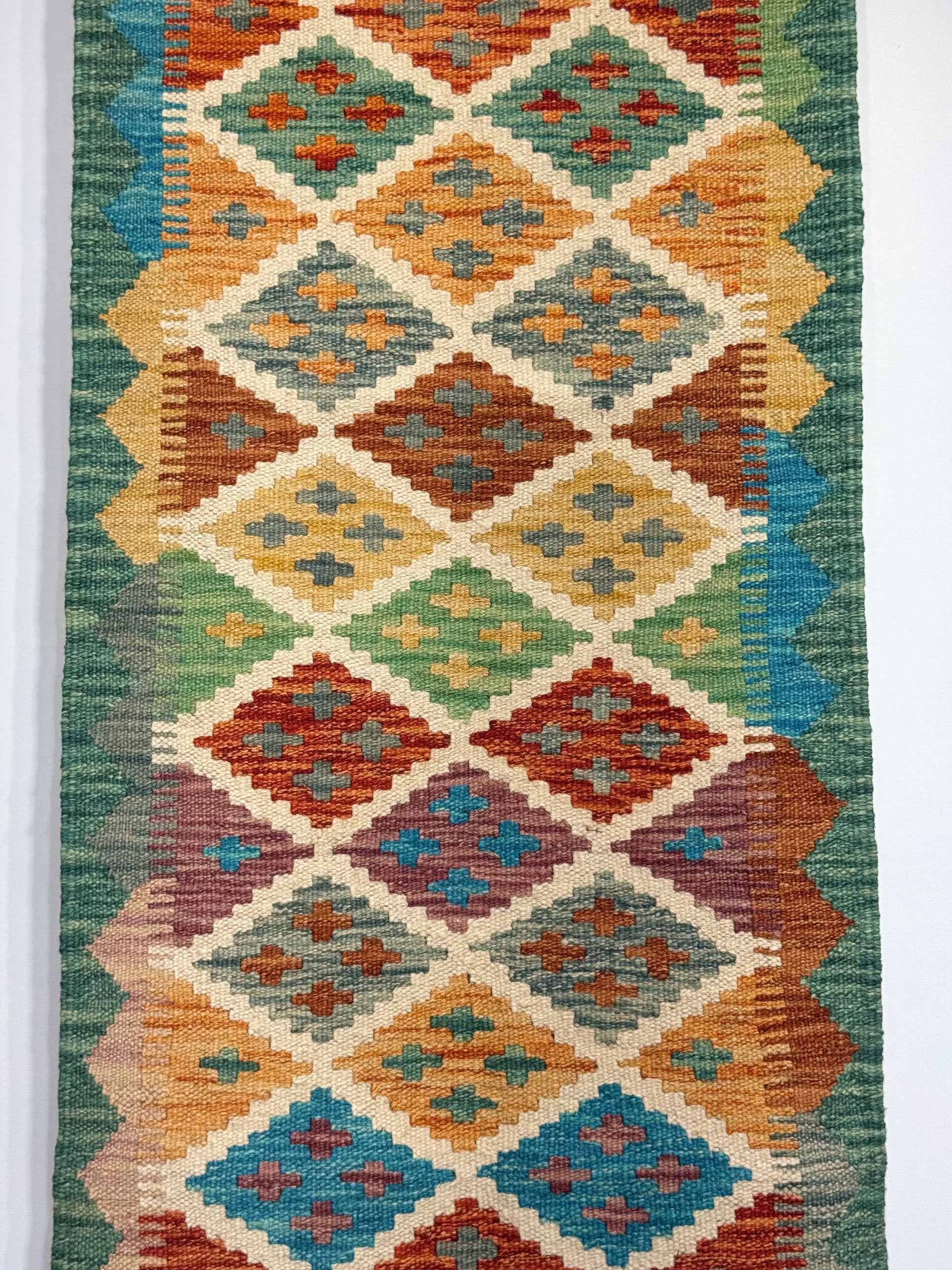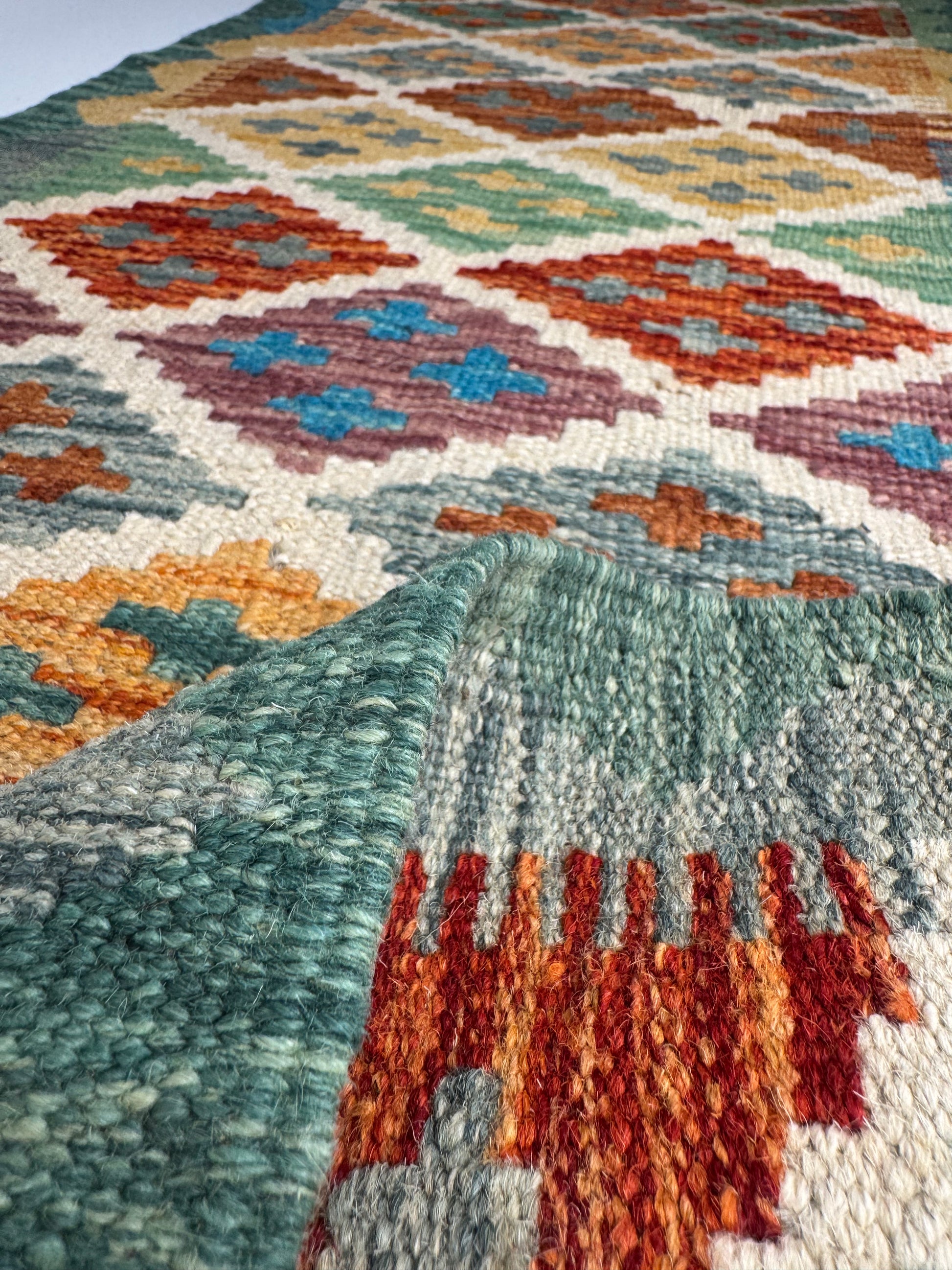 El Dokuma Uzun Kilim – Krem Turuncu Mavi Çok Renkli Geometrik Desenli Otantik Halı (0.49 x 1.41 m) | Nomad Glow Serisi NG-0015