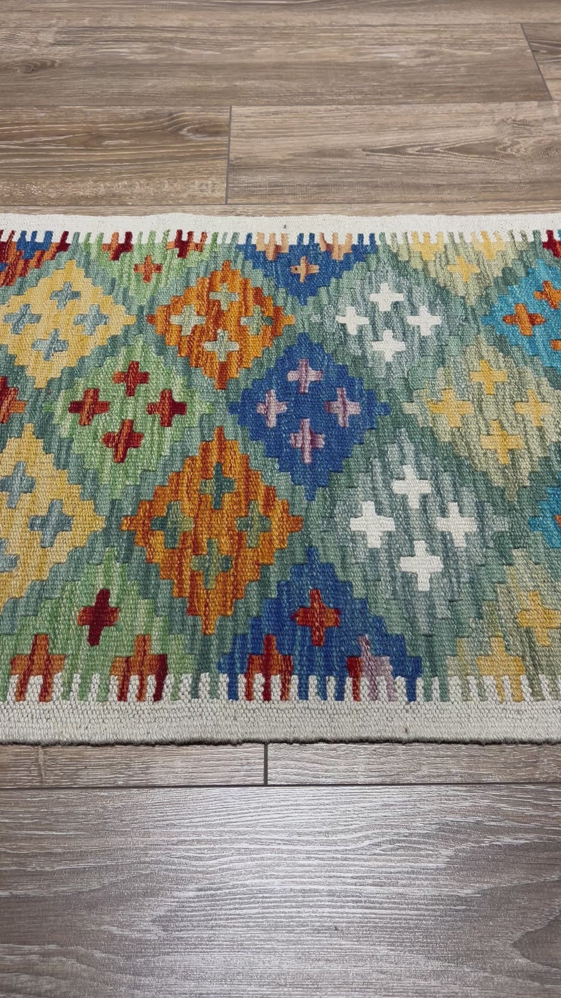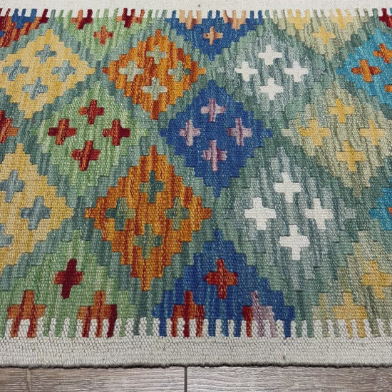 El Dokuma Uzun Kilim – Mavi Turuncu Sarı Geometrik Desenli Otantik Dekoratif Halı (0.53 x 1.40 m) | Nomad Glow Serisi NG-0016