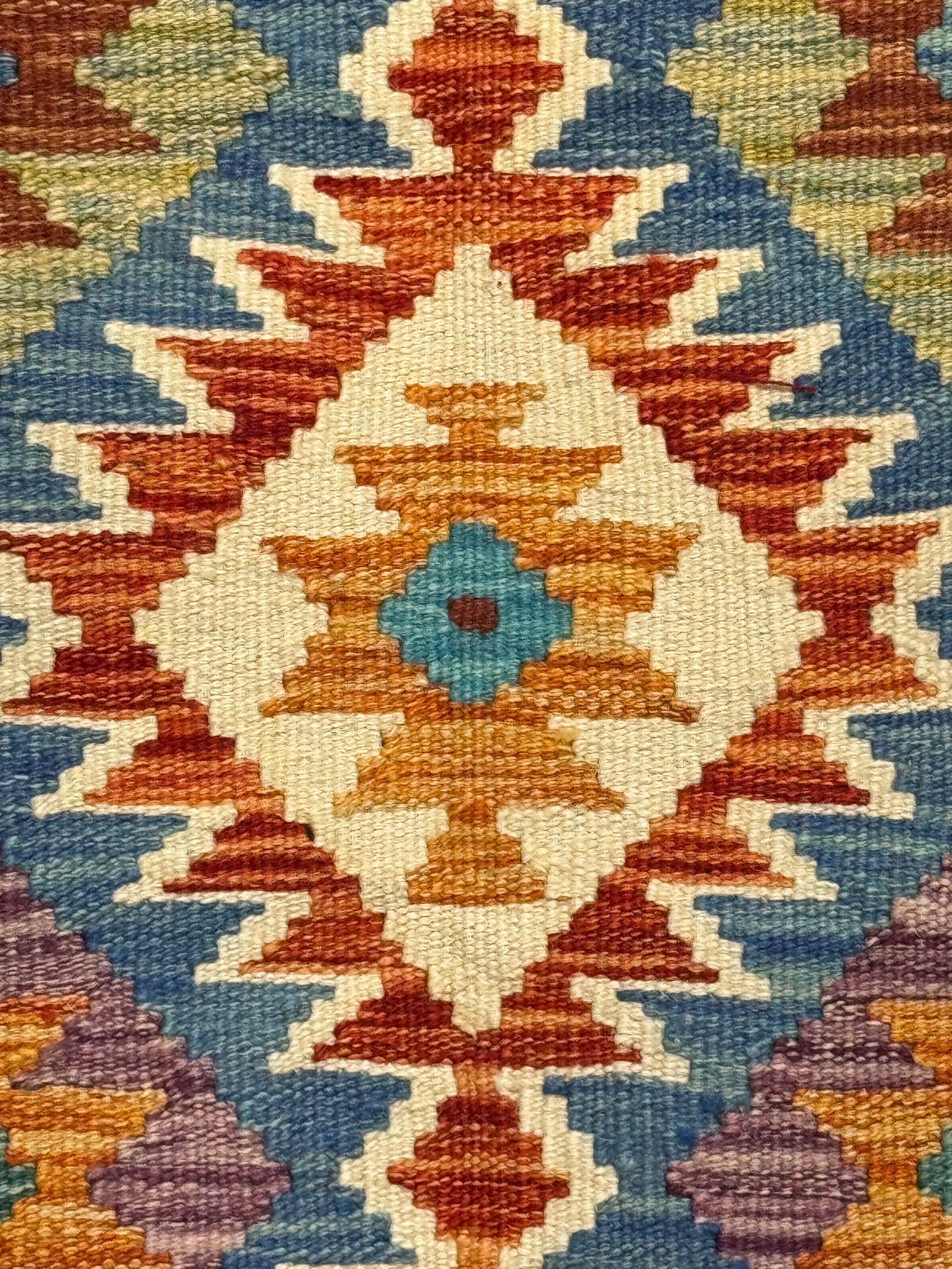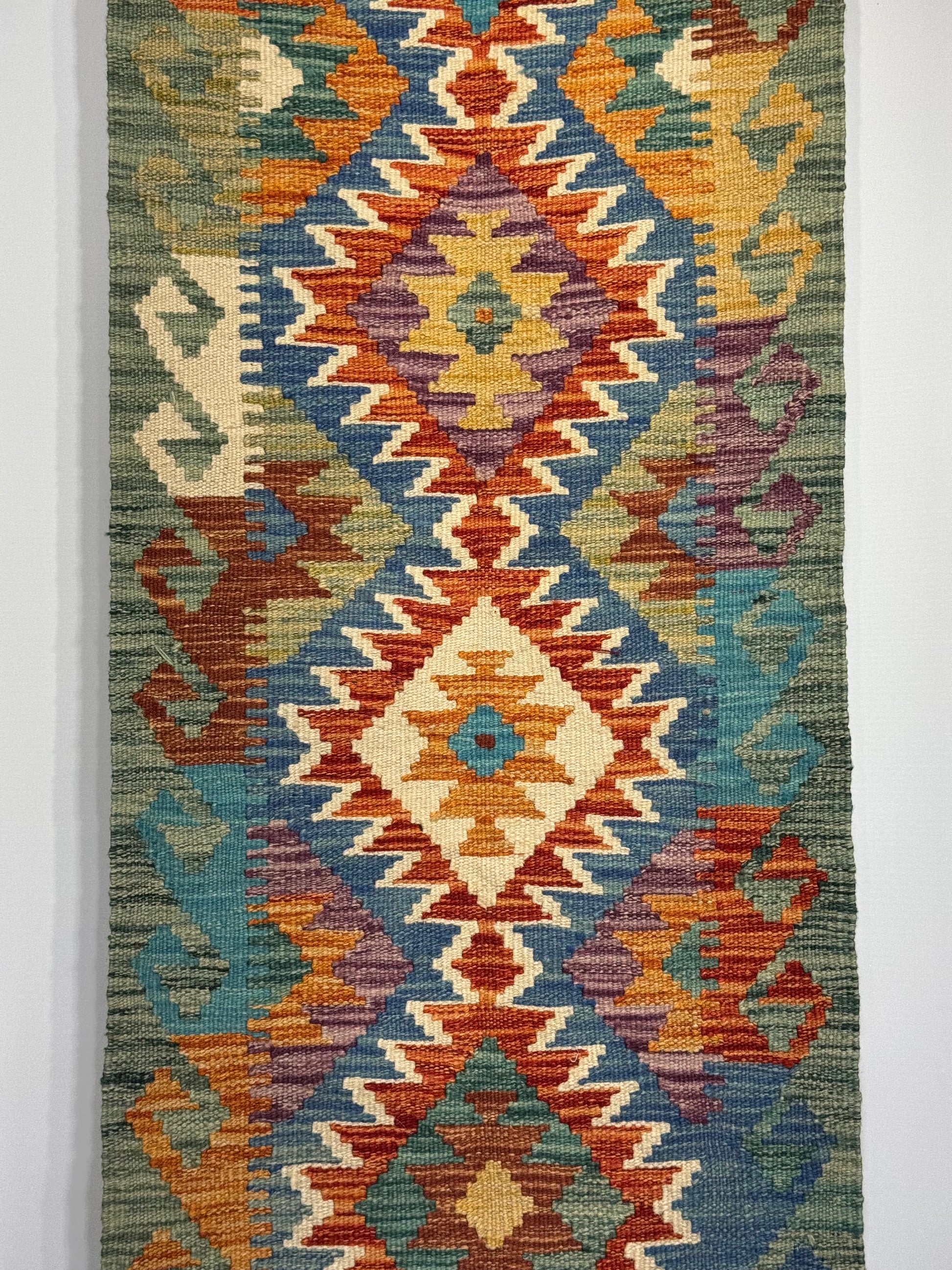 El Dokuma Uzun Kilim – Turuncu Mavi Çok Renkli Geometrik Desenli Otantik Halı (0.51 x 1.49 m) | Nomad Glow Serisi NG-0014