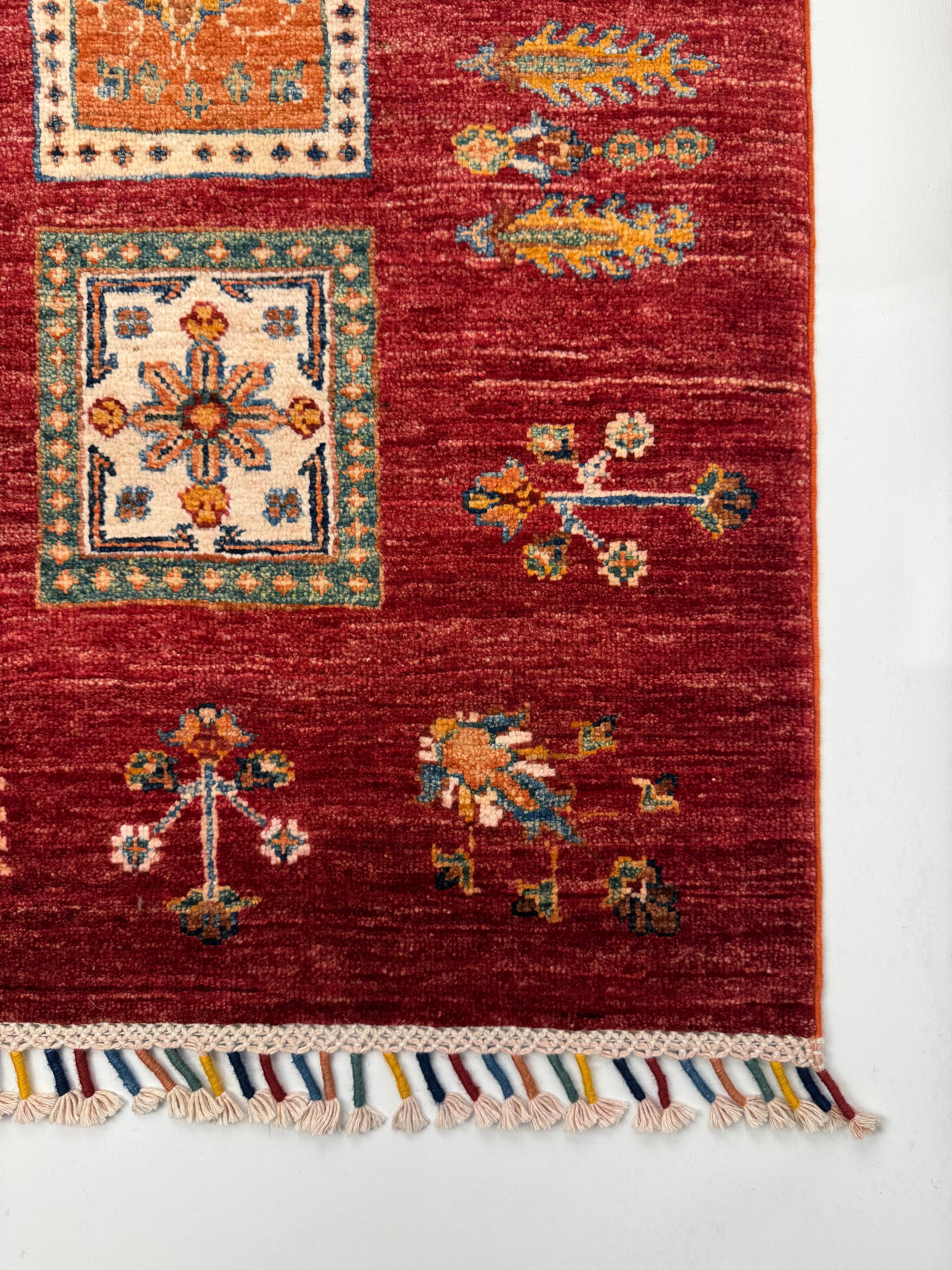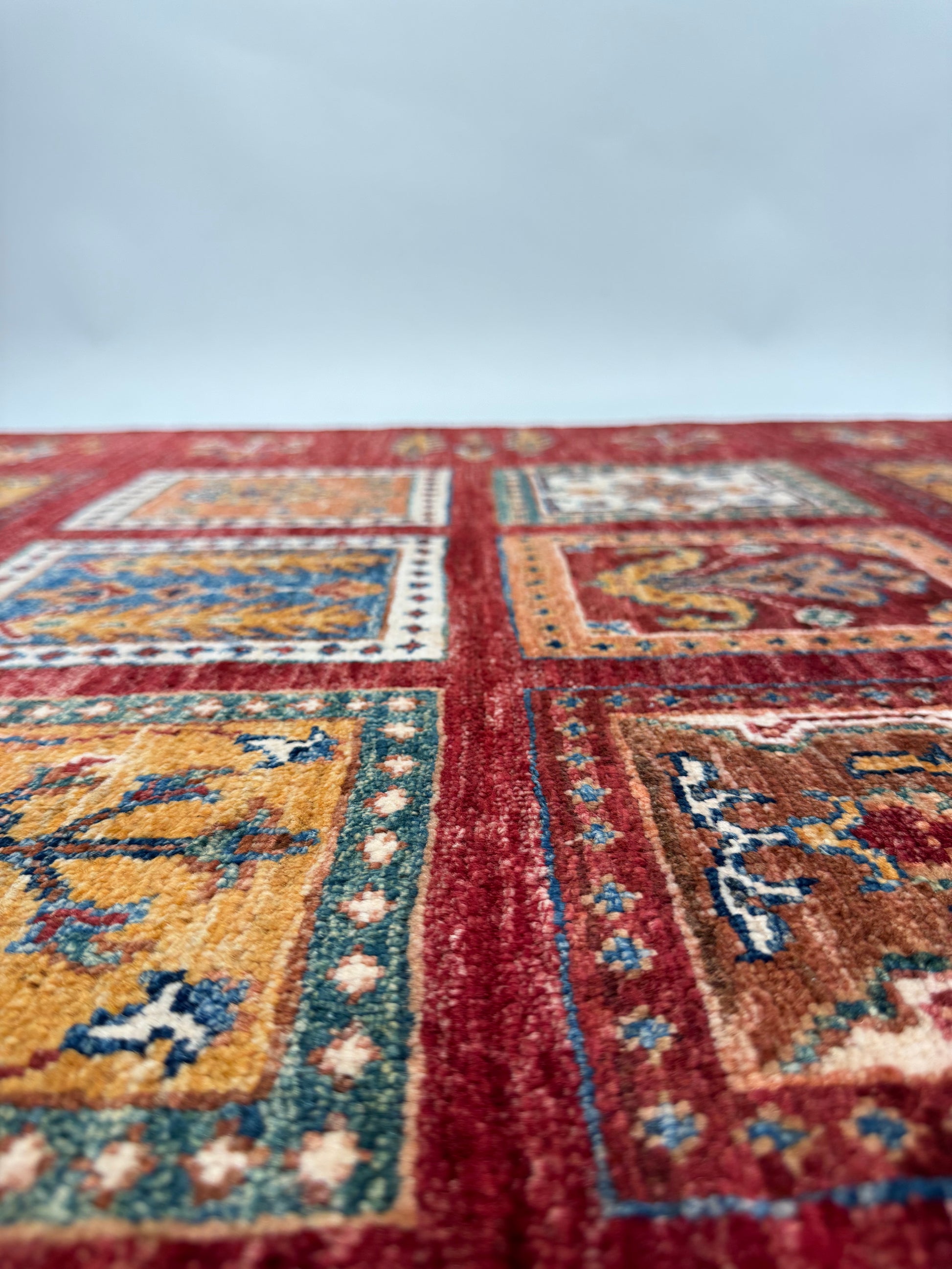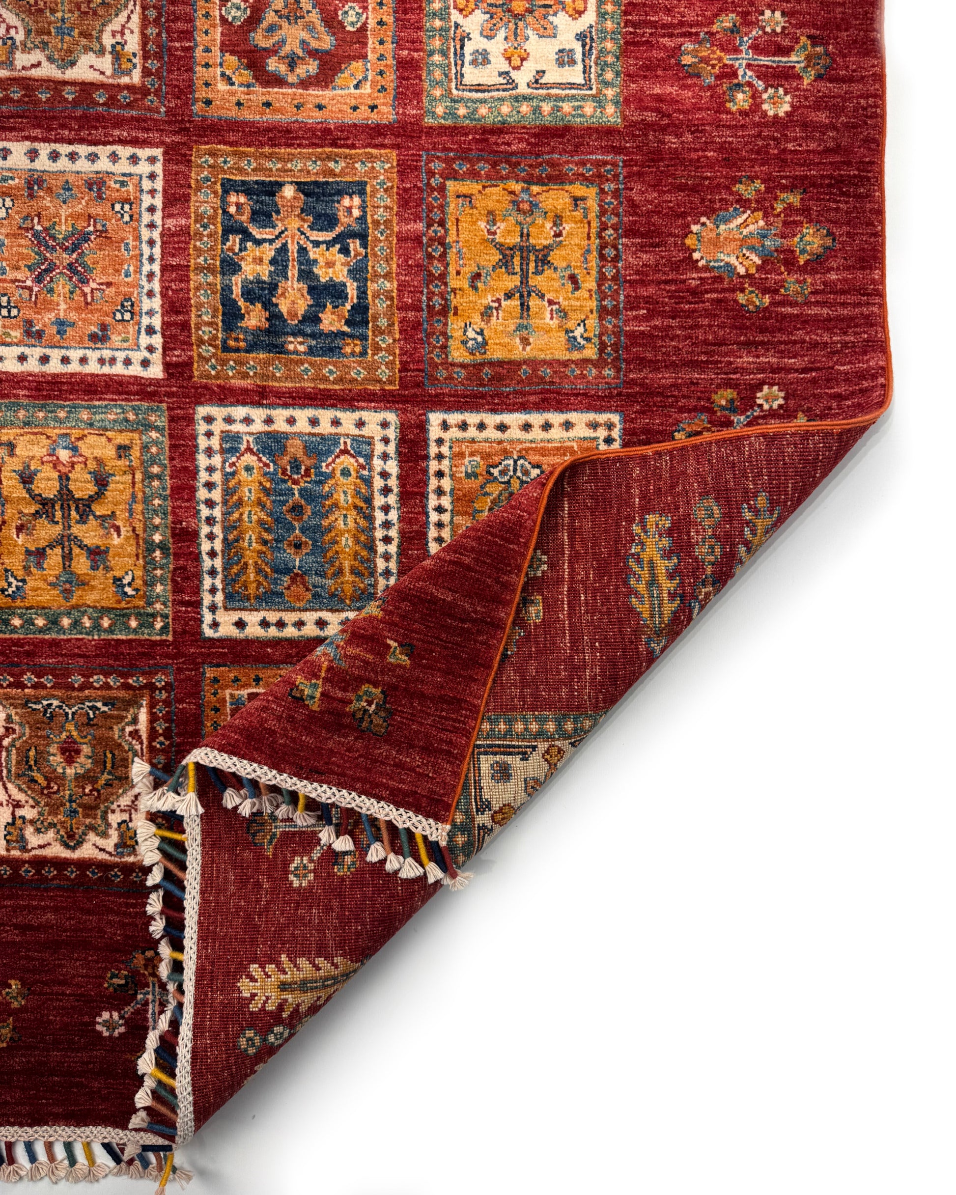 Imperium Serisi’nin I-0001 kodlu el dokuma halısı, kırmızı zemin üzerine yerleştirilmiş kare patchwork desenleriyle öne çıkar. Her kare, Anadolu’nun kadim motiflerinden ilham alarak tasarlanmış ve %100 doğal yün ile dokunmuştur.