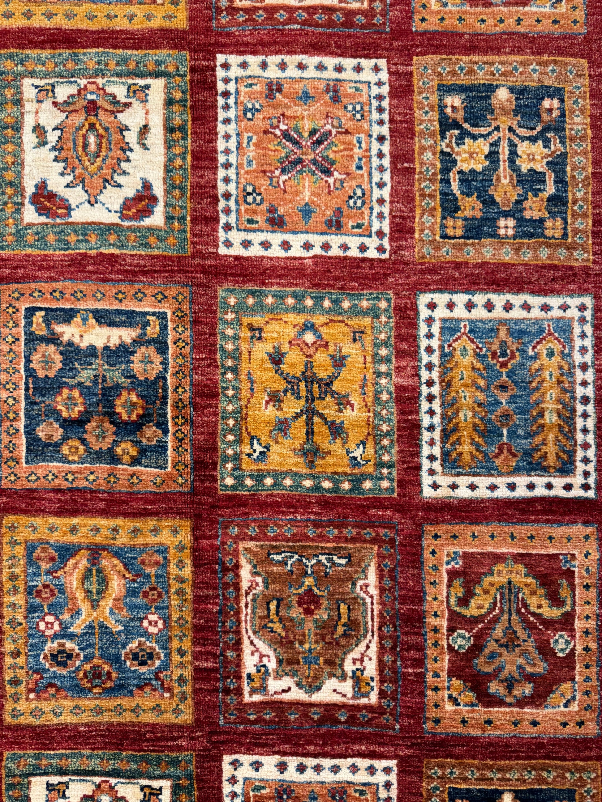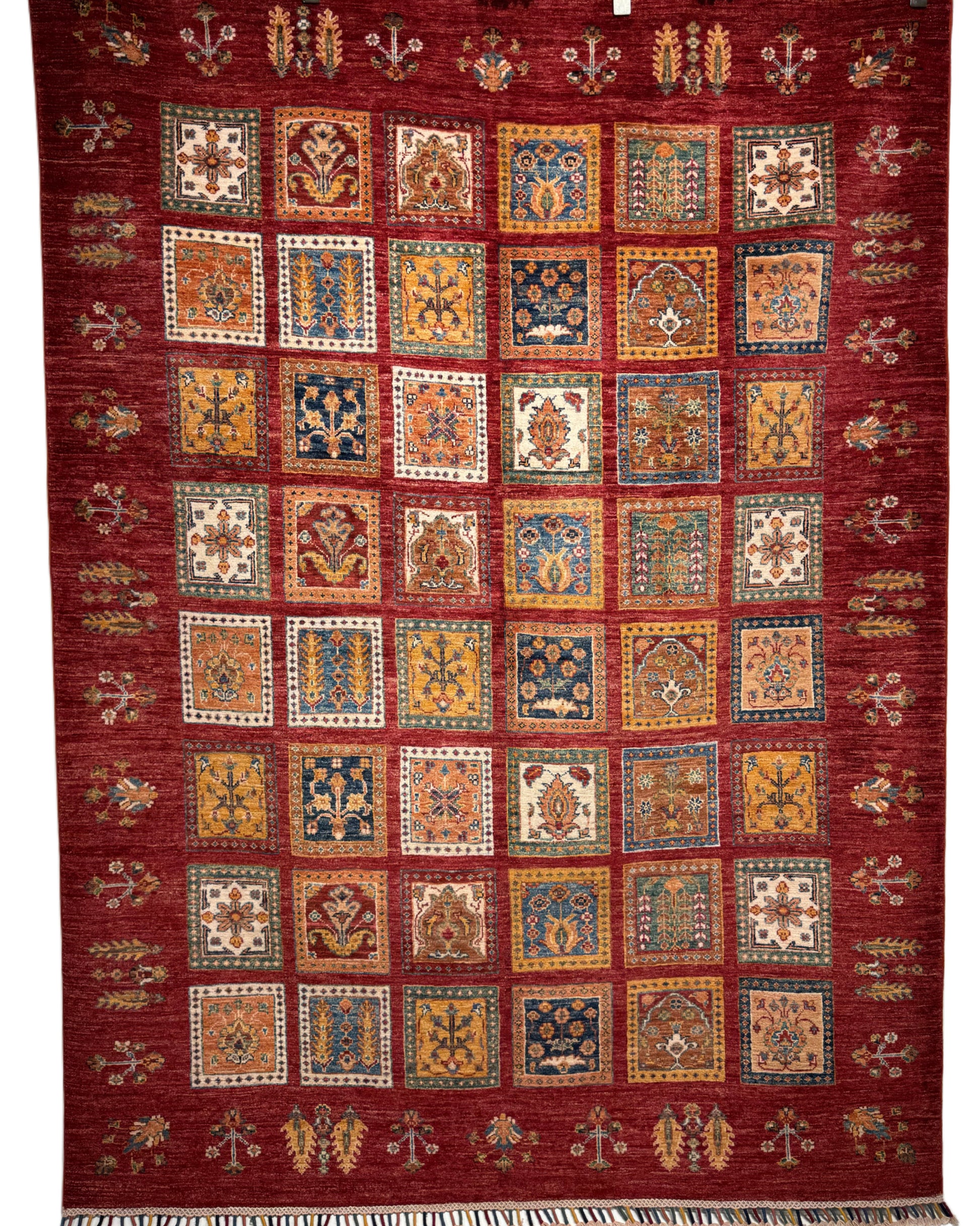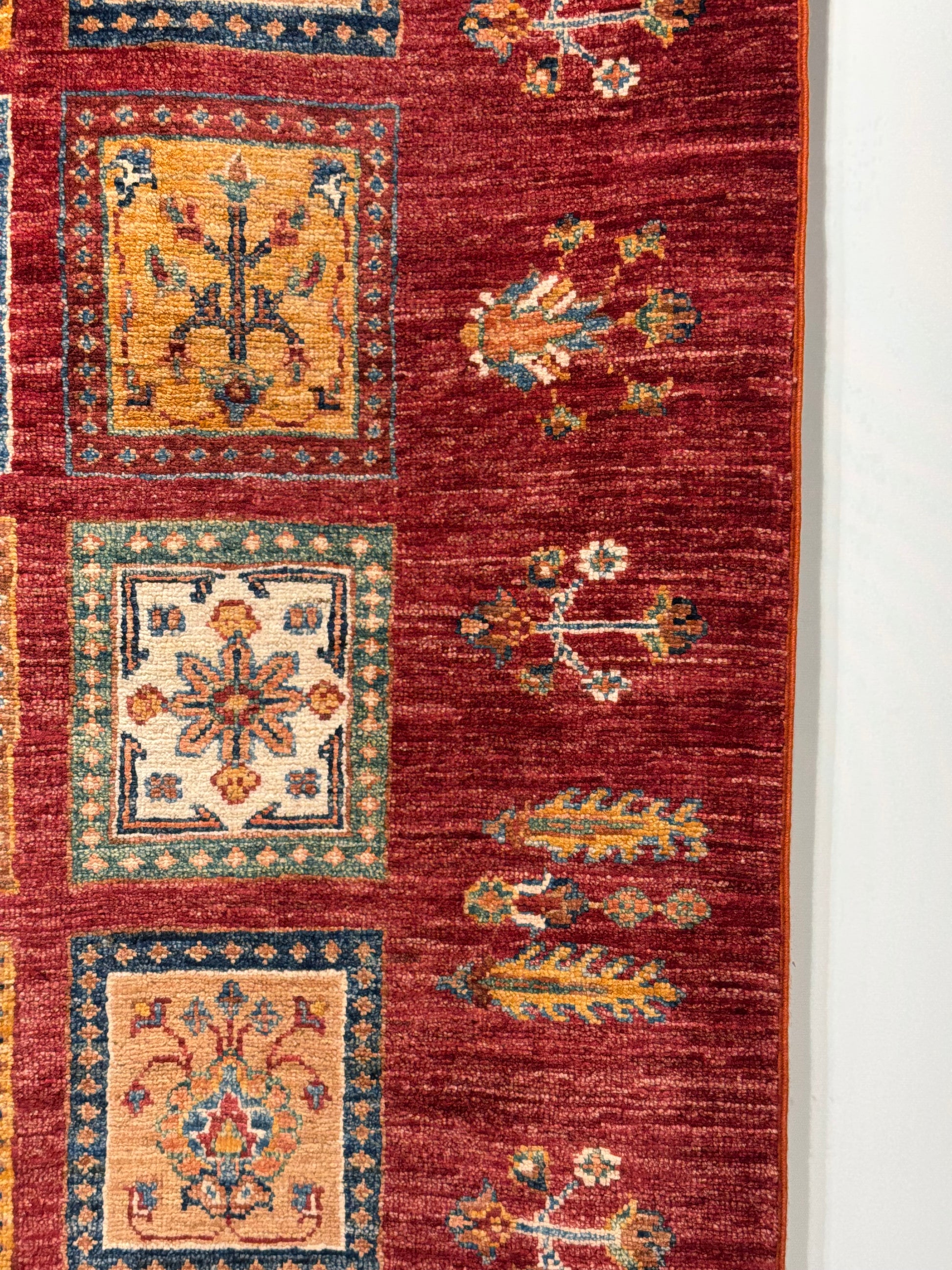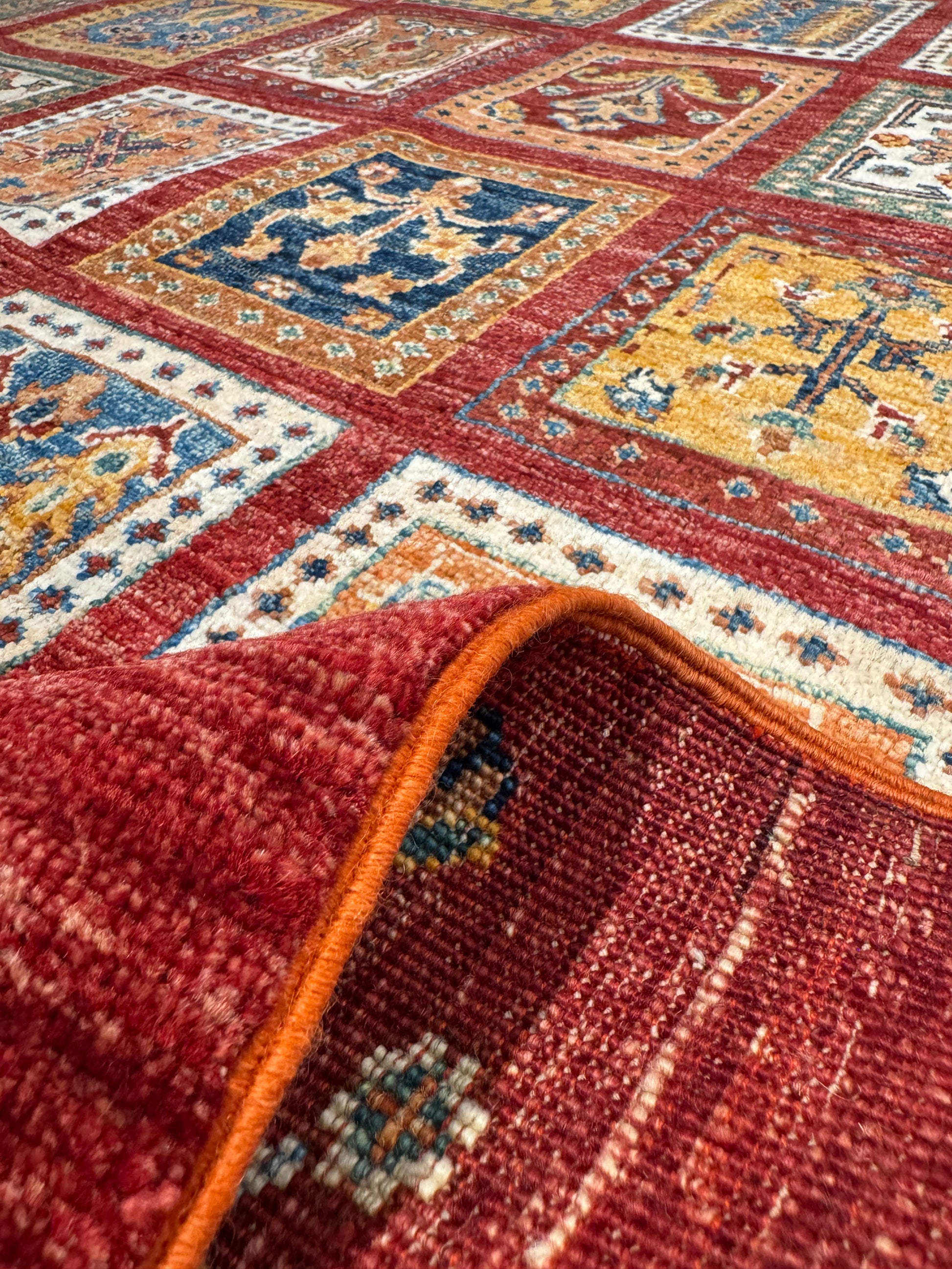 Imperium Serisi’nin I-0001 kodlu el dokuma halısı, kırmızı zemin üzerine yerleştirilmiş kare patchwork desenleriyle öne çıkar. Her kare, Anadolu’nun kadim motiflerinden ilham alarak tasarlanmış ve %100 doğal yün ile dokunmuştur.