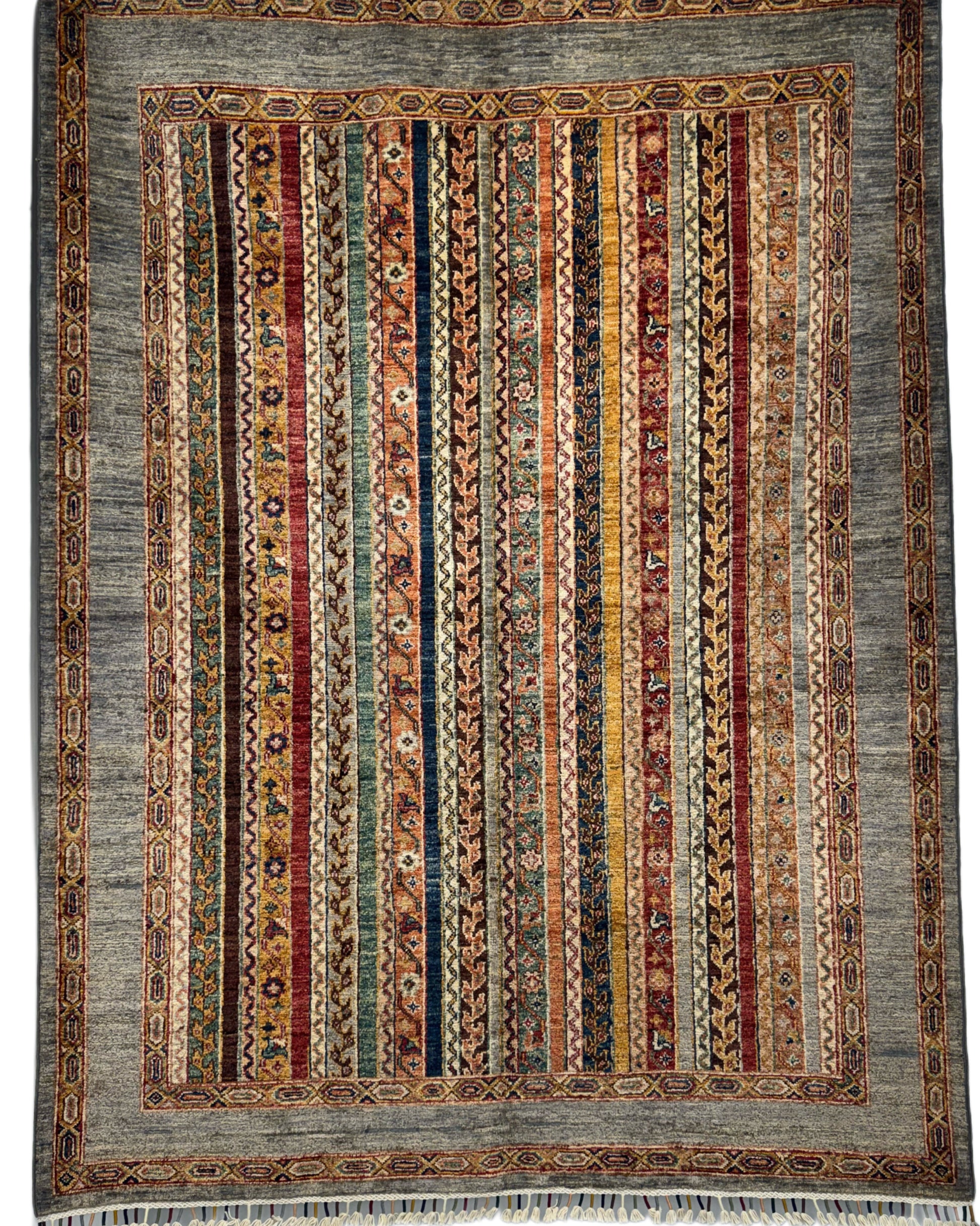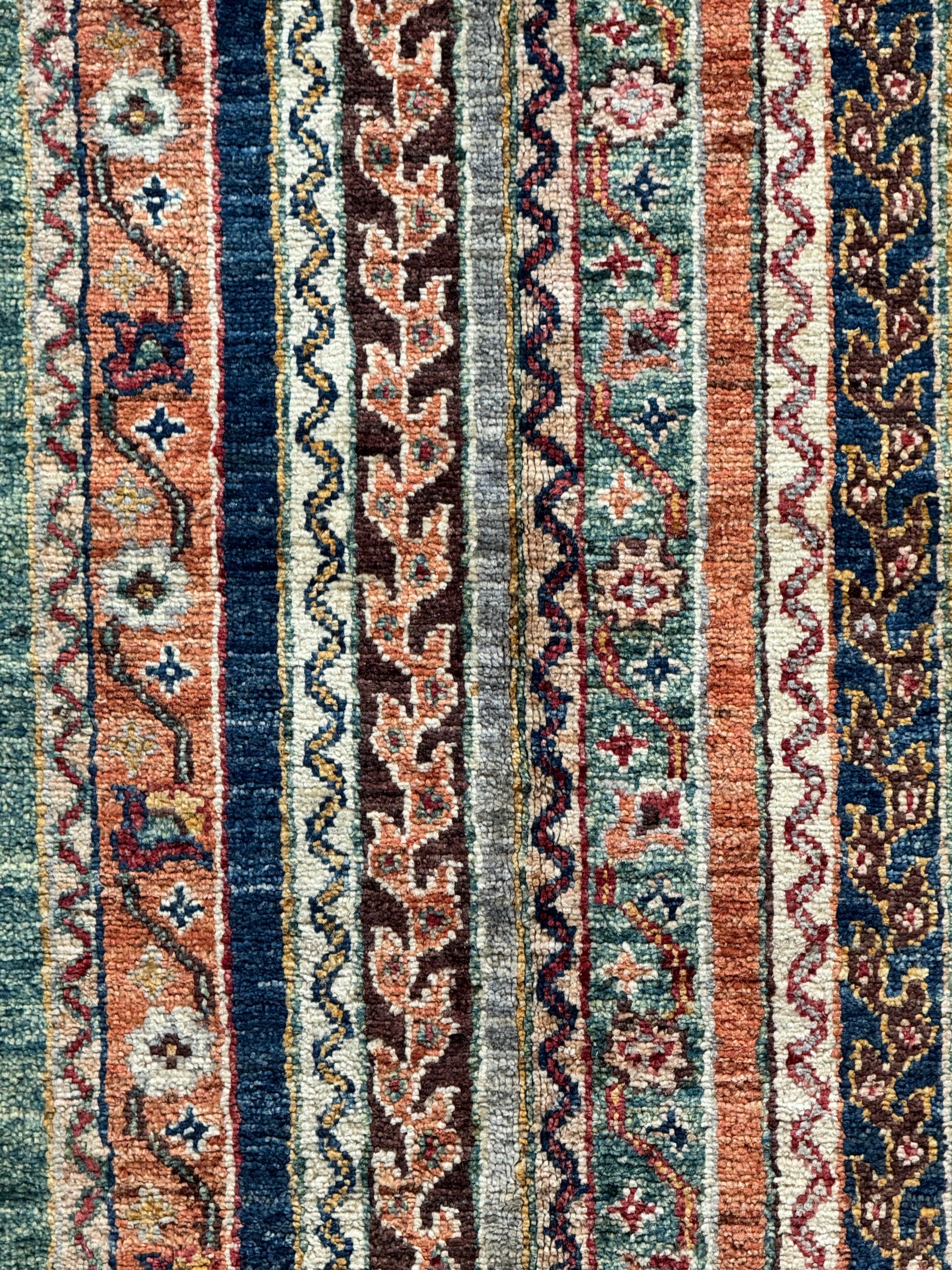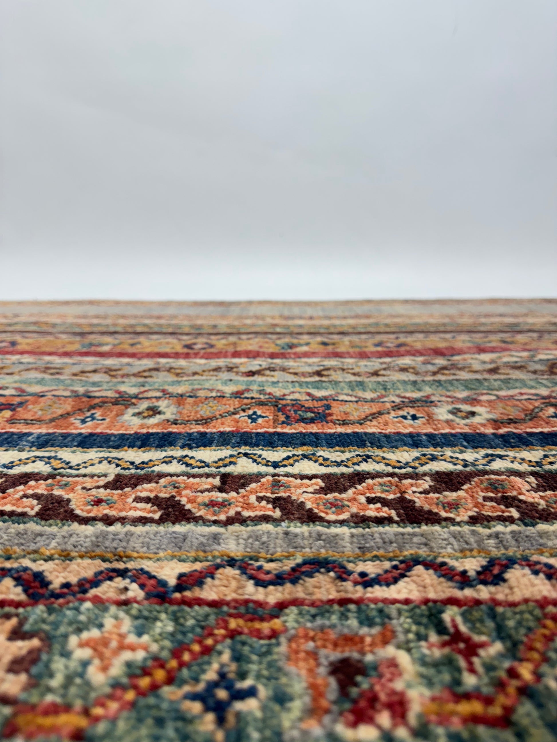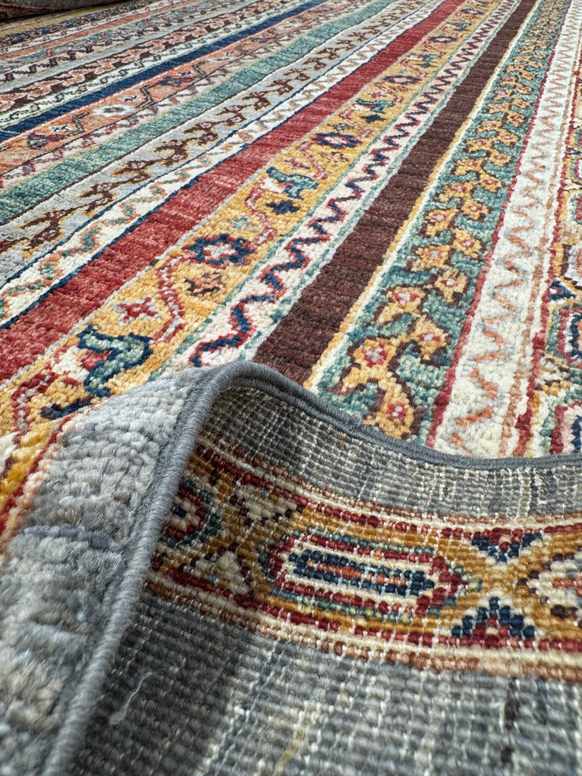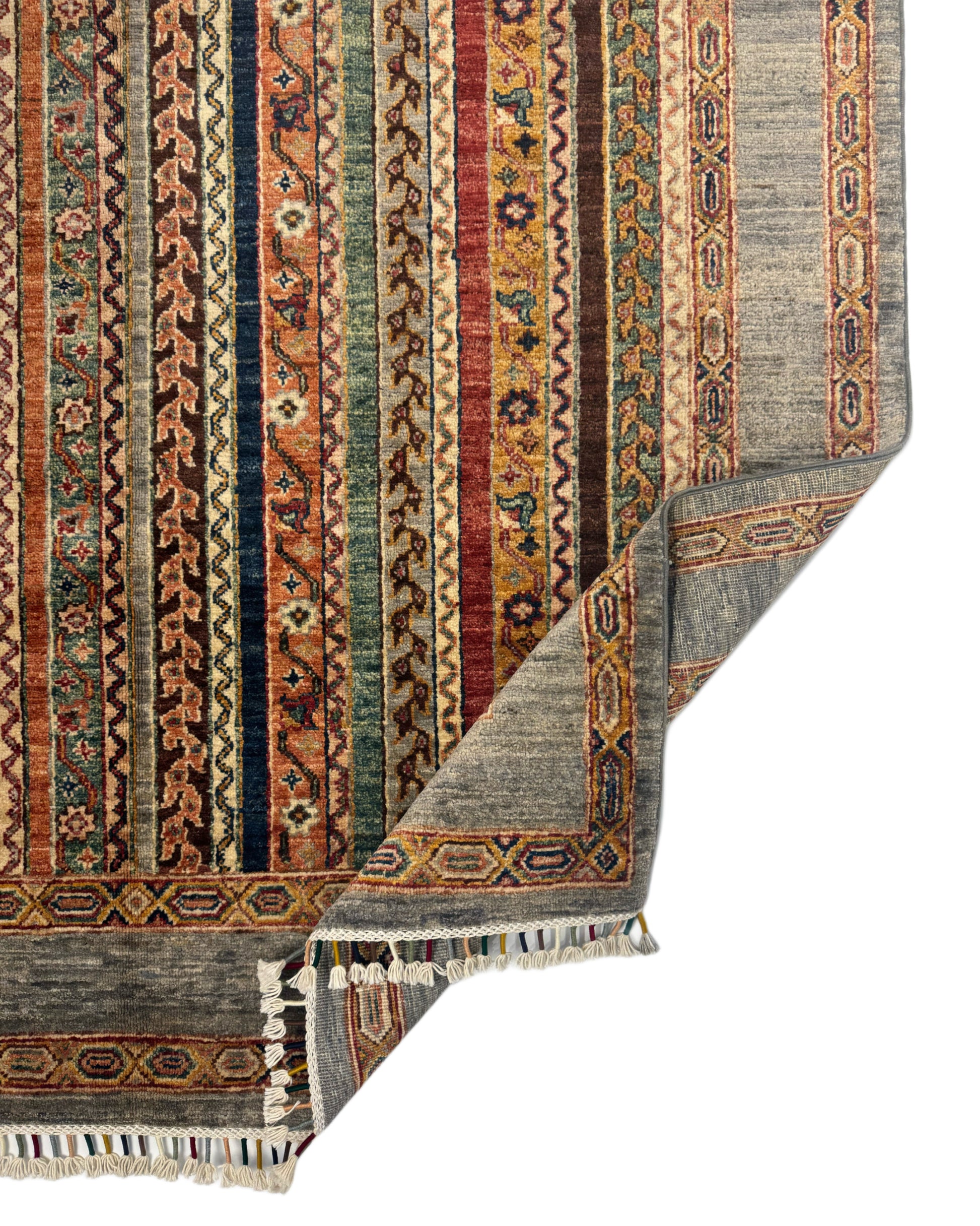 Imperium Serisi’nin I-0003 kodlu el dokuma halısı, ince işçilikle dokunmuş dikey şerit desenleri ve zengin renk kombinasyonuyla öne çıkar. Her şerit; geometrik figürler, çiçek motifleri ve geleneksel Anadolu dokularını barındırarak halıya zamansız bir karakter kazandırır.