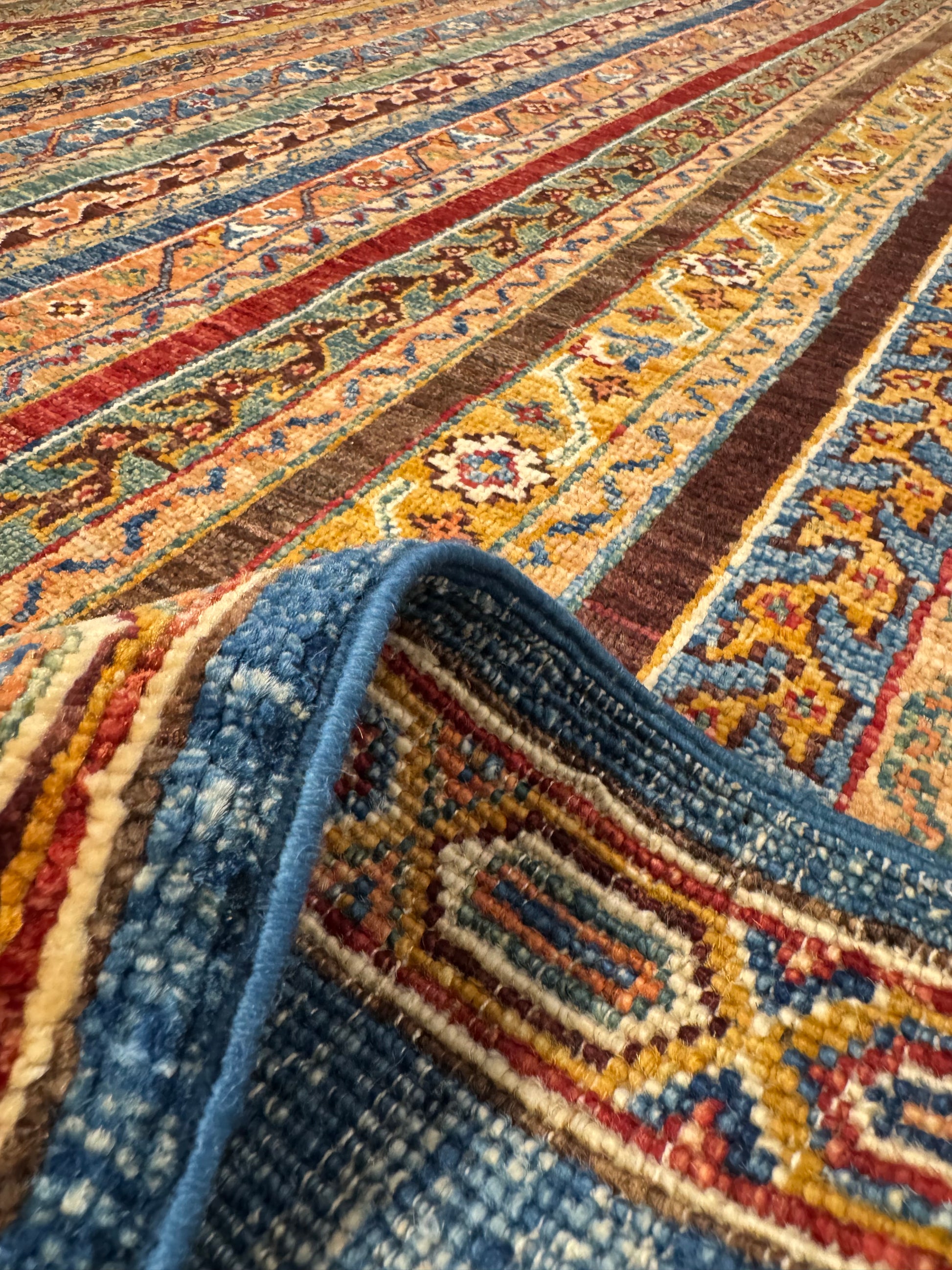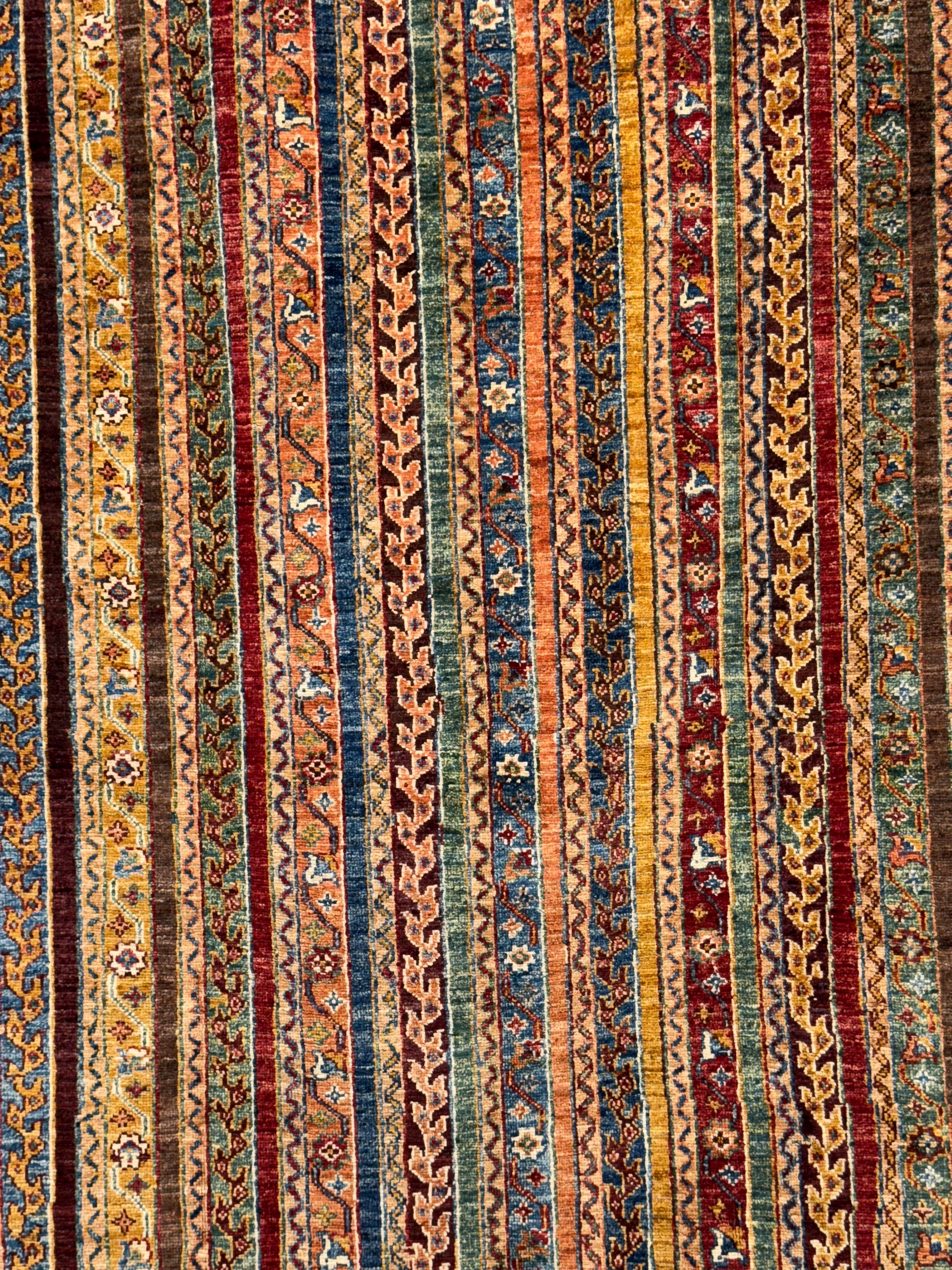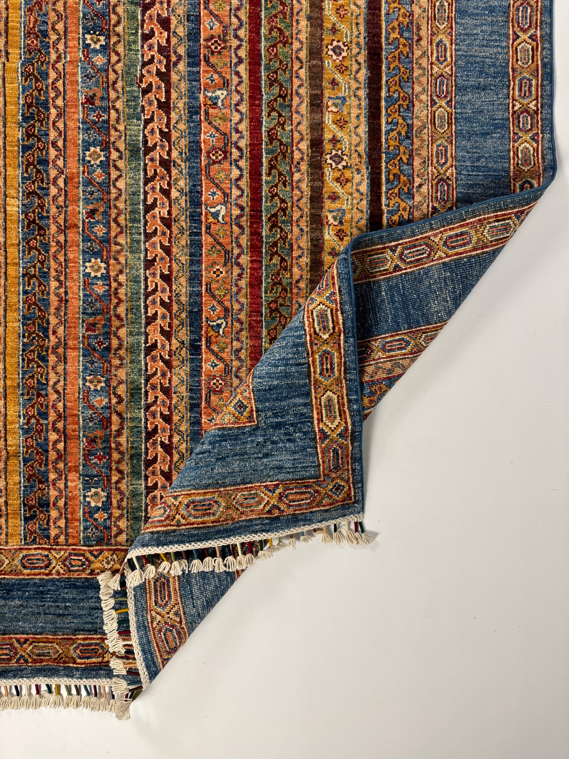 Imperium Serisi’nin I-0005 kodlu el dokuma halısı, dikey şerit motifleriyle öne çıkar. Her bir şerit; yaprak, geometrik ve geleneksel Anadolu desenleriyle işlenmiş olup halının derinlik ve zenginlik hissini artırır. Mavi kenar bordürü ise halıya çerçeve etkisi vererek güçlü bir bütünlük sağlar.
