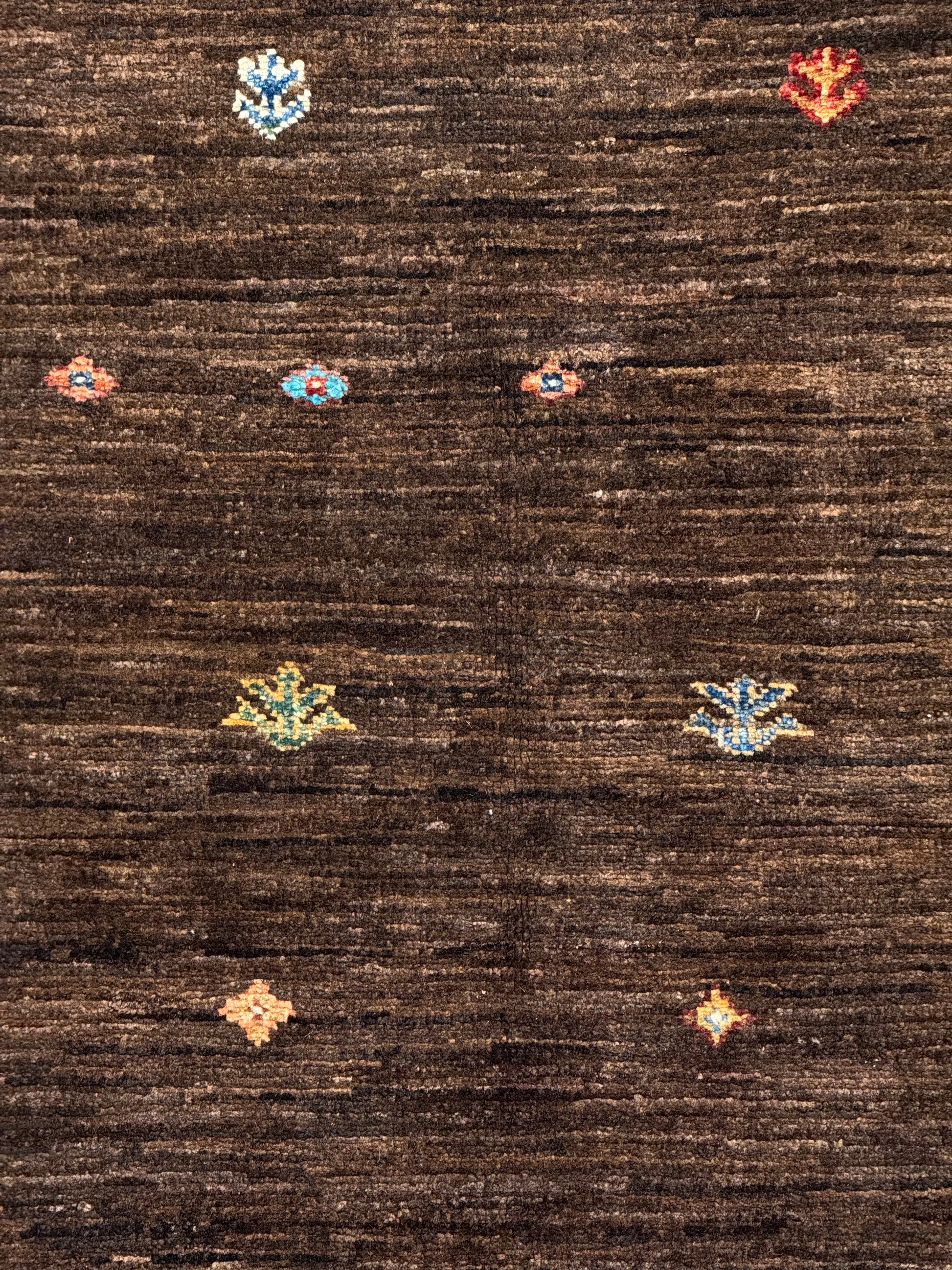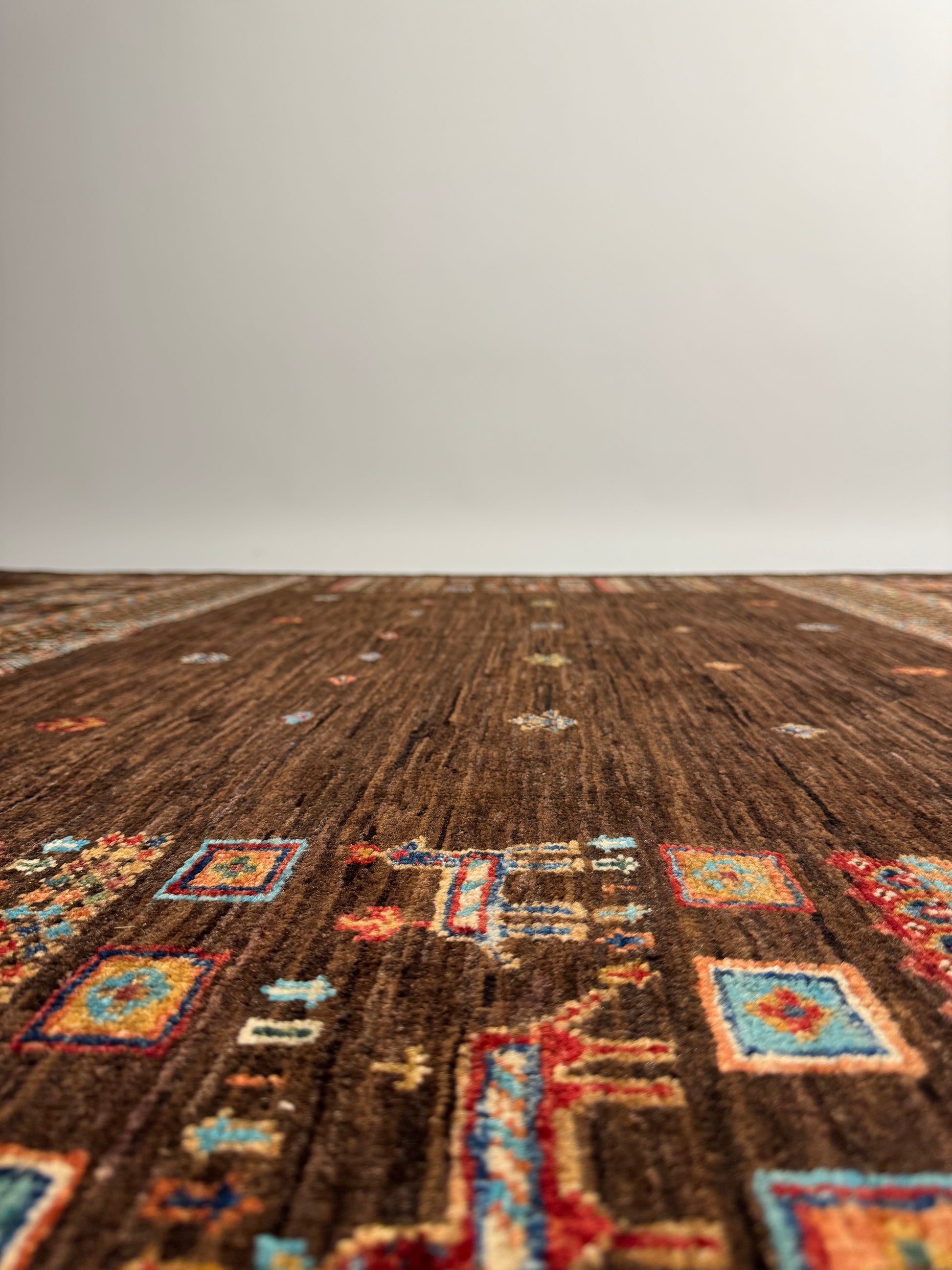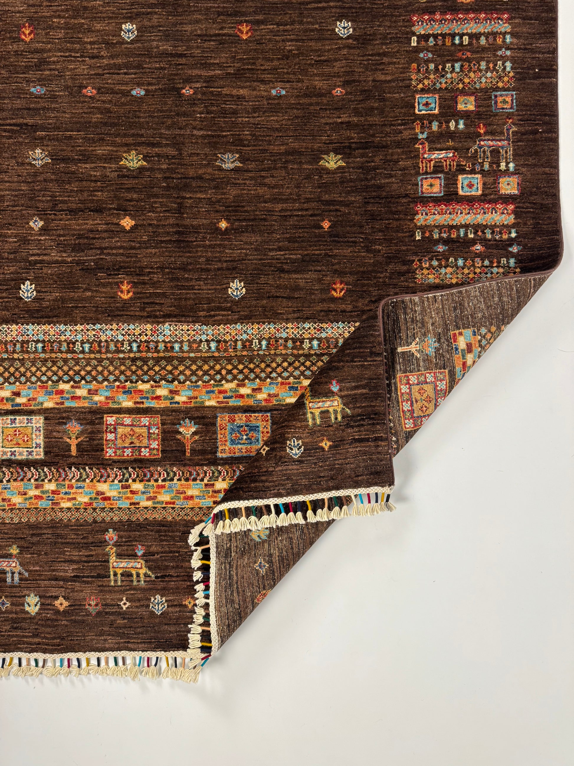 Imperium Serisi’nin I-0006 kodlu el dokuma halısı, koyu kahverengi zemin üzerine işlenen sembolik figürler ve motiflerle dikkat çeker. Üst ve yan kısımlarda yer alan hayvan figürleri, çiçek desenleri ve geometrik bordürler halıya özgün bir karakter kazandırır. Boşluklarla süslenen orta alan ise hem sade hem de güçlü bir görsel denge yaratır.