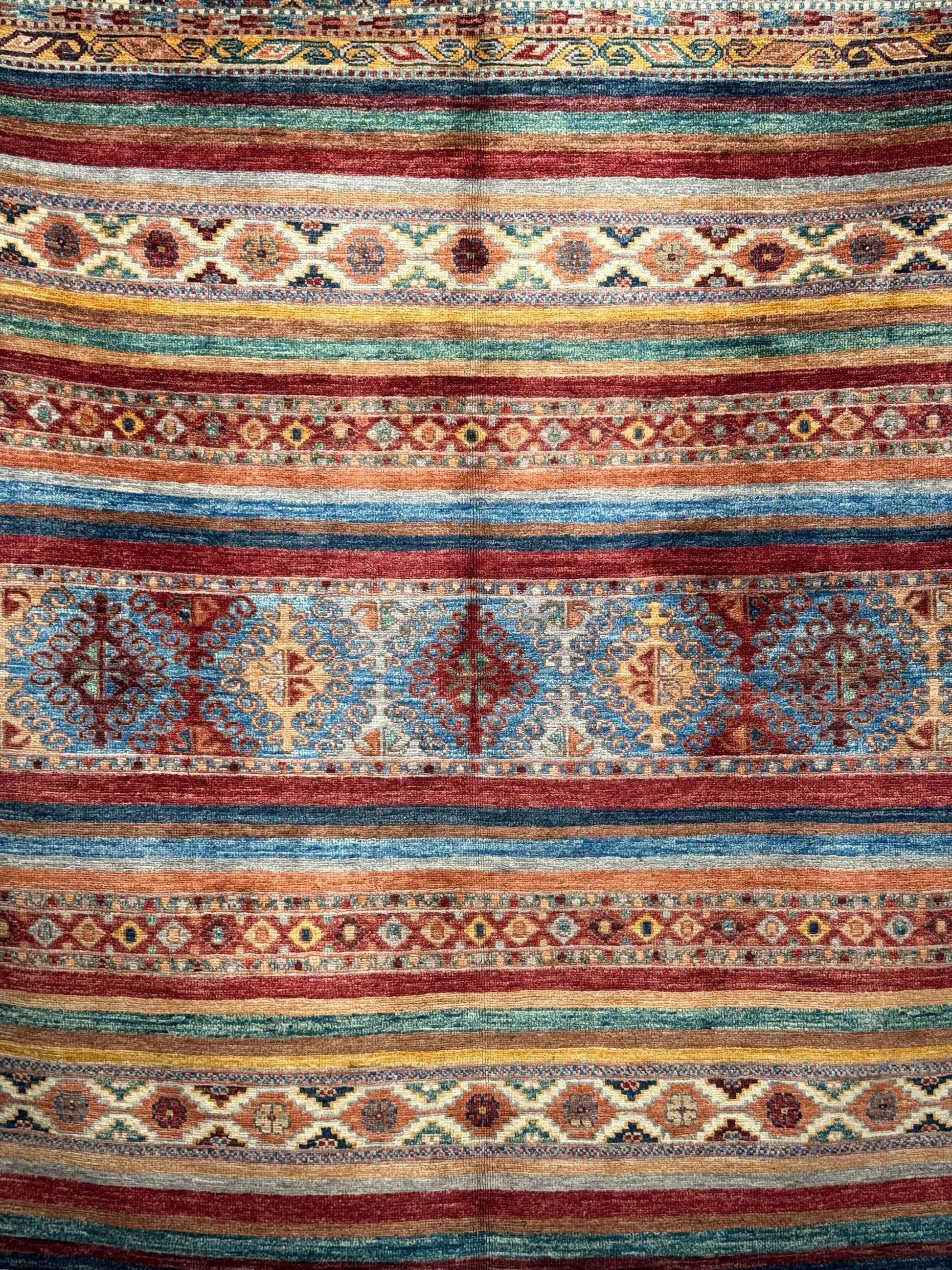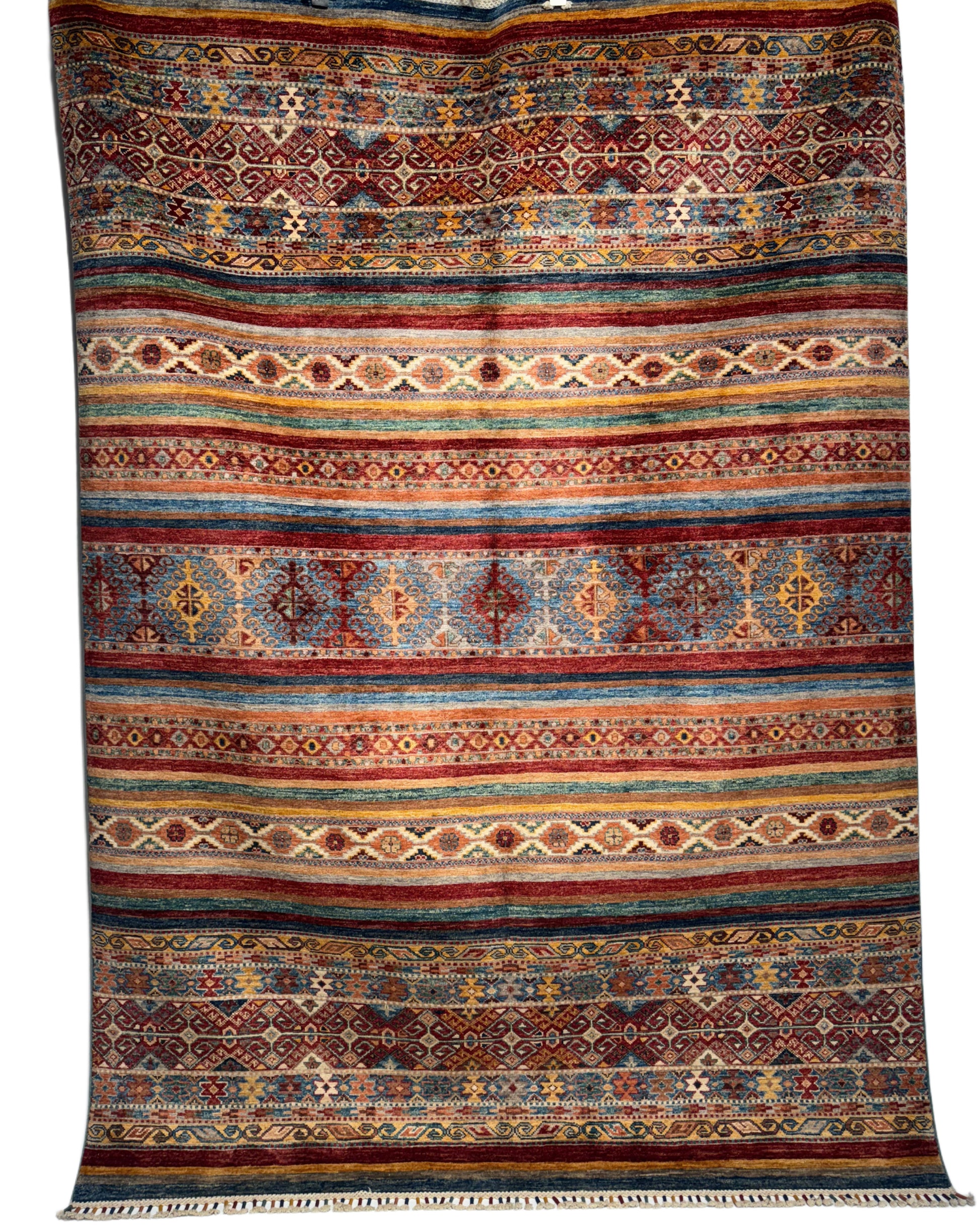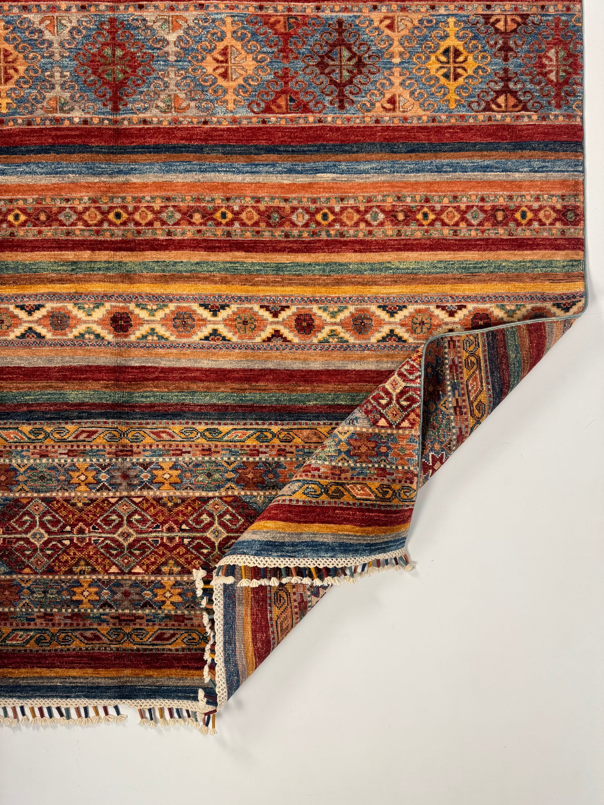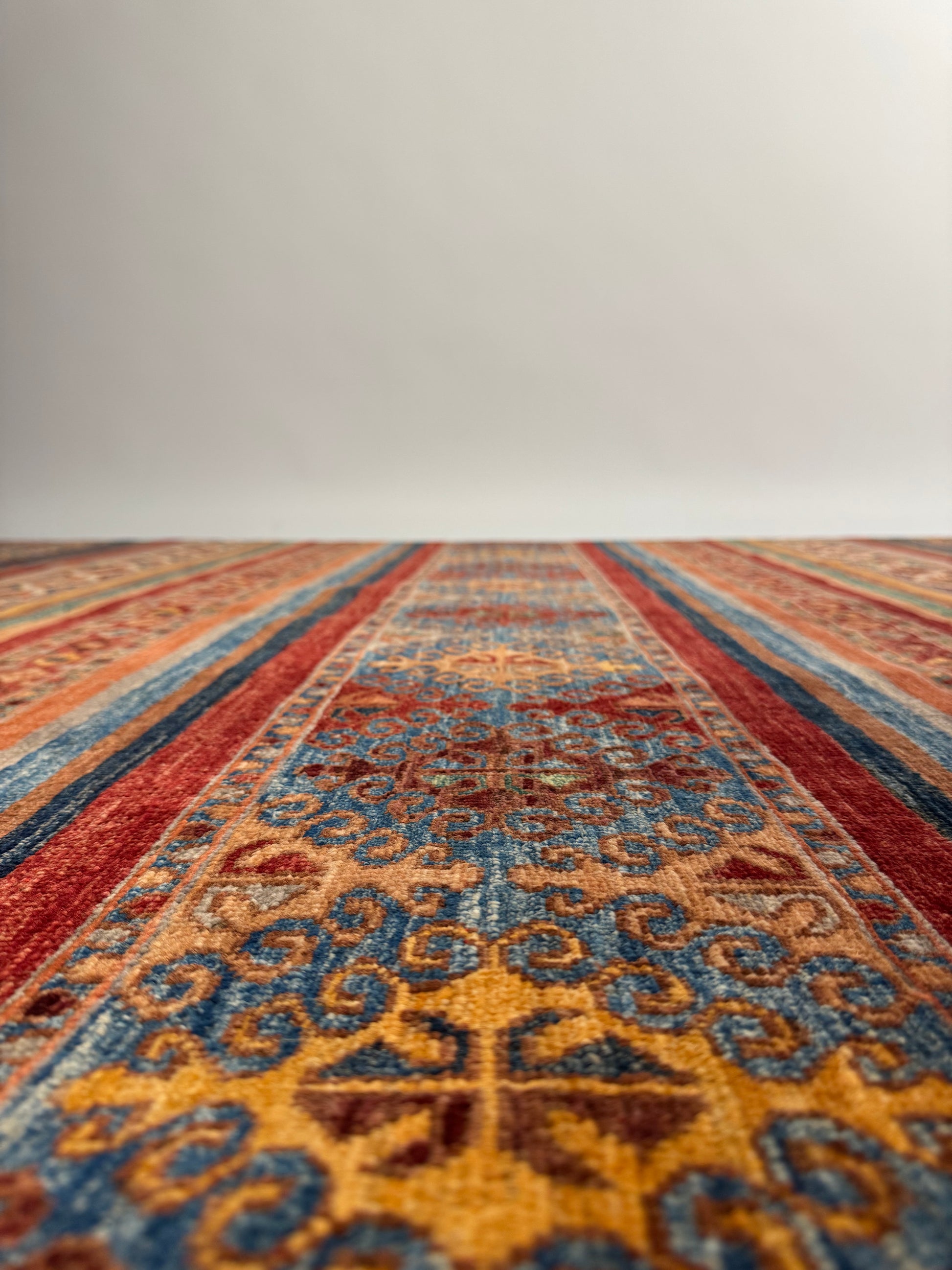 Imperium Serisi’nin I-0007 kodlu el dokuma halısı, güçlü renk paleti ve yatay şerit desenleriyle öne çıkar. Bordo, mavi, sarı ve yeşil tonlarının dengeli birleşimi, halıya hareketli ve canlı bir görünüm kazandırır. İç içe geçmiş geometrik motifler ve elmas desenler, Anadolu’nun zengin kültürel mirasını yansıtır.