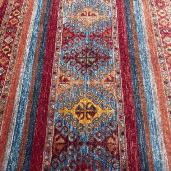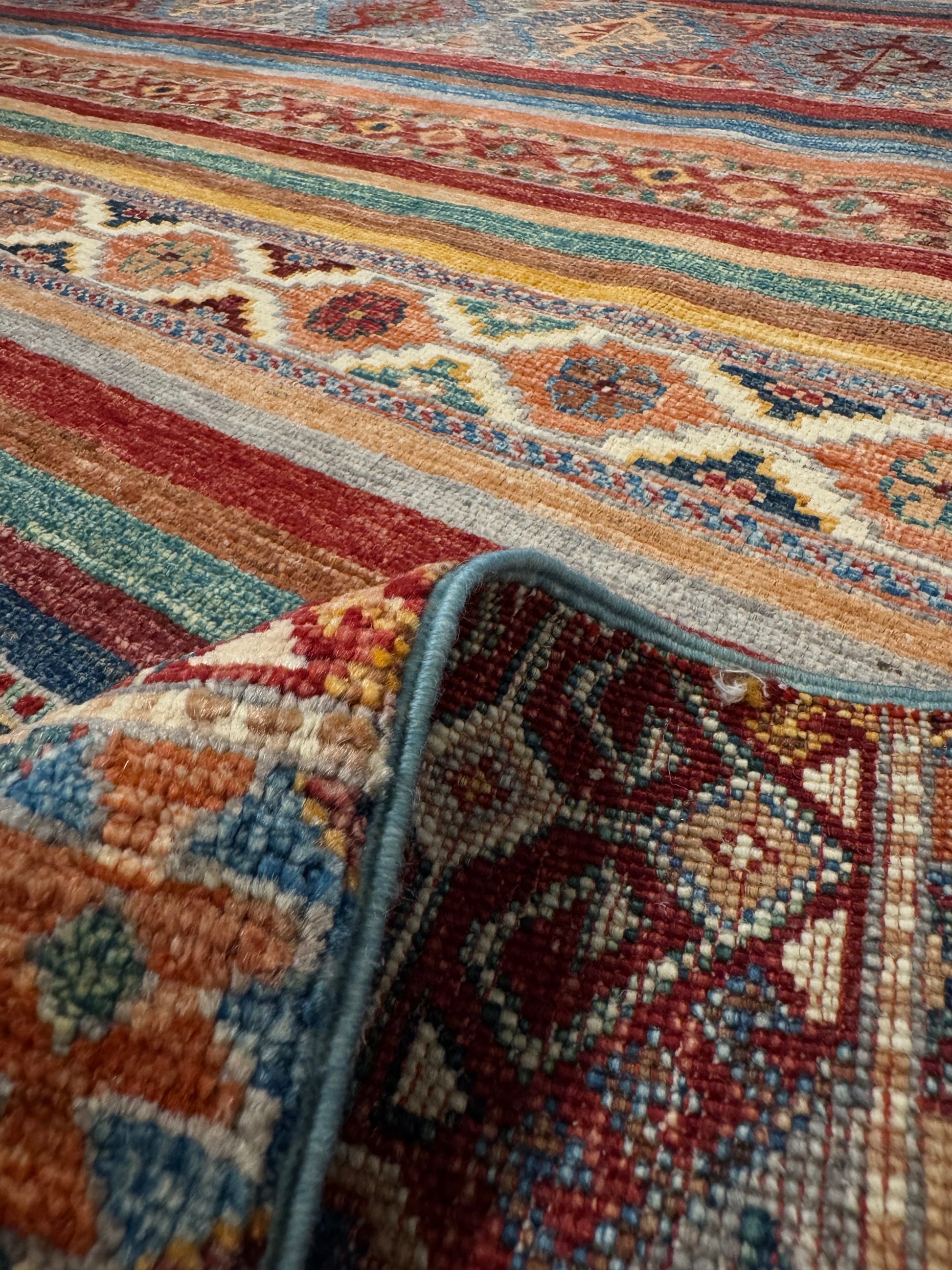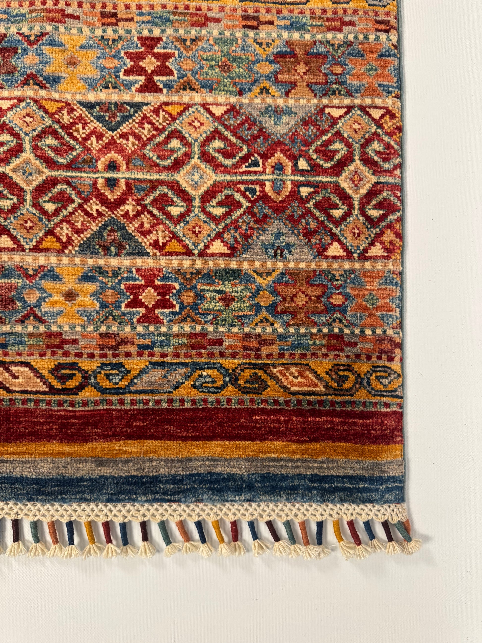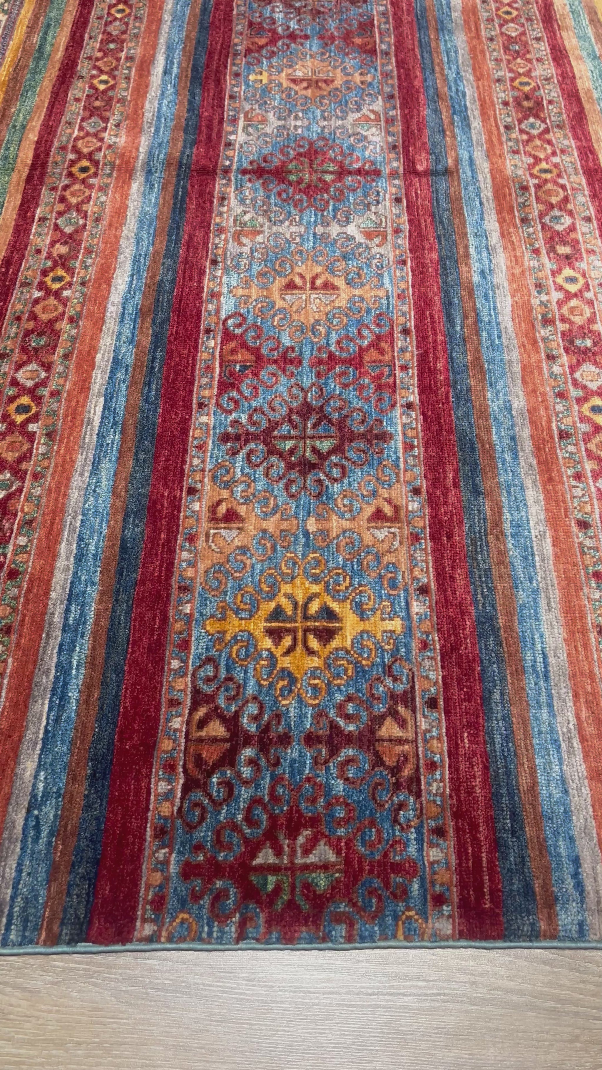 Imperium Serisi’nin I-0007 kodlu el dokuma halısı, güçlü renk paleti ve yatay şerit desenleriyle öne çıkar. Bordo, mavi, sarı ve yeşil tonlarının dengeli birleşimi, halıya hareketli ve canlı bir görünüm kazandırır. İç içe geçmiş geometrik motifler ve elmas desenler, Anadolu’nun zengin kültürel mirasını yansıtır.