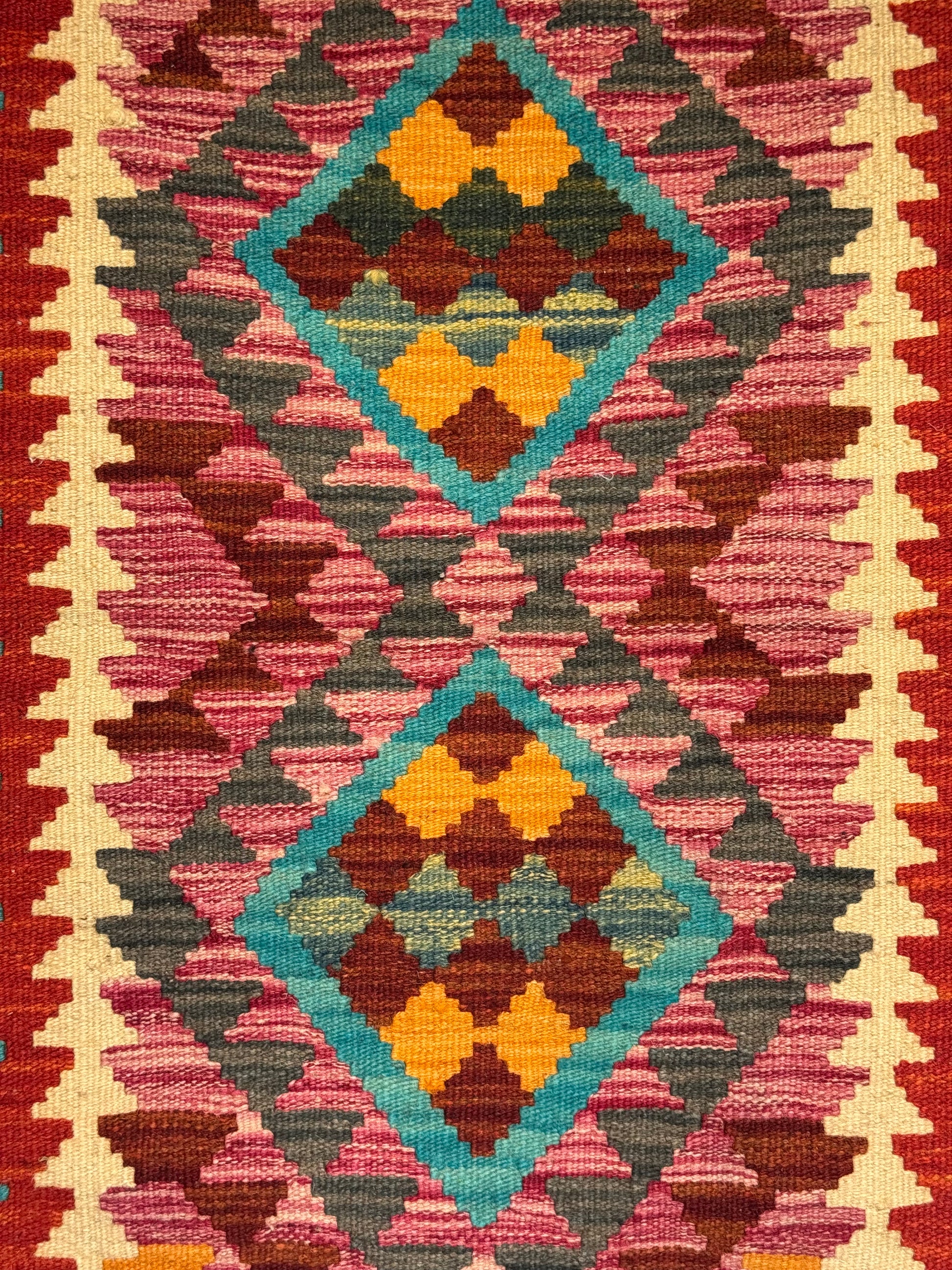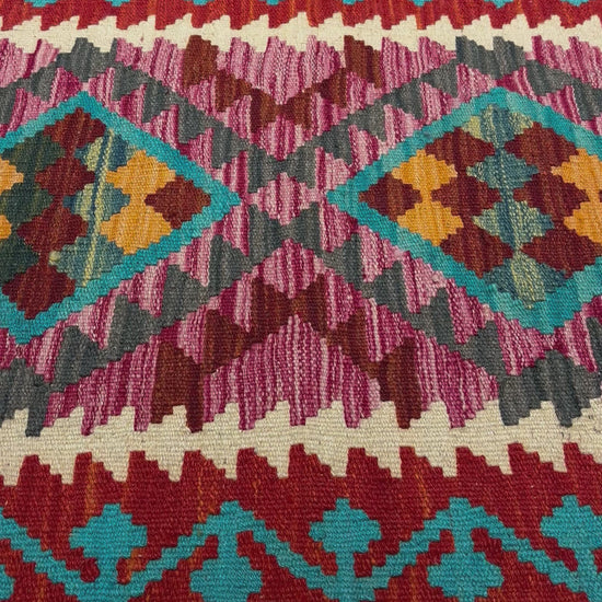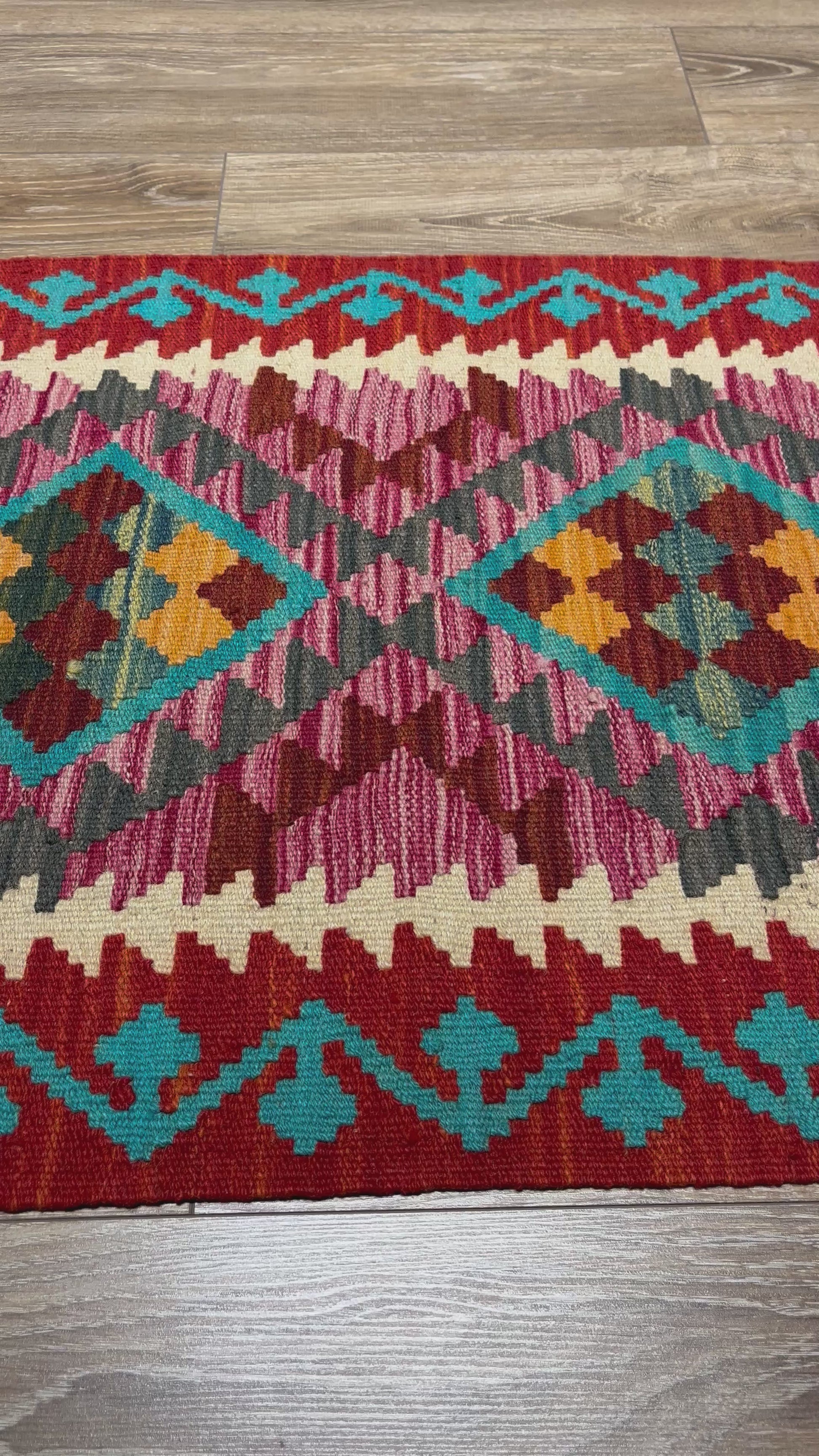 El Dokuma Kırmızı-Turkuaz Küçük Kilim – Etnik Desenli Dekoratif Otantik Halı (0.61 x 0.94 m) | Nomad Glow Serisi NG-0007