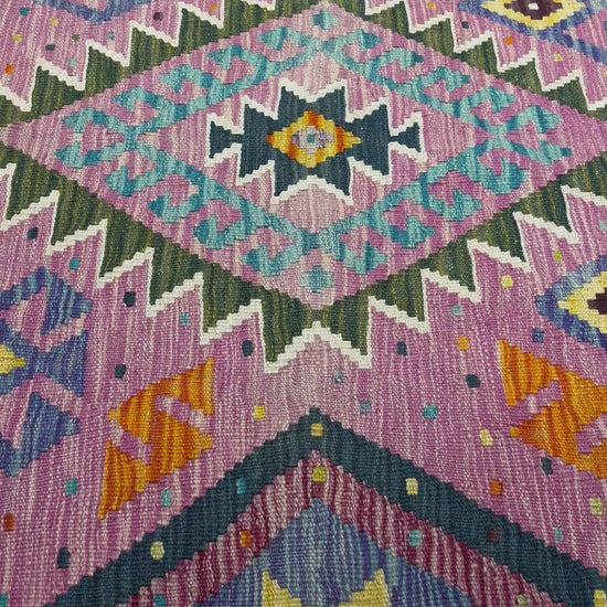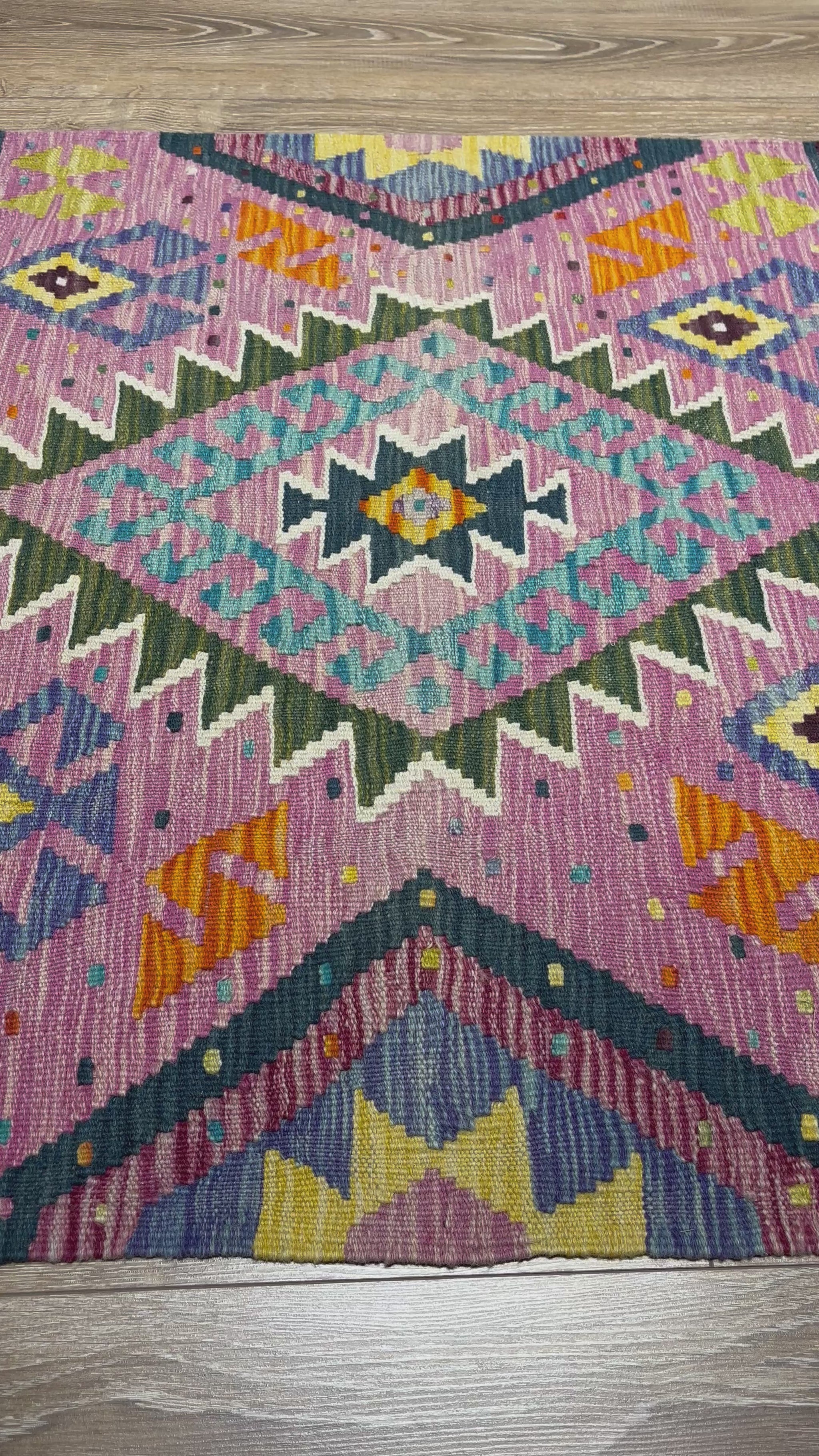Nomad Glow El Dokuma Kilim – Pembe Zemin Çok Renkli Geometrik Otantik Kilim (0.88 x 1.23 m) | NG-0021