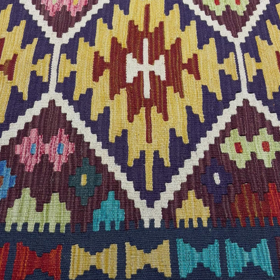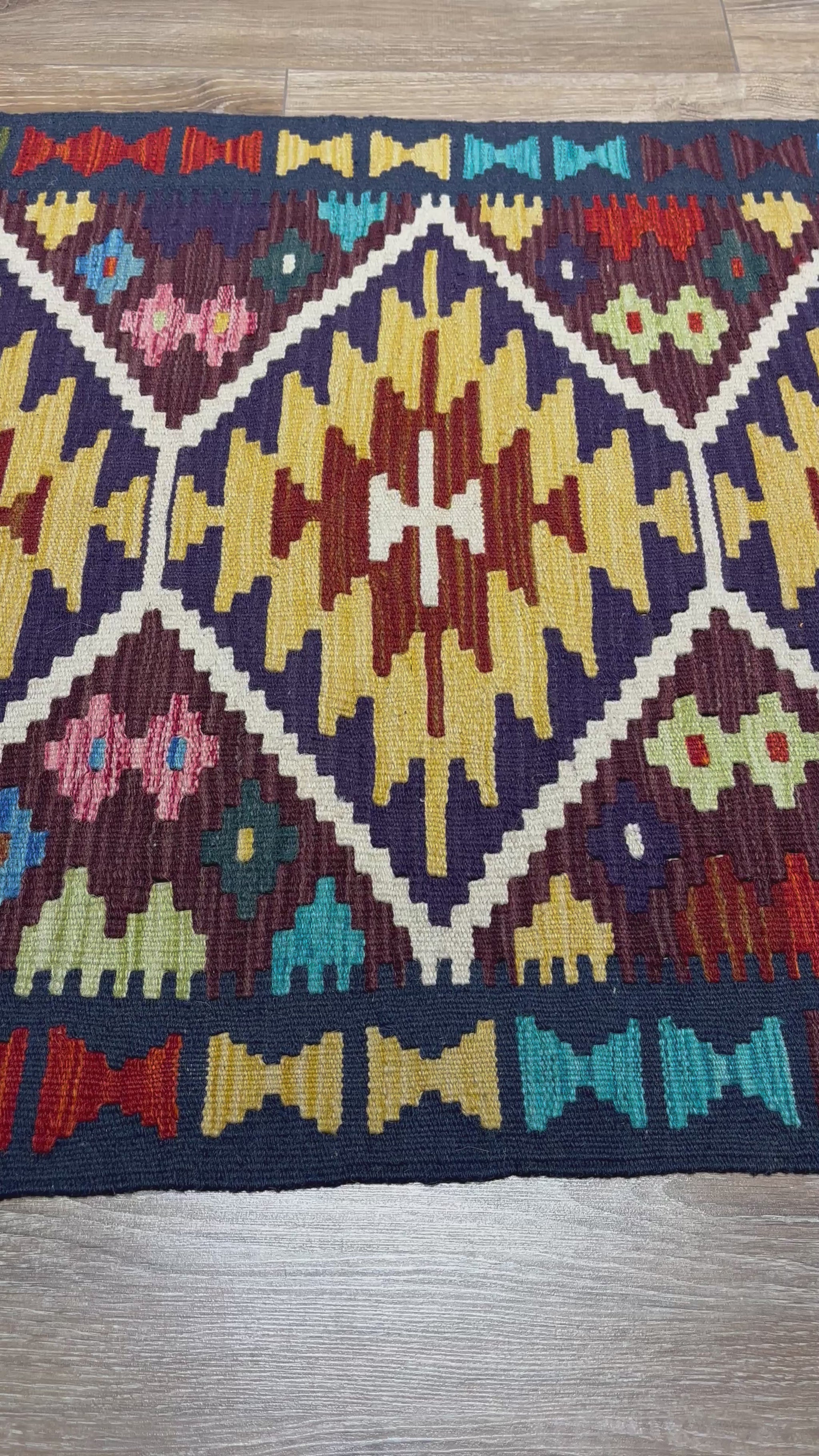 Nomad Glow El Dokuma Kilim – Sarı Kırmızı Lacivert Geometrik Desenli Otantik Kilim (0.78 x 1.22 m) | NG-0018