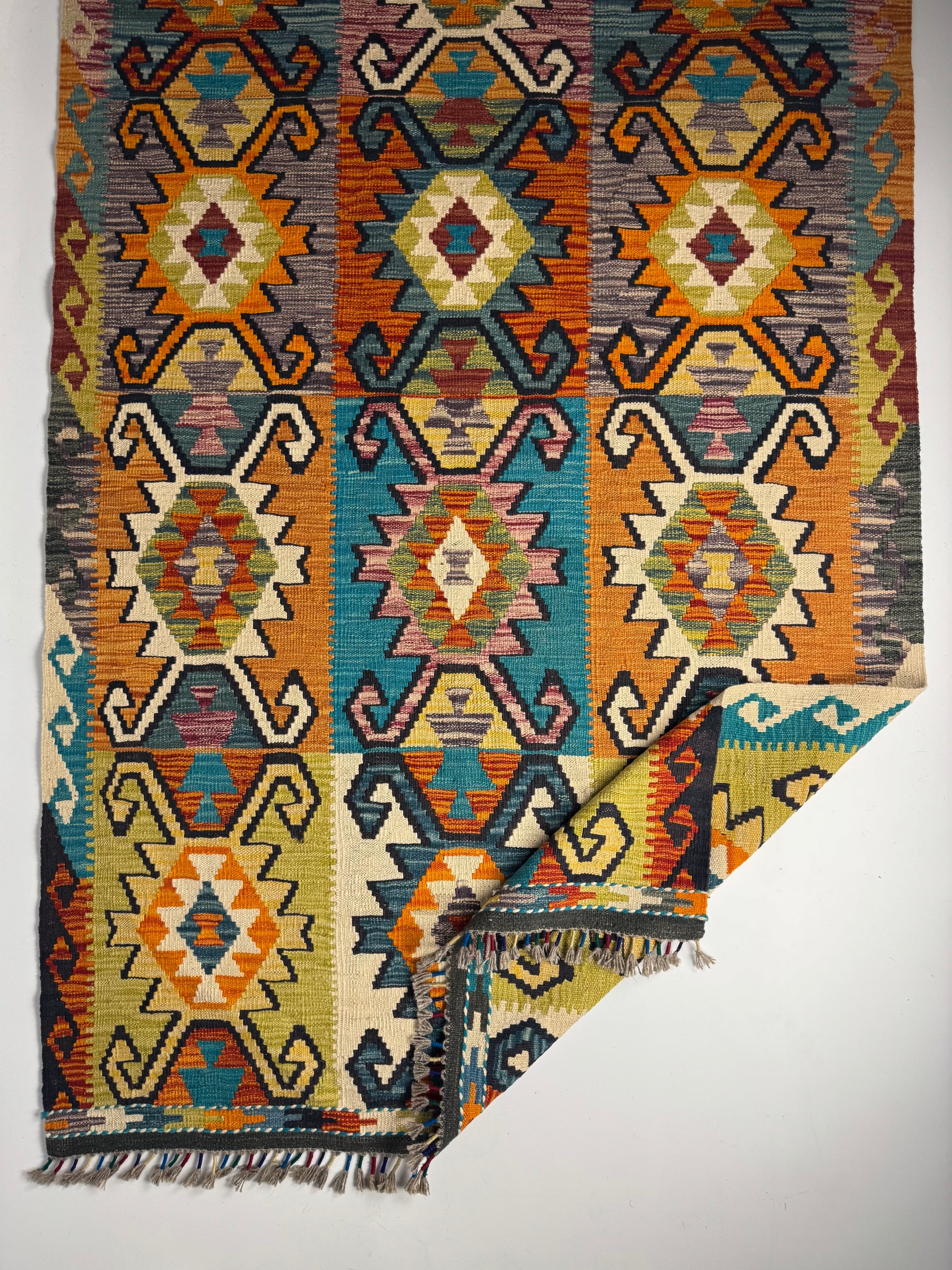 Nomad Glow El Dokuma Kilim – Sarı Zeminli Canlı Geometrik Desenli Otantik Kilim (1.29 x 2.02 m) | NG-0025