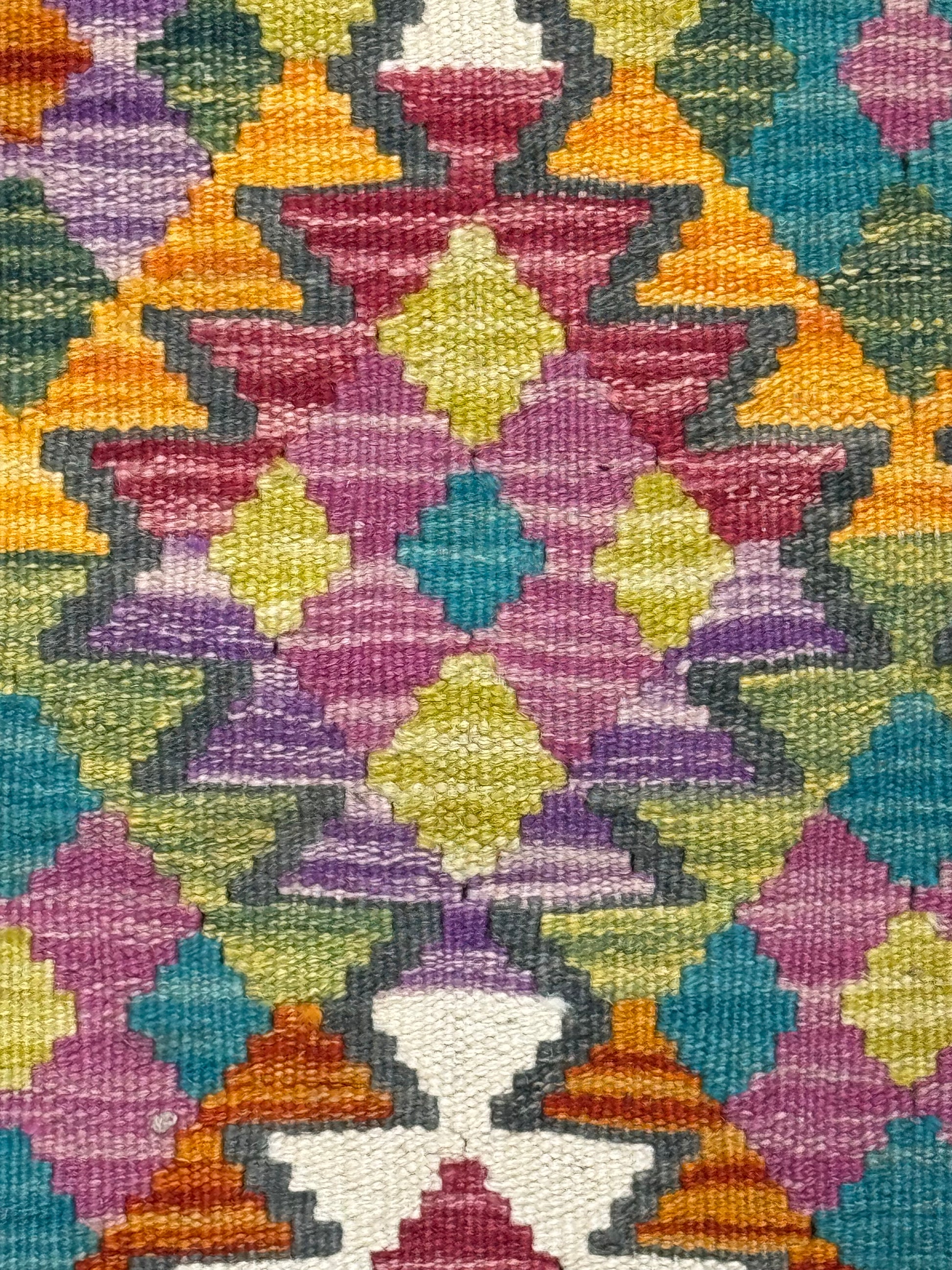 Nomad Glow serisinin NG-0020 kodlu bu el dokuma kilimi, turuncu zemin üzerinde sarı, yeşil, pembe, mor ve mavi tonlarının birleştiği zengin geometrik desenlere sahiptir. Göçebe kültürünün ruhunu yansıtan bu tasarım, canlı renkleri ve otantik dokusuyla yaşam alanlarınıza enerji katar. El emeğiyle dokunduğu için her bir parça kendine özgü bir karakter taşır.