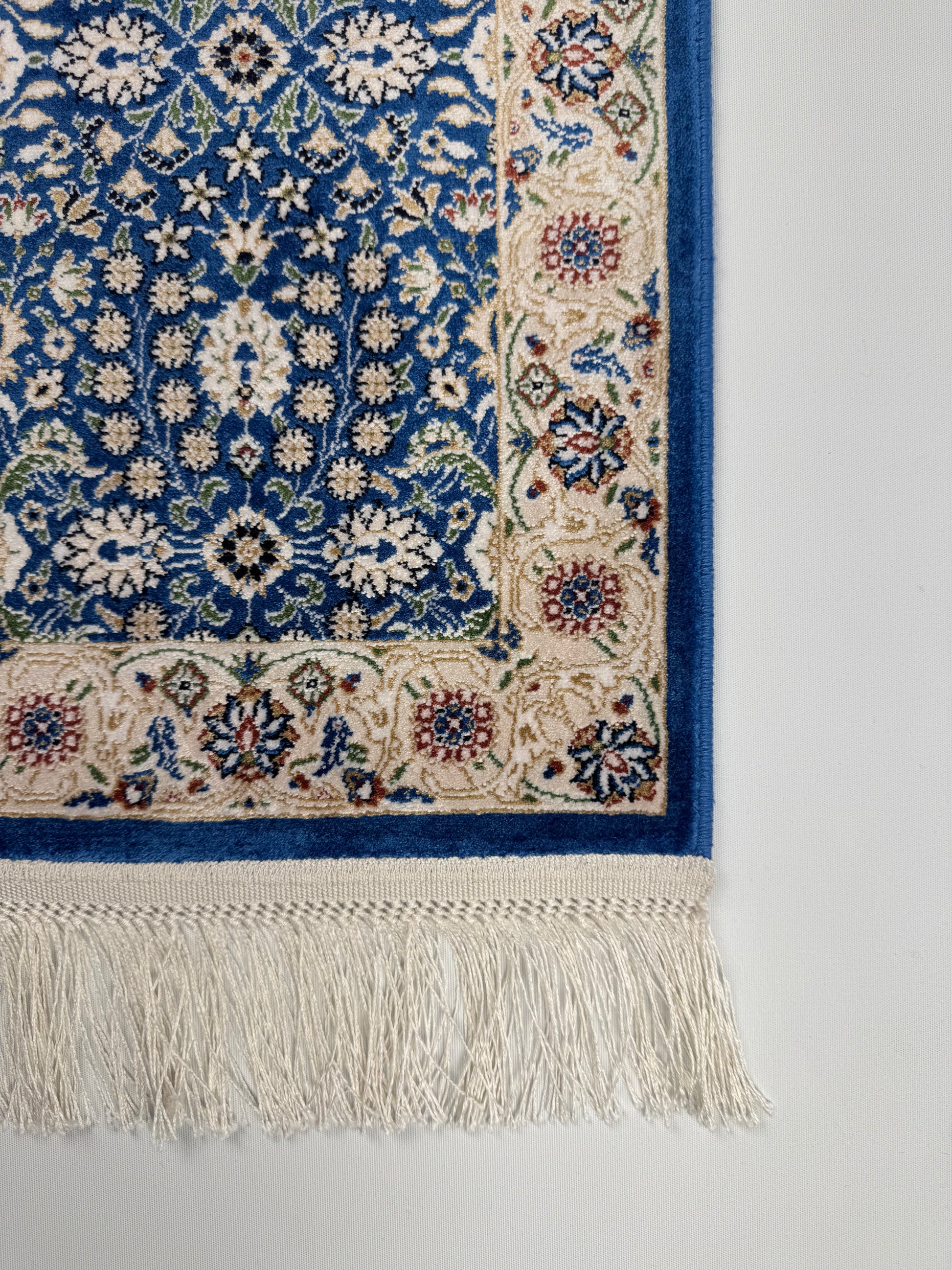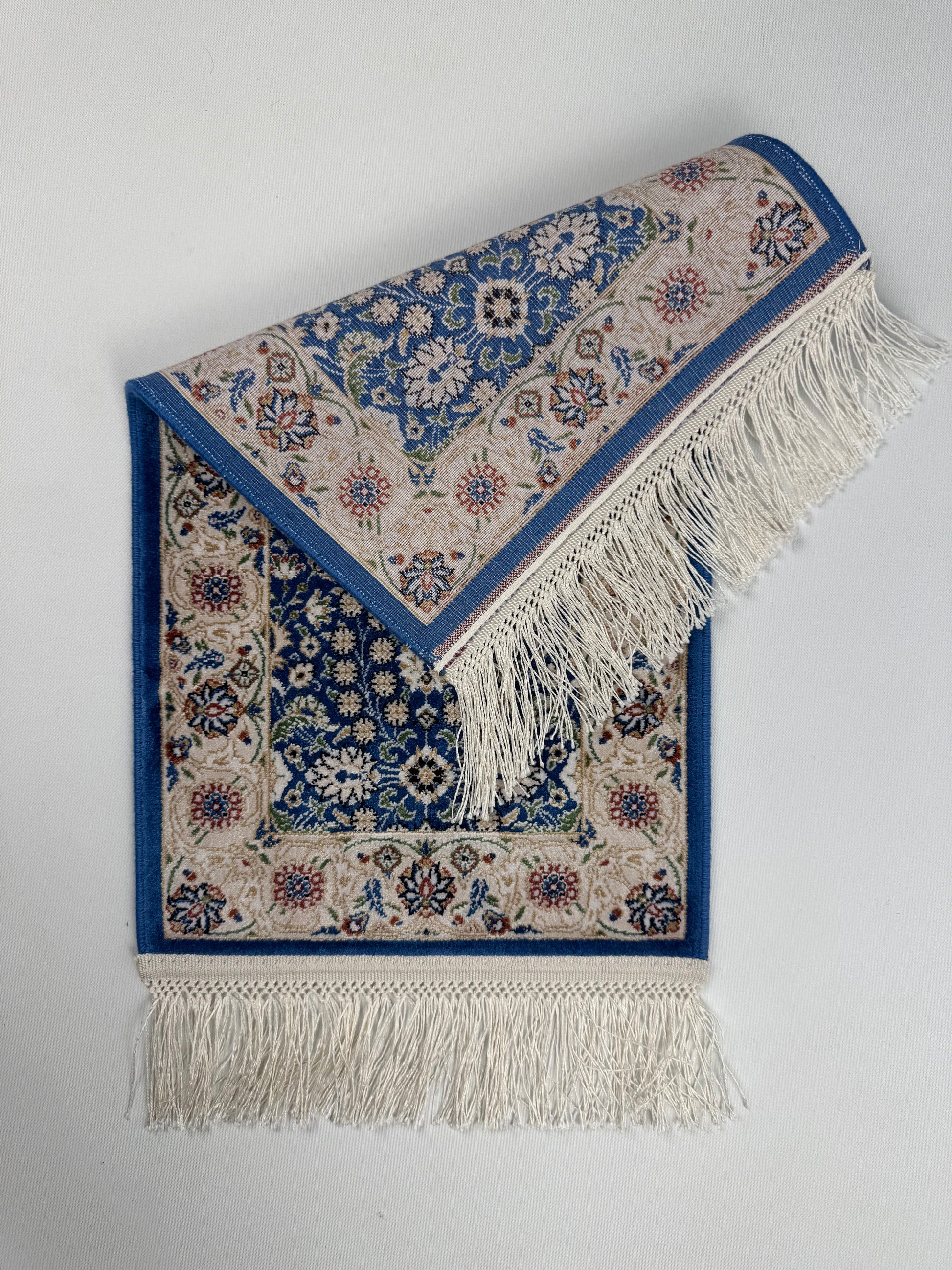 The SE-0002 rug from the Silken Echo mini collection reflects timeless elegance with its deep blue tones and delicate cream floral motifs. Its silky texture and intricate details bring sophistication to any space. Measuring (0.30×0.45 m), it is ideal for tabletops, coffee tables, or as a decorative wall accent.
