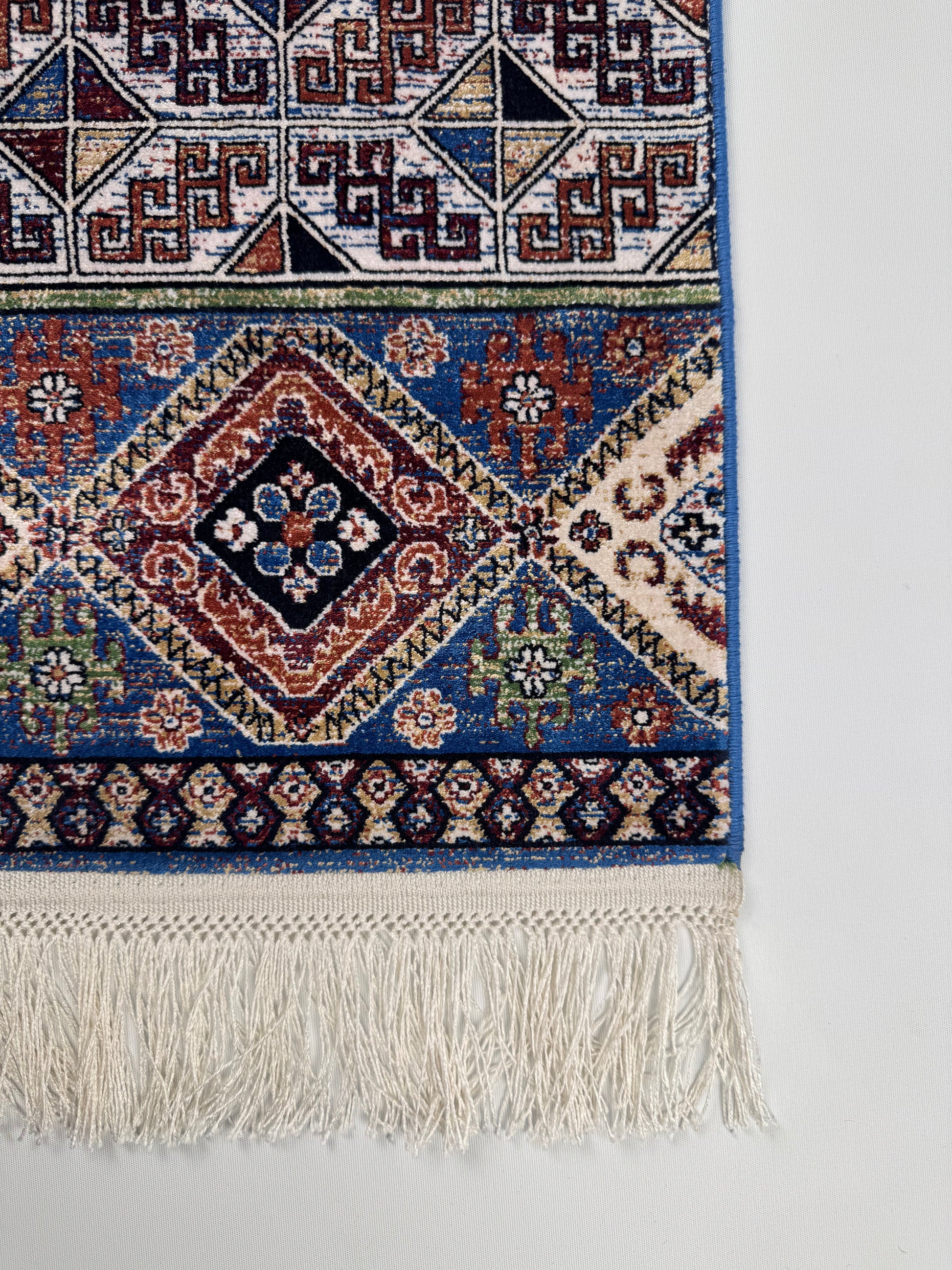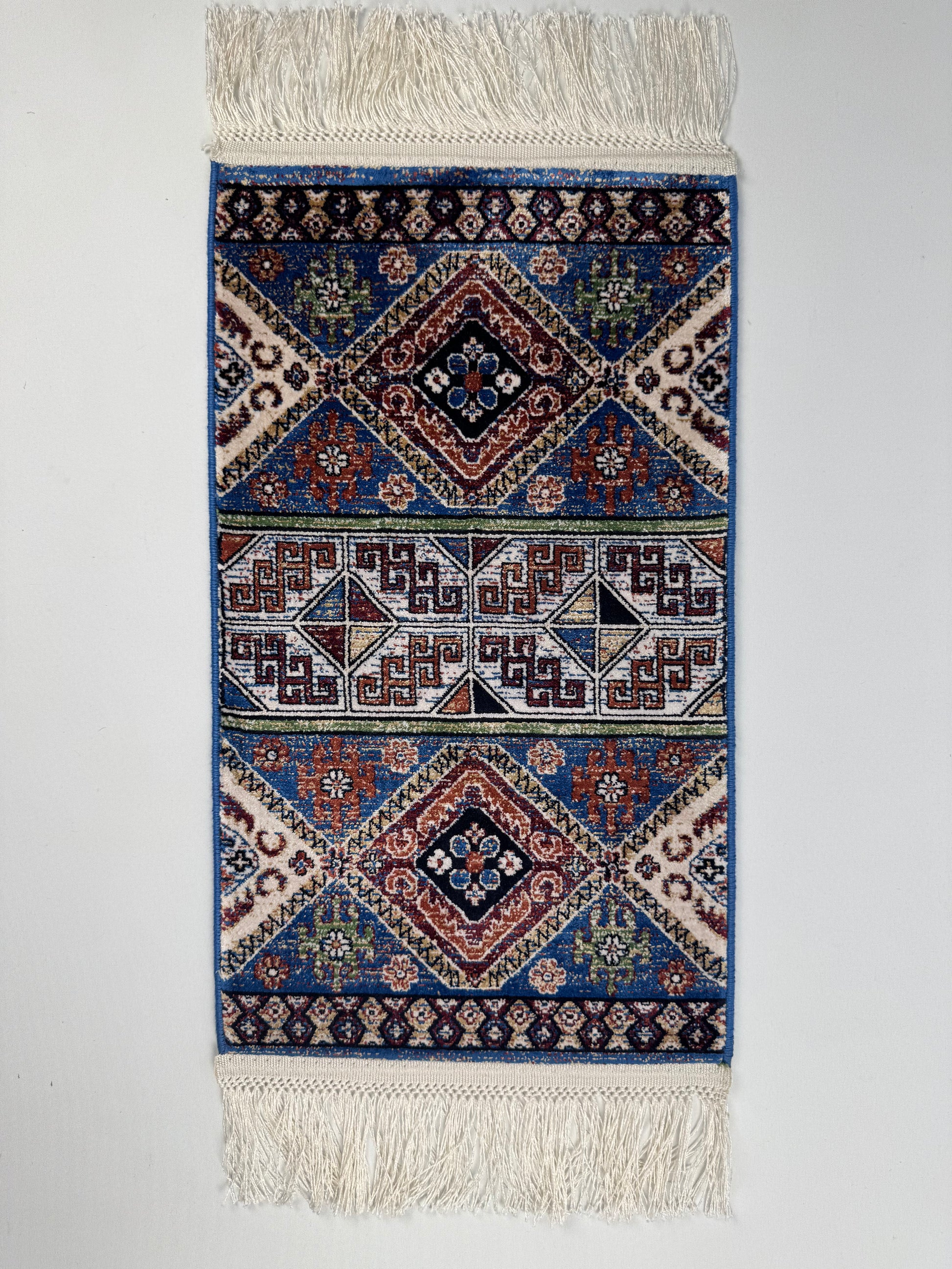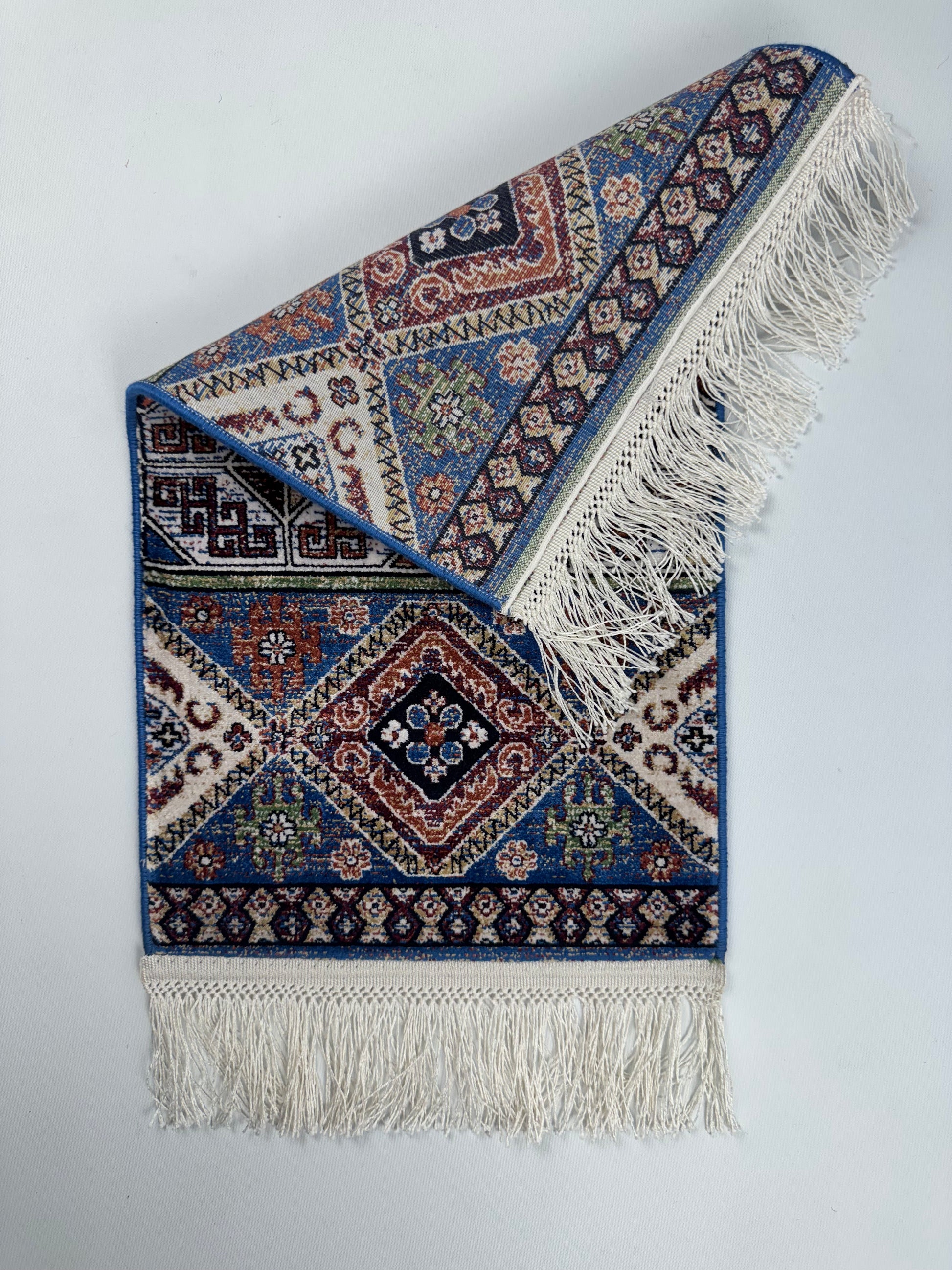 The SE-0007 rug from the Silken Echo mini collection blends bold geometric patterns with timeless ethnic motifs. The deep navy, burgundy, beige, and earthy hues create a sophisticated yet traditional look. At (0.30×0.45 m), it’s an ideal piece for accent décor, tabletop styling, or as a unique wall hanging.