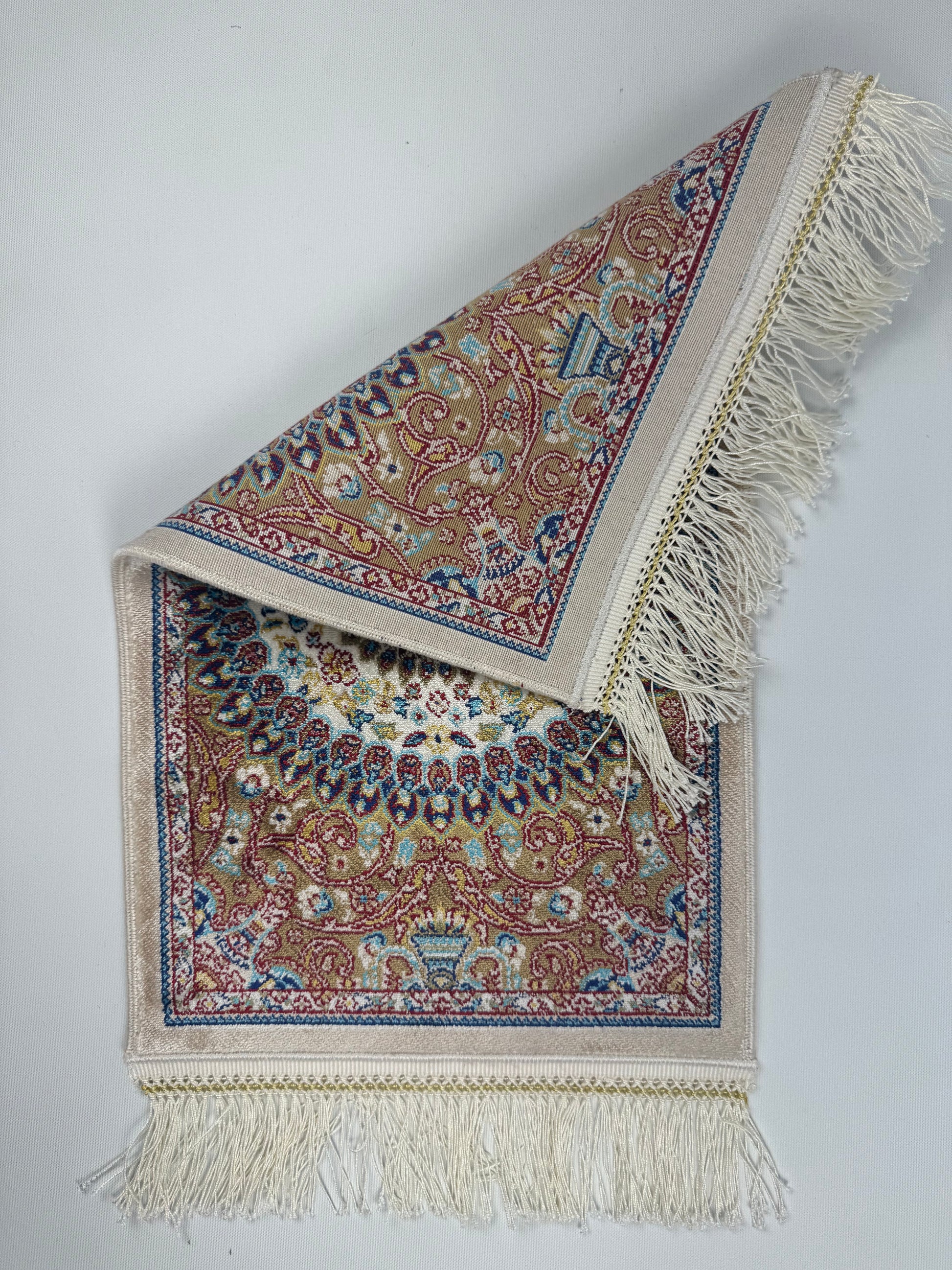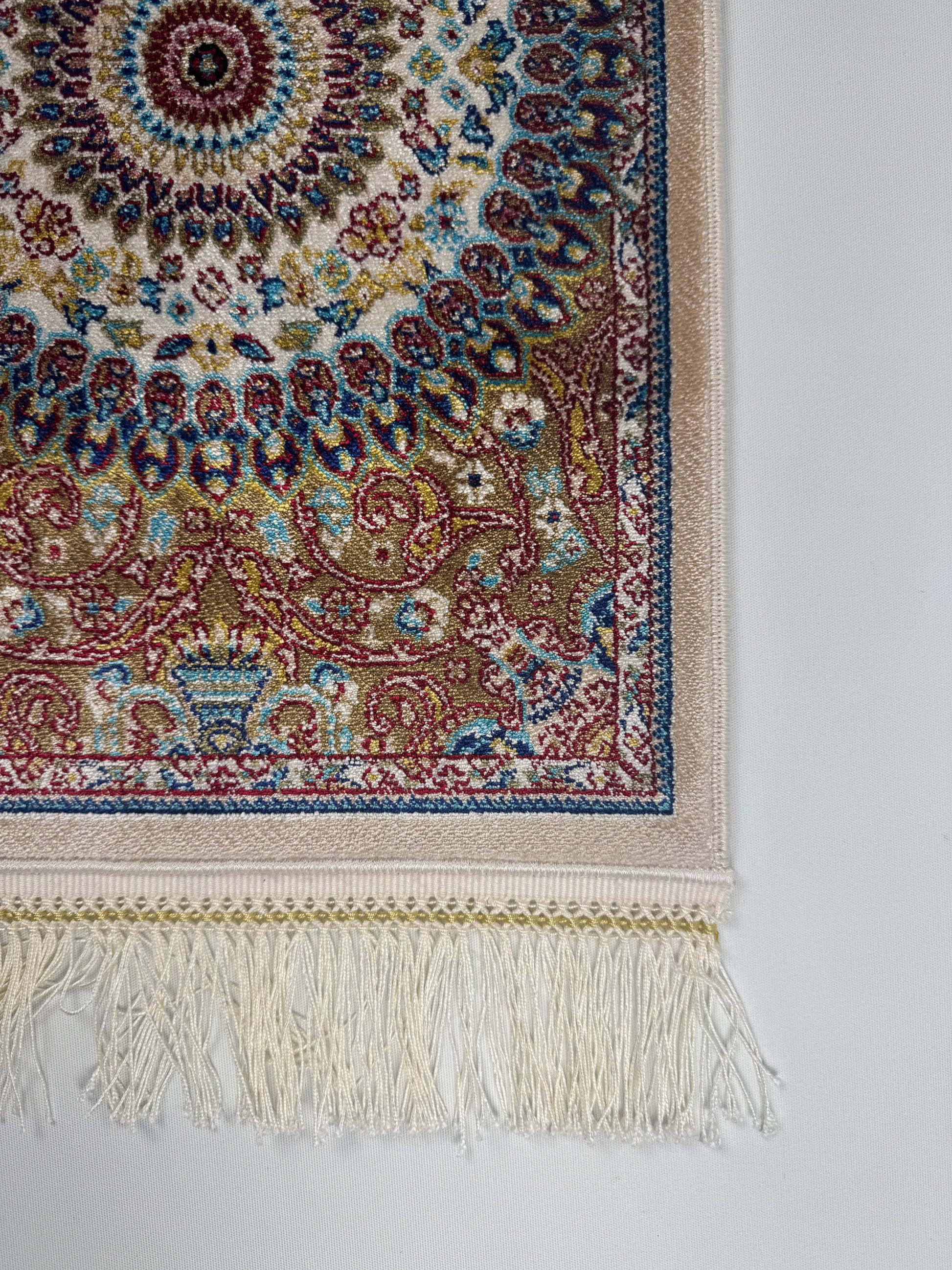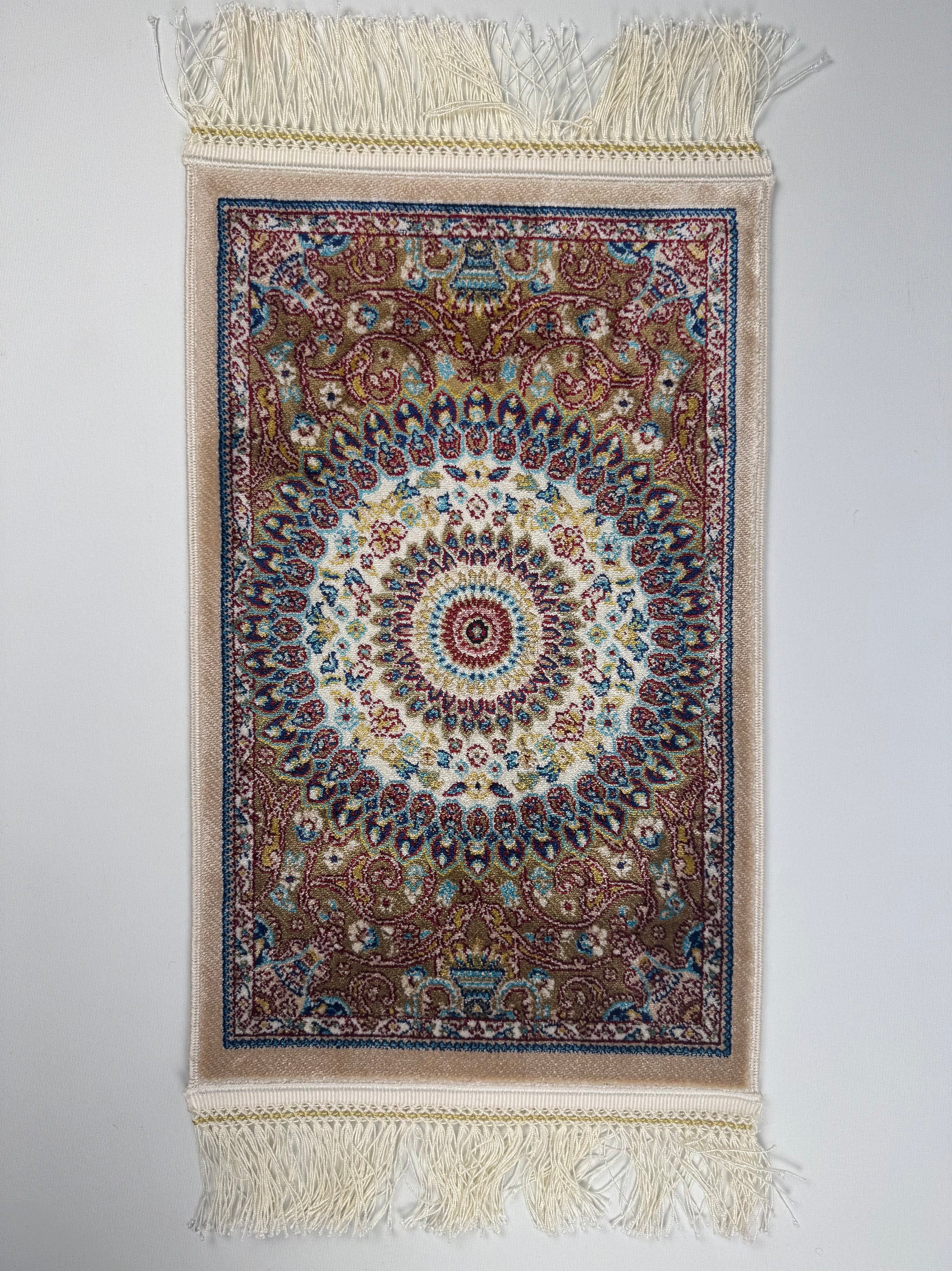 The SE-0015 rug from the Silken Echo mini collection showcases a mesmerizing mandala-inspired circular design. Crafted on a cream background with deep red, blue, and golden tones, its silky texture adds timeless elegance to both classic and modern interiors. With its compact size (0.30×0.45 m), it is perfect as a table accent, console piece, or decorative wall art.