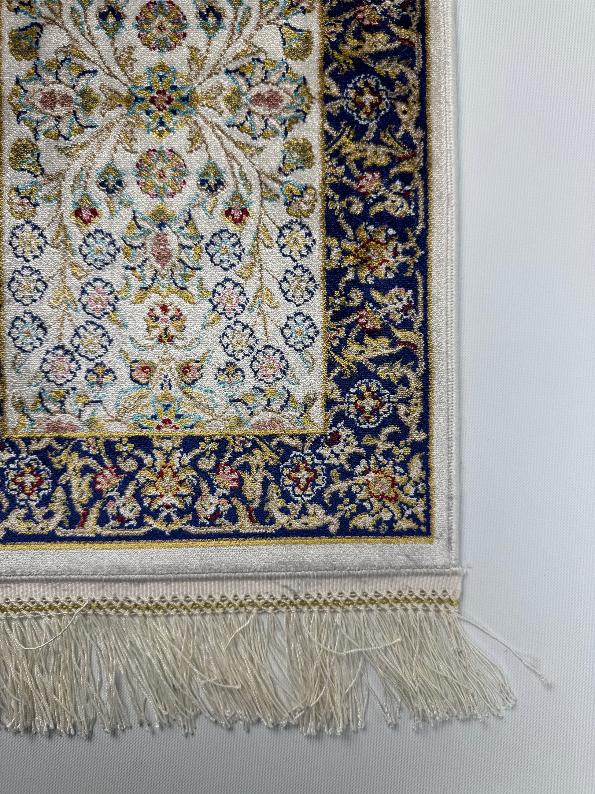 The SE-0016 rug from the Silken Echo mini collection combines delicate floral motifs on a cream base with a rich blue border. Golden and pastel tones create a sophisticated harmony, enhanced by its silky texture. With its compact size (0.30×0.45 m), it is perfect for table styling, consoles, or as wall art.