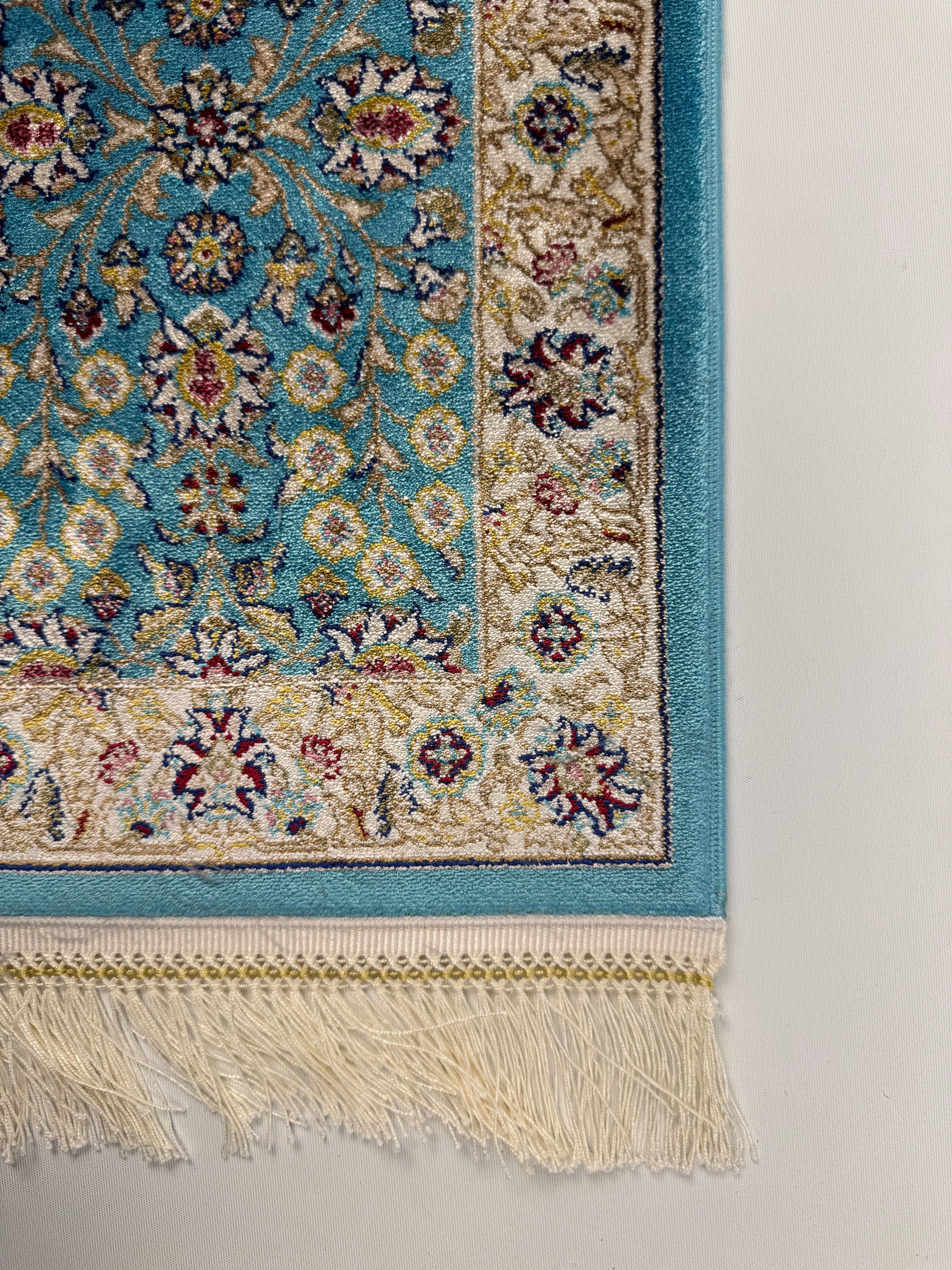 Silken Echo mini koleksiyonunun SE-0019 kodlu halısı, canlı turkuaz zemini ve çiçek motifleriyle göz alıcı bir zarafet sunar. Altın, krem ve bordo detaylarla işlenen bordürü, klasik dokuyu modern ipeksi parlaklıkla buluşturur. Parlak ve yumuşak yüzeyi sayesinde dekoratif kullanım için idealdir. (0.30×0.45 m) ölçüsüyle masa, konsol ya da duvar dekorasyonu için mükemmel bir seçimdir.