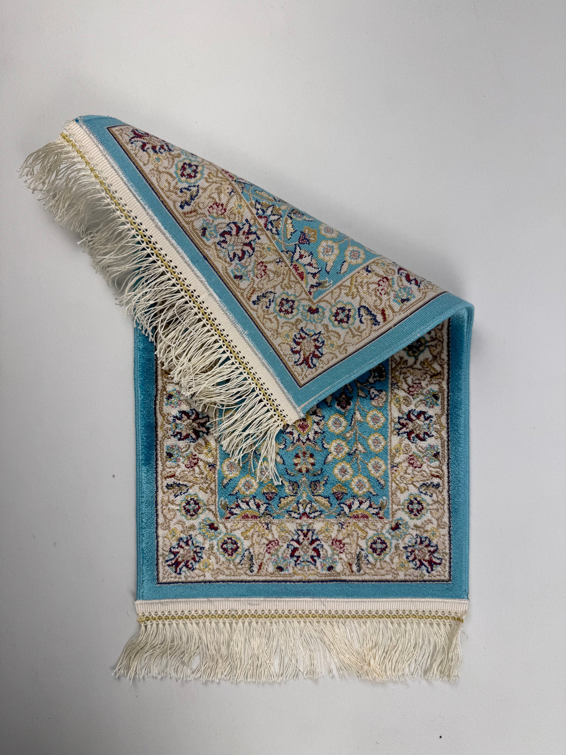 The SE-0019 rug from the Silken Echo mini collection features a vivid turquoise base with elegant floral motifs, framed by gold, cream, and burgundy details. Its silky smooth finish highlights timeless craftsmanship, making it an ideal accent for tables, consoles, or as a unique wall piece. Compact size (0.30×0.45 m) ensures versatile decorative use.