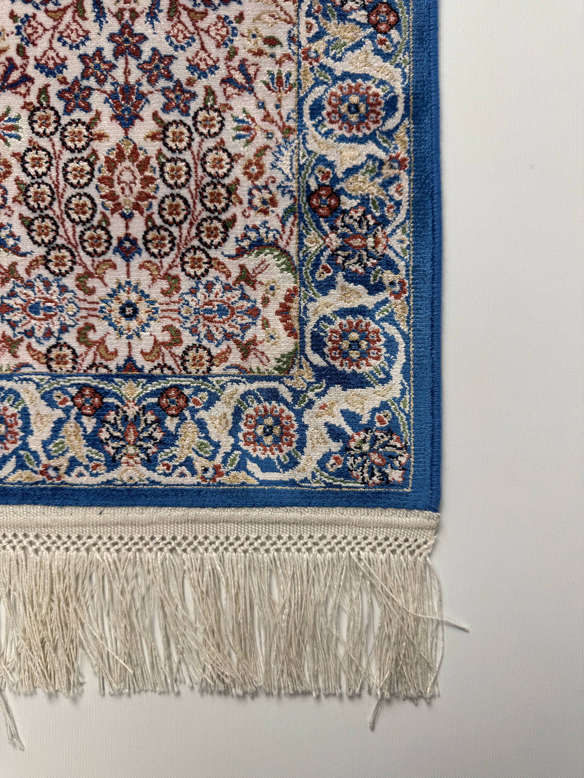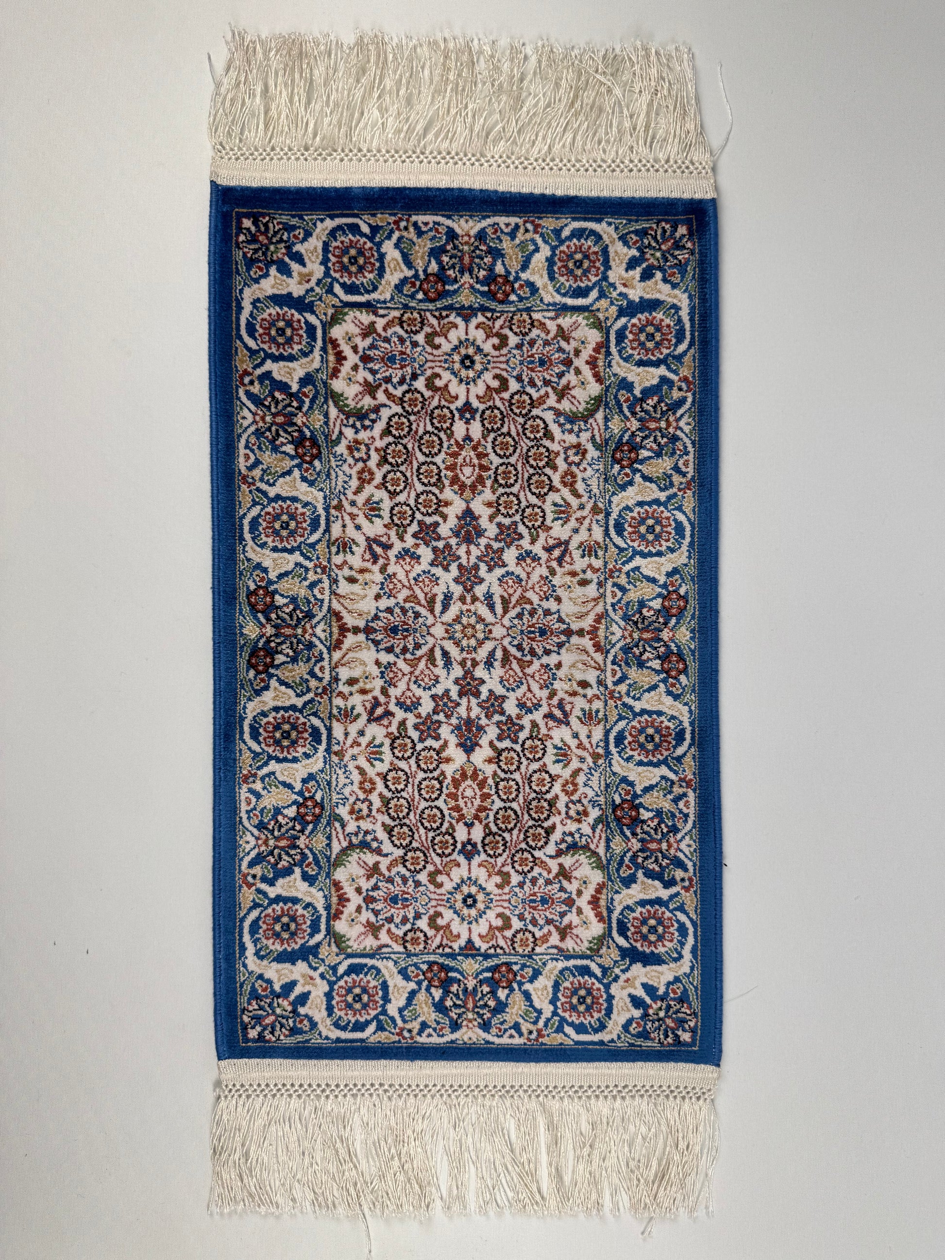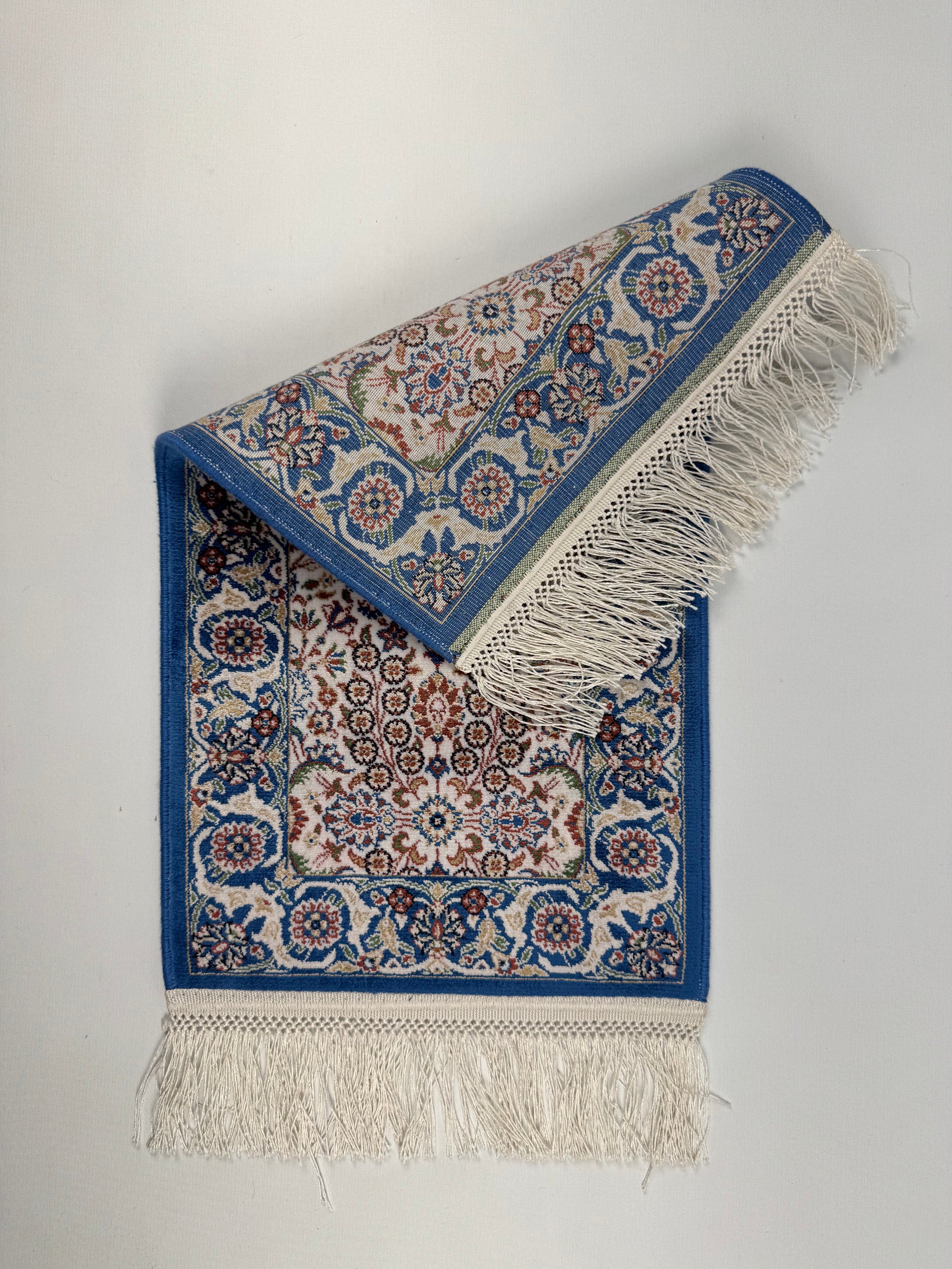 The SE-0020 model from the Silken Echo mini collection features elegant floral motifs on a cream base framed by a rich blue border. Its silky texture and luminous finish make it both a decorative and collectible piece. With its compact size (0.30×0.45 m), it fits perfectly on tables, consoles, or as a wall accent.