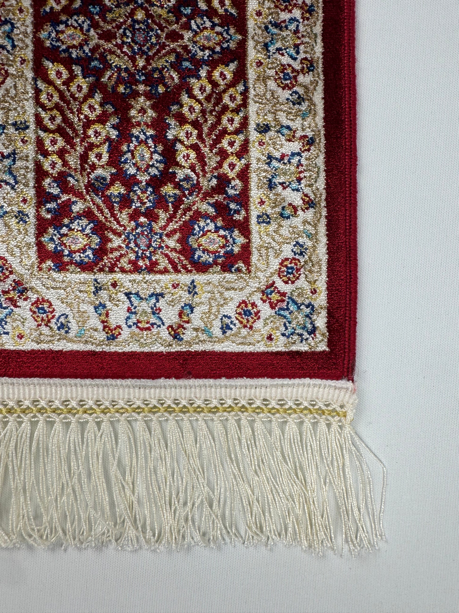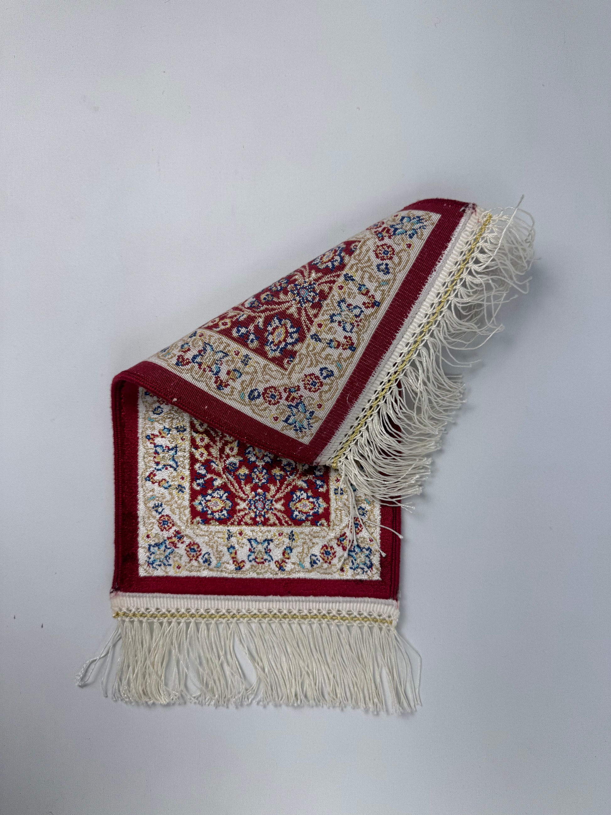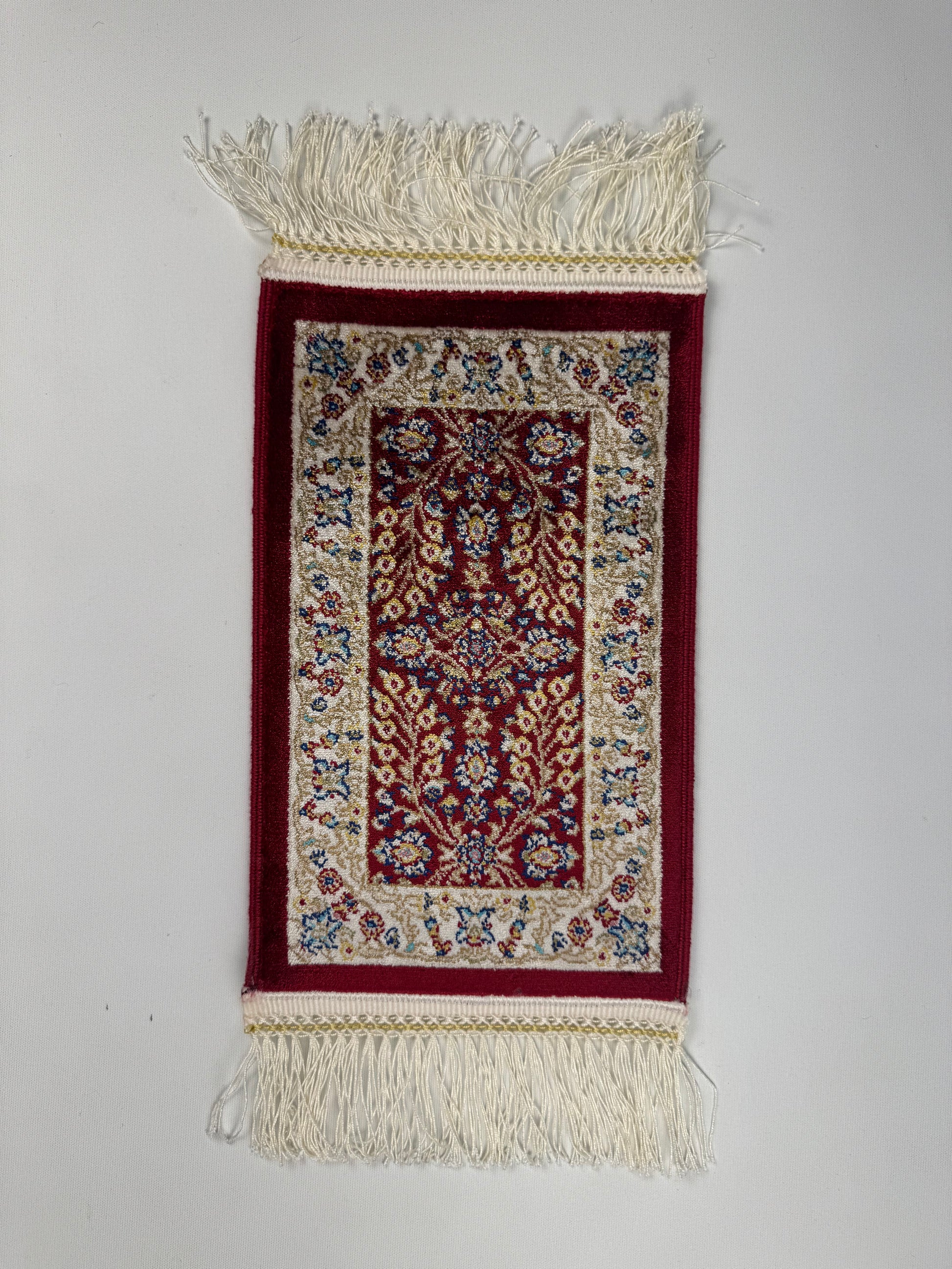 This Silken Echo mini rug (SE-0022) showcases elegant floral motifs on a deep red background, creating a refined and timeless look. With its silky shine and compact size (0.2×0.3 m), it is ideal for use as a decorative collectible piece for tables, shelves, or walls. A perfect accent to elevate any interior.