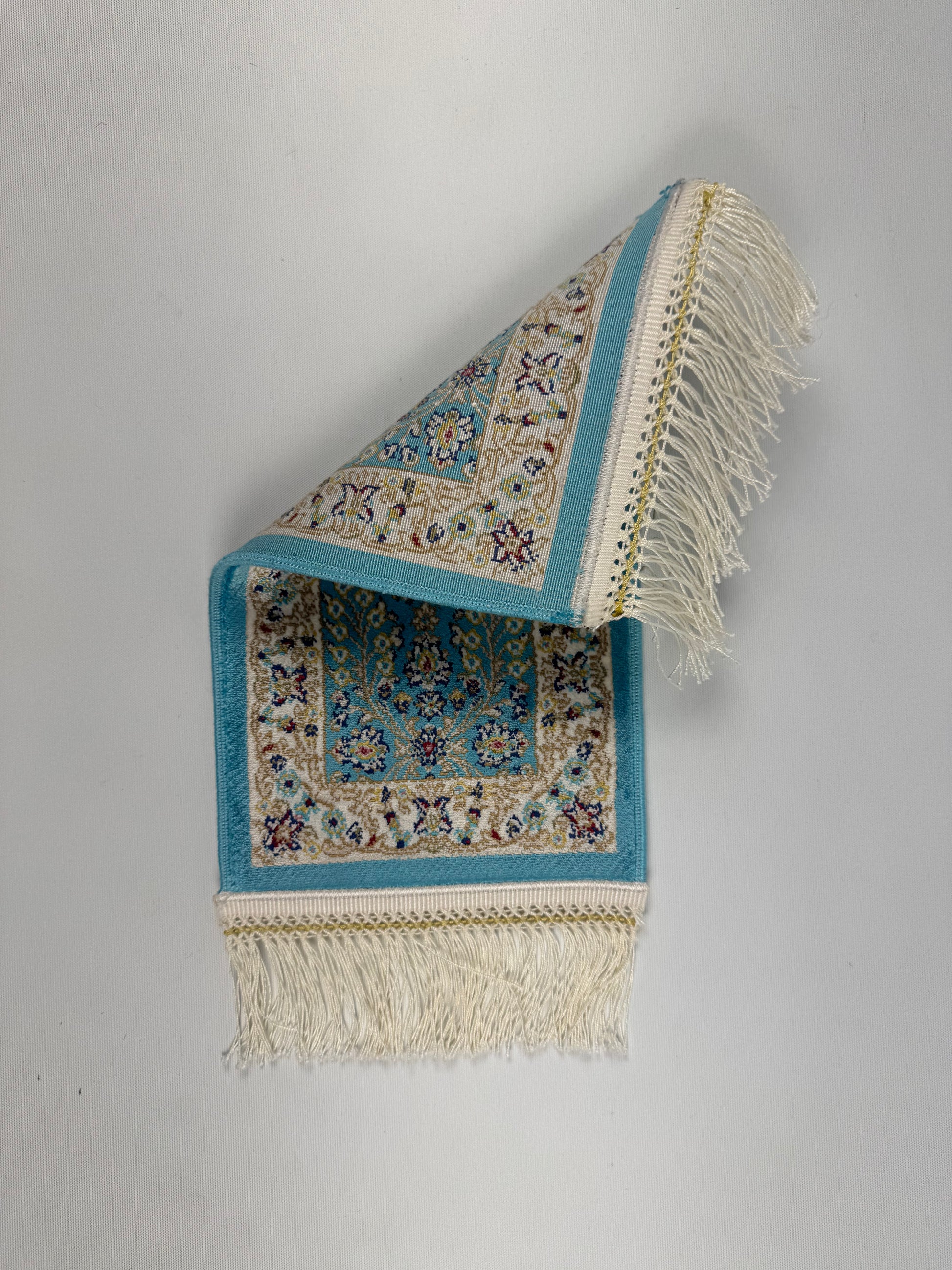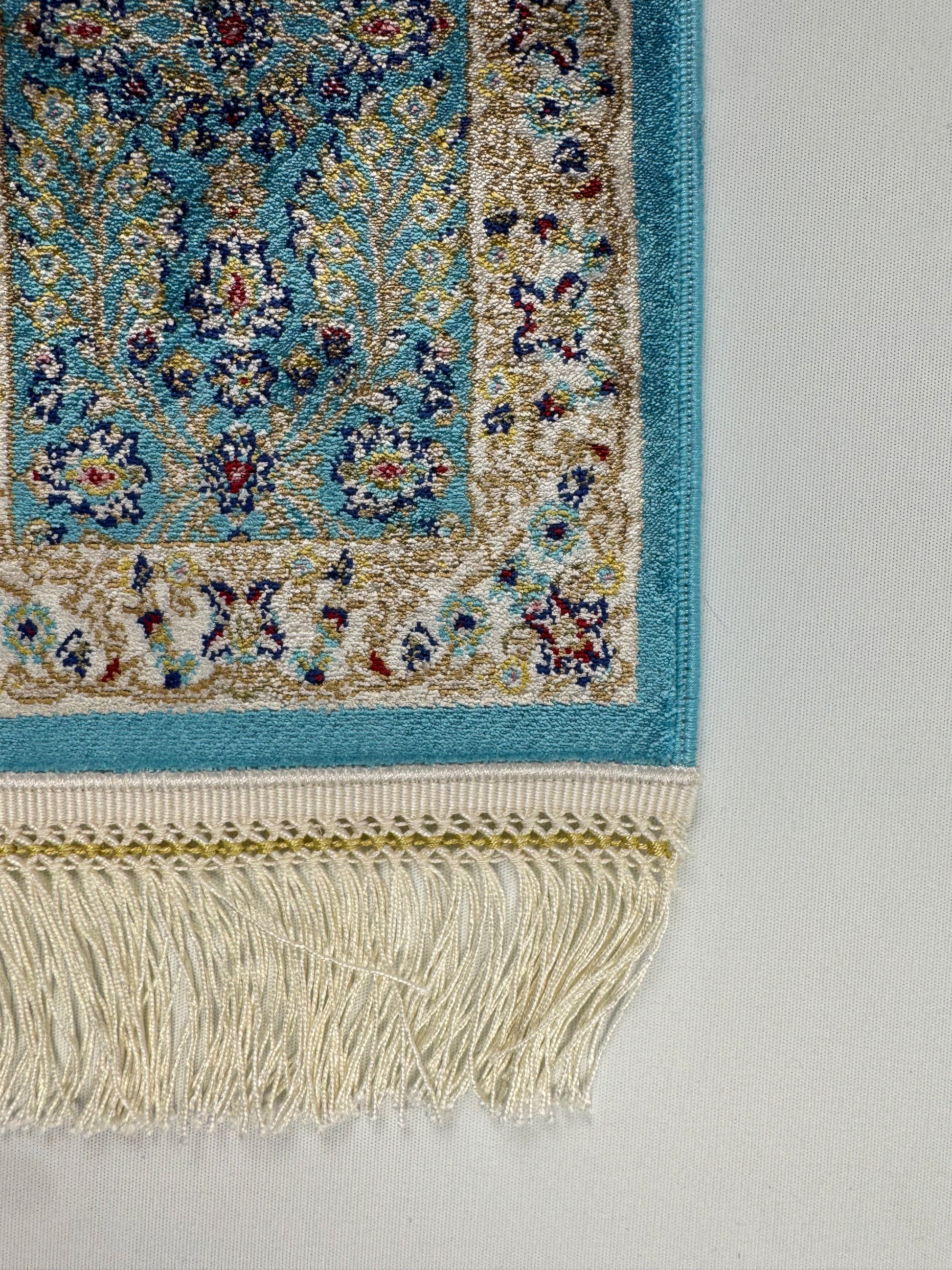 This Silken Echo mini rug (SE-0023) features elegant floral motifs on a vibrant turquoise background. With its silky shine and compact size (0.2×0.3 m), it is perfect as a decorative collectible piece for tables, shelves, or walls. A timeless touch of elegance for any interior.