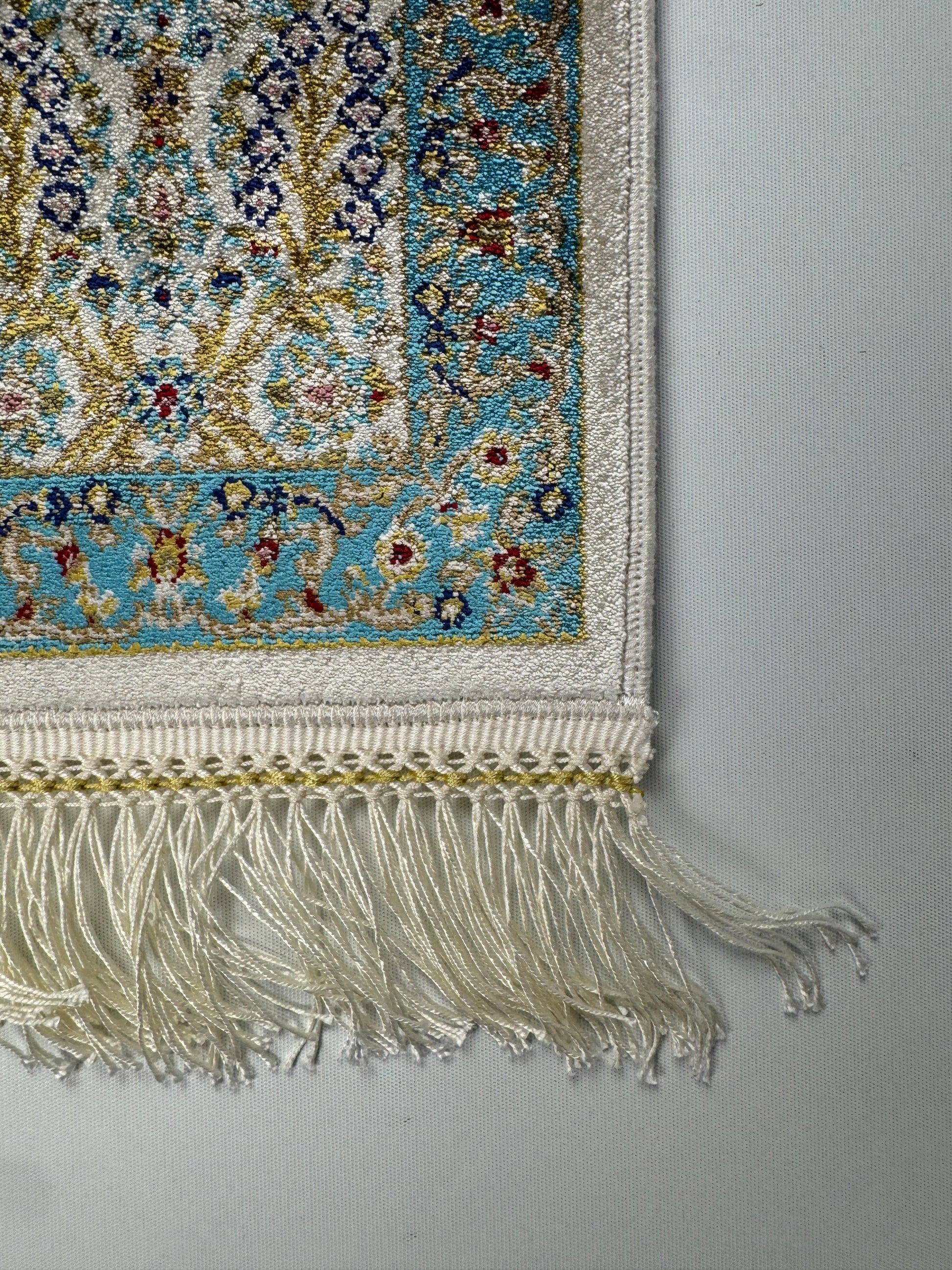 Silken Echo mini koleksiyonunun SE-0025 kodlu modeli, turkuaz zemin üzerinde altın ve krem detaylı klasik desenleriyle dikkat çekiyor. İpeksi parlaklığı ve küçük boyutu (0.2×0.3 m) sayesinde masa, sehpa veya duvar dekoru için ideal, koleksiyonluk bir parçadır.