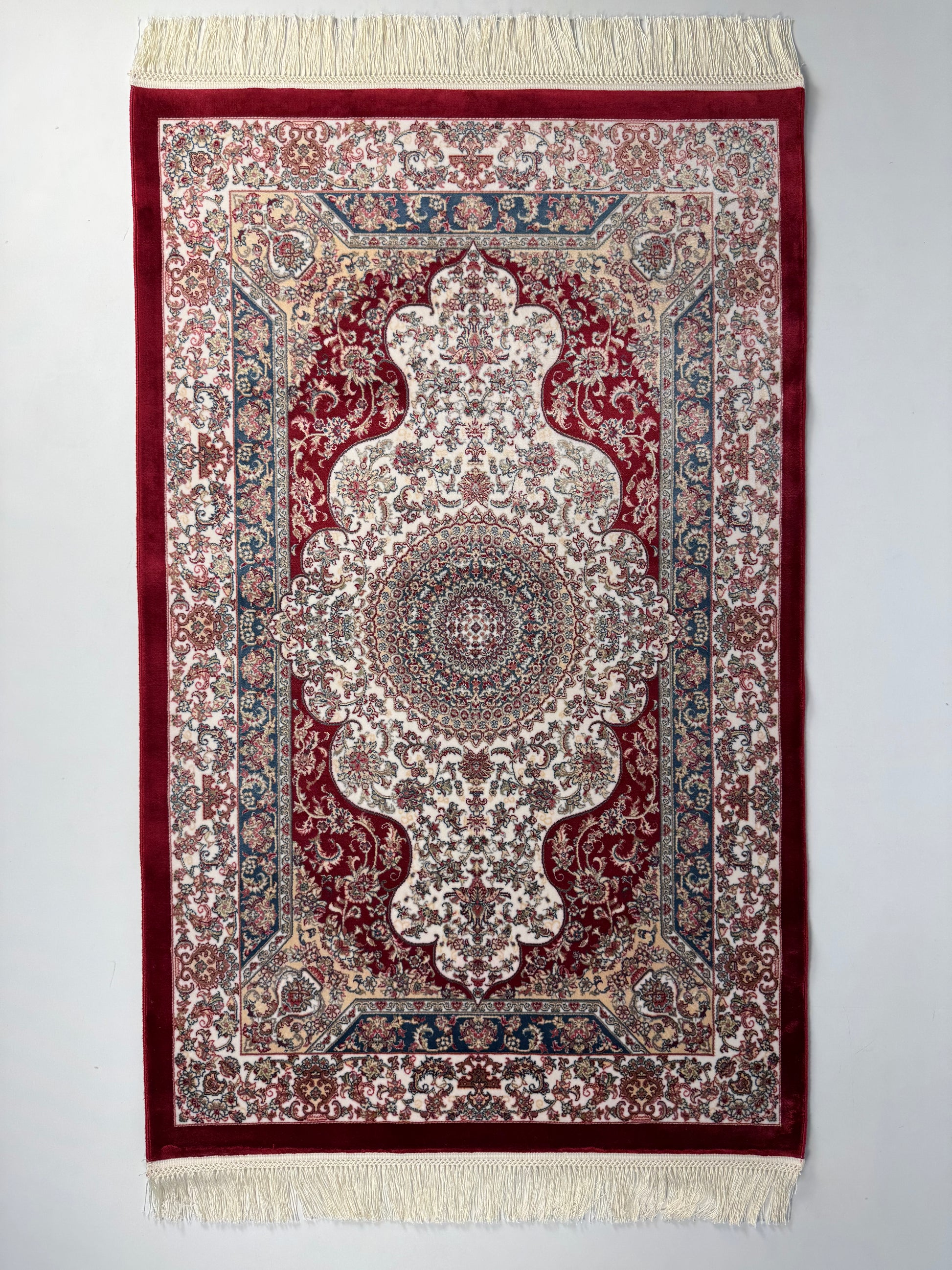 Silken Echo Halı – Bordo Mavi Krem İpeksi Dokulu Medallion Desenli Klasik Dekoratif Halı (0.80 x 1.25 m) | SE-0053