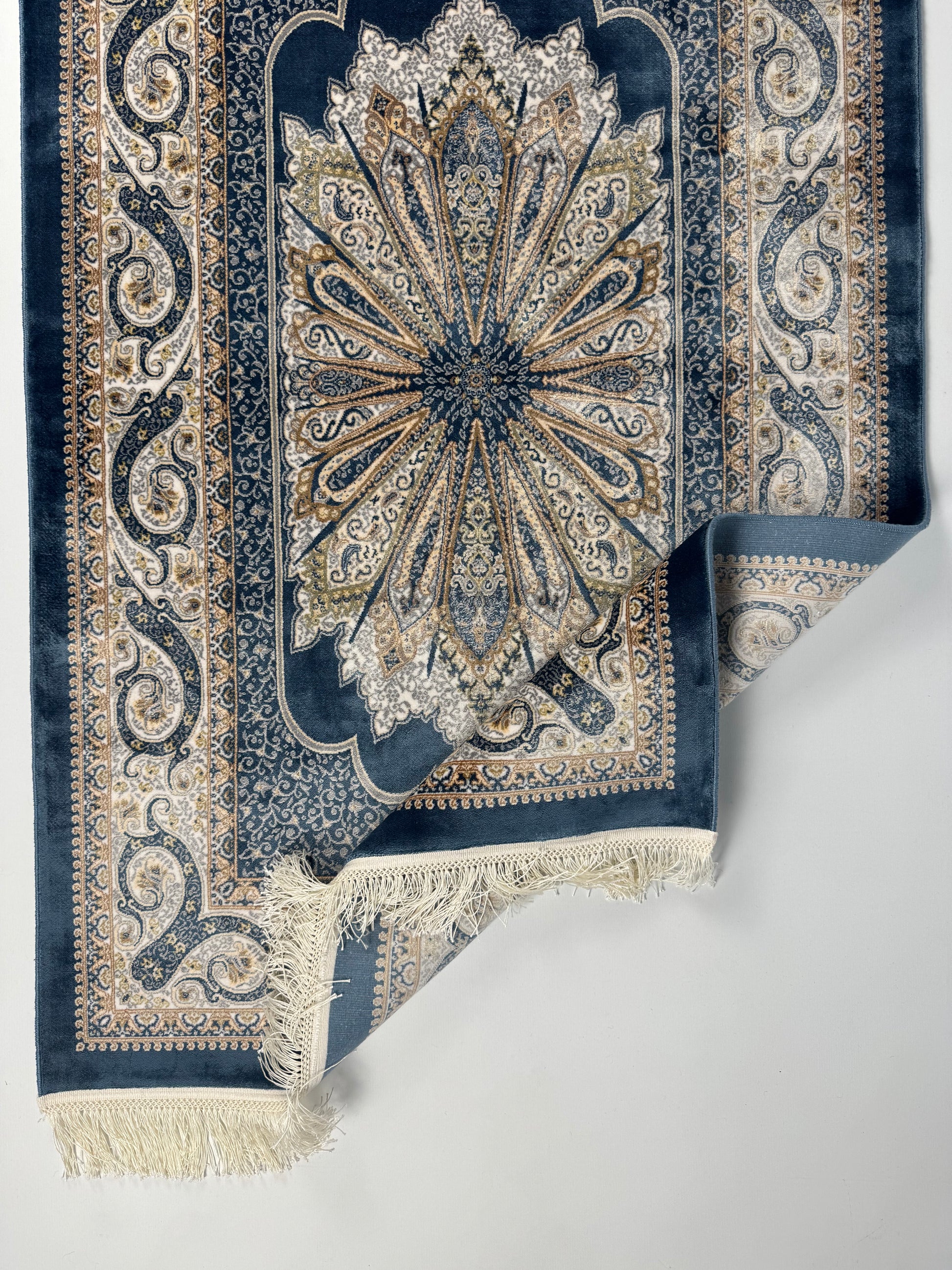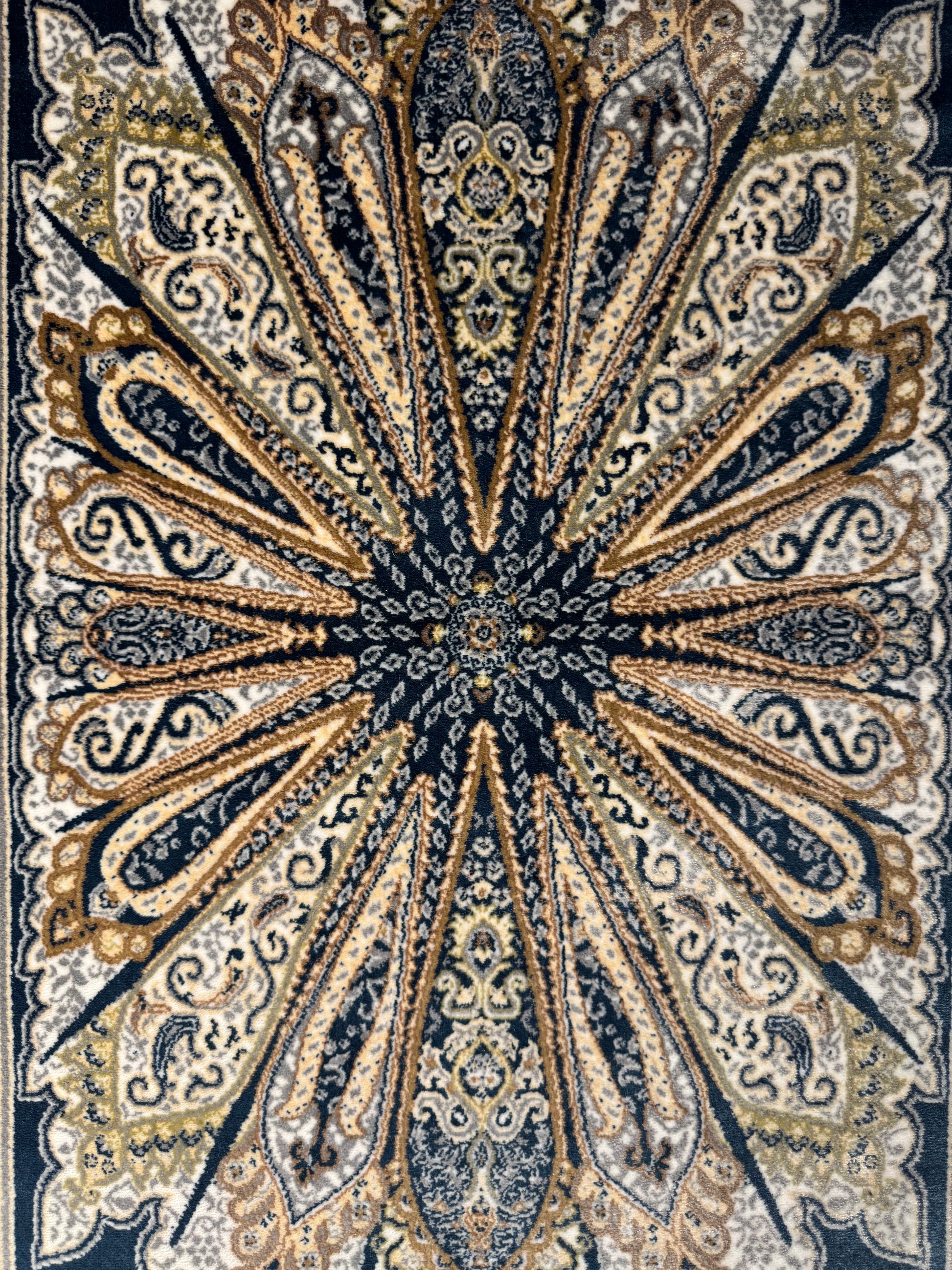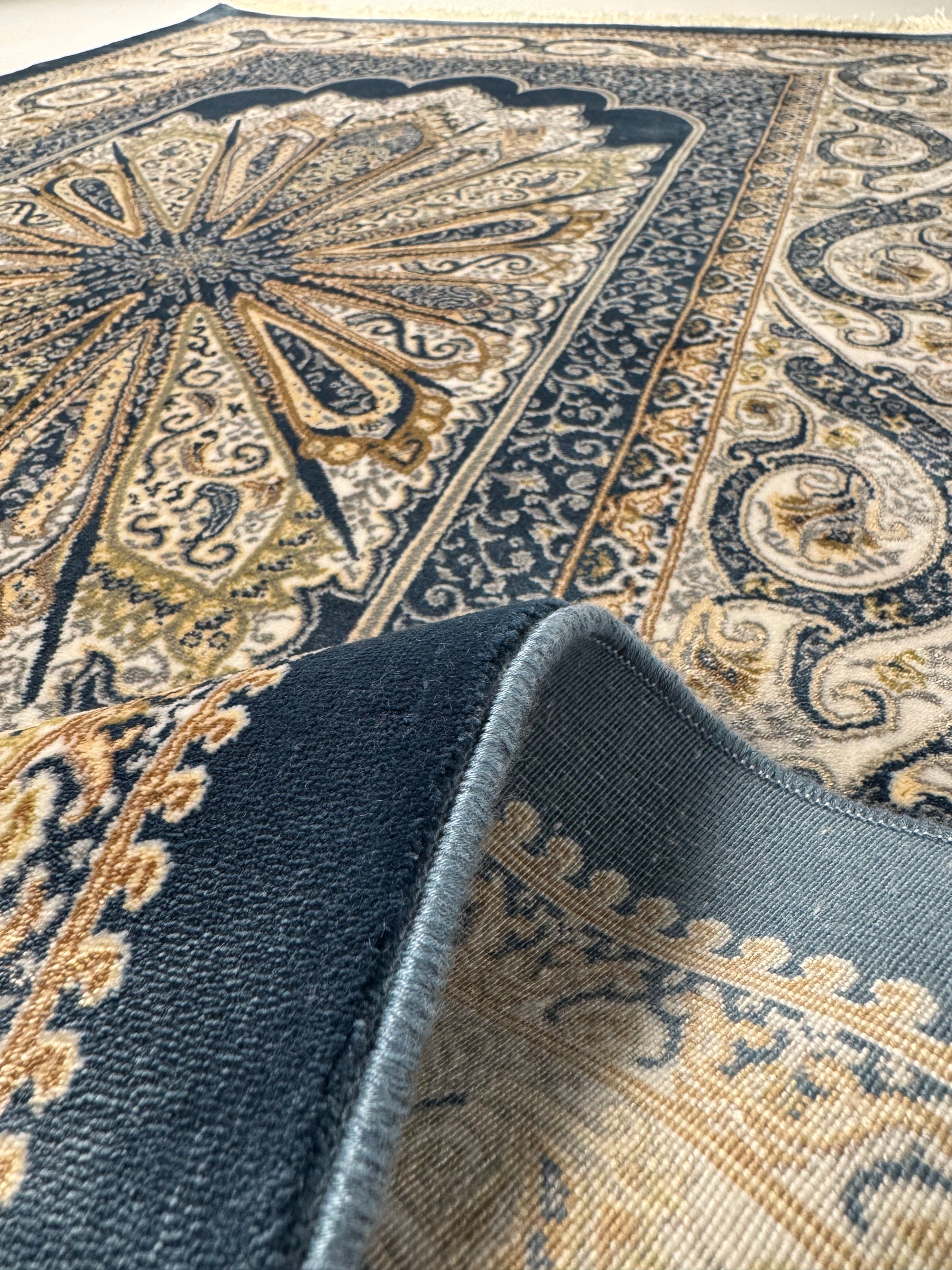 Silken Echo serisinin SE-0050 kodlu bu halısı, lacivert zemin üzerinde yer alan krem ve altın tonlarındaki büyük motifleriyle ihtişamlı bir görünüm sunar. İpeksi dokusu sayesinde ışığı farklı açılardan yansıtır, mekânlarınıza sofistike bir atmosfer katar. Hem klasik hem de modern dekorasyonlarda lüks bir tamamlayıcıdır.