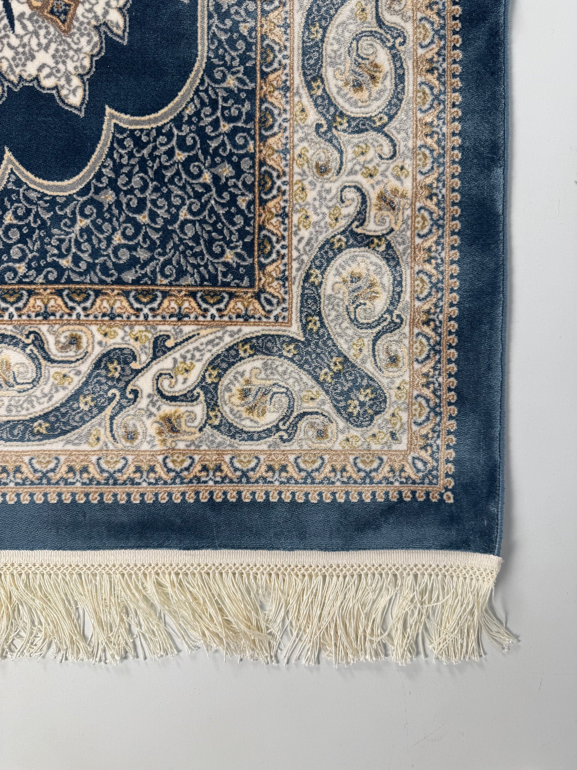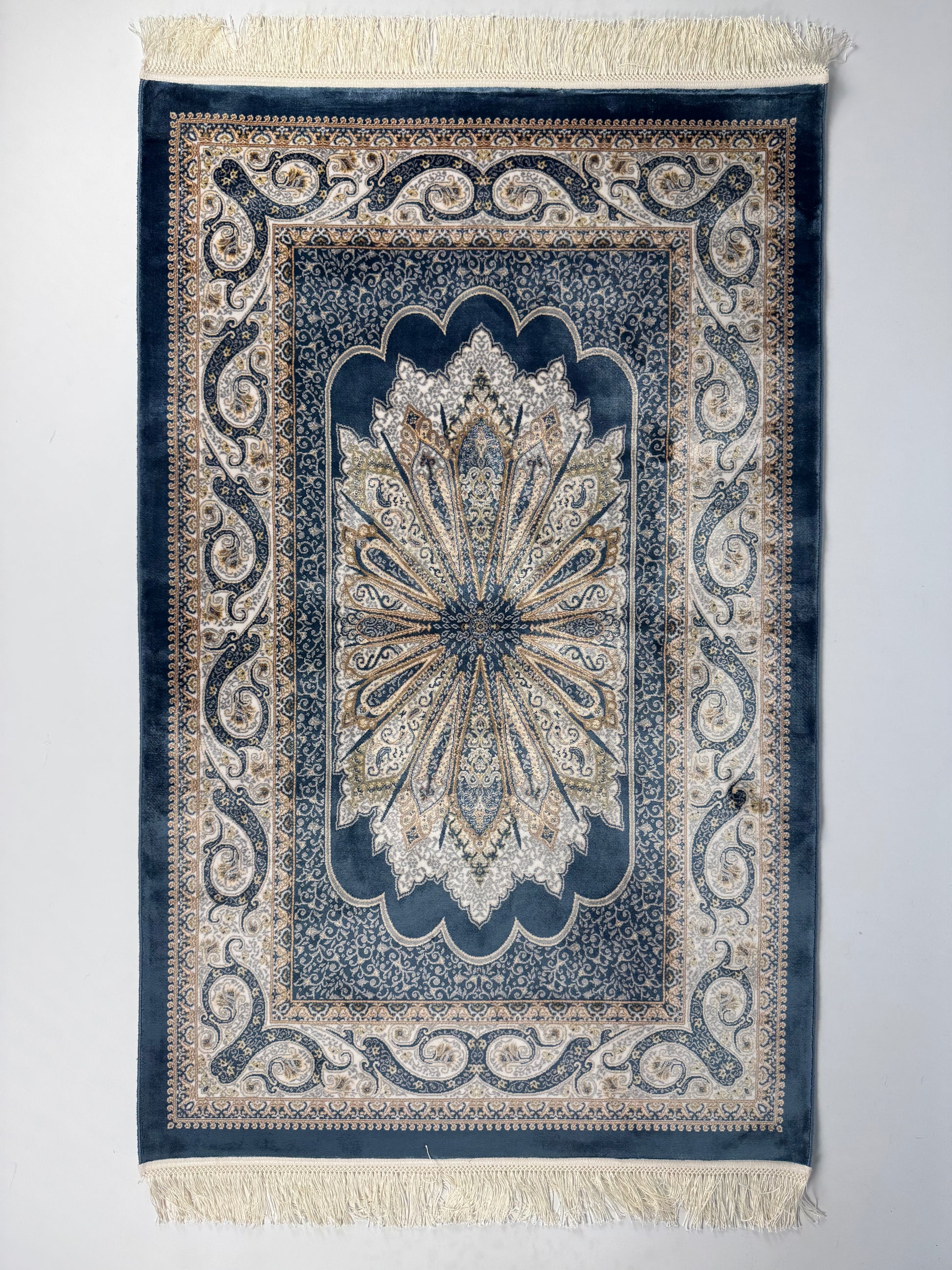 Silken Echo Halı – Lacivert Krem İpeksi Dokulu Büyük Motifli Klasik Dekoratif Halı (0.80 x 1.25 m) | SE-0050