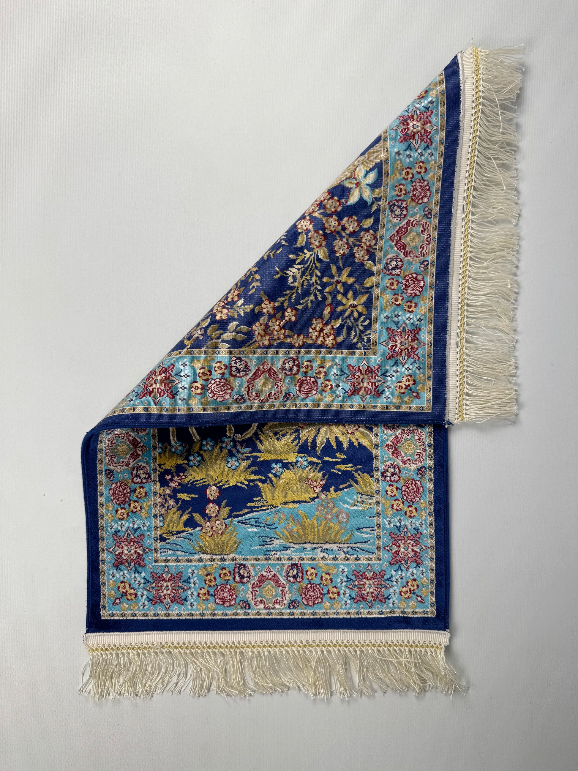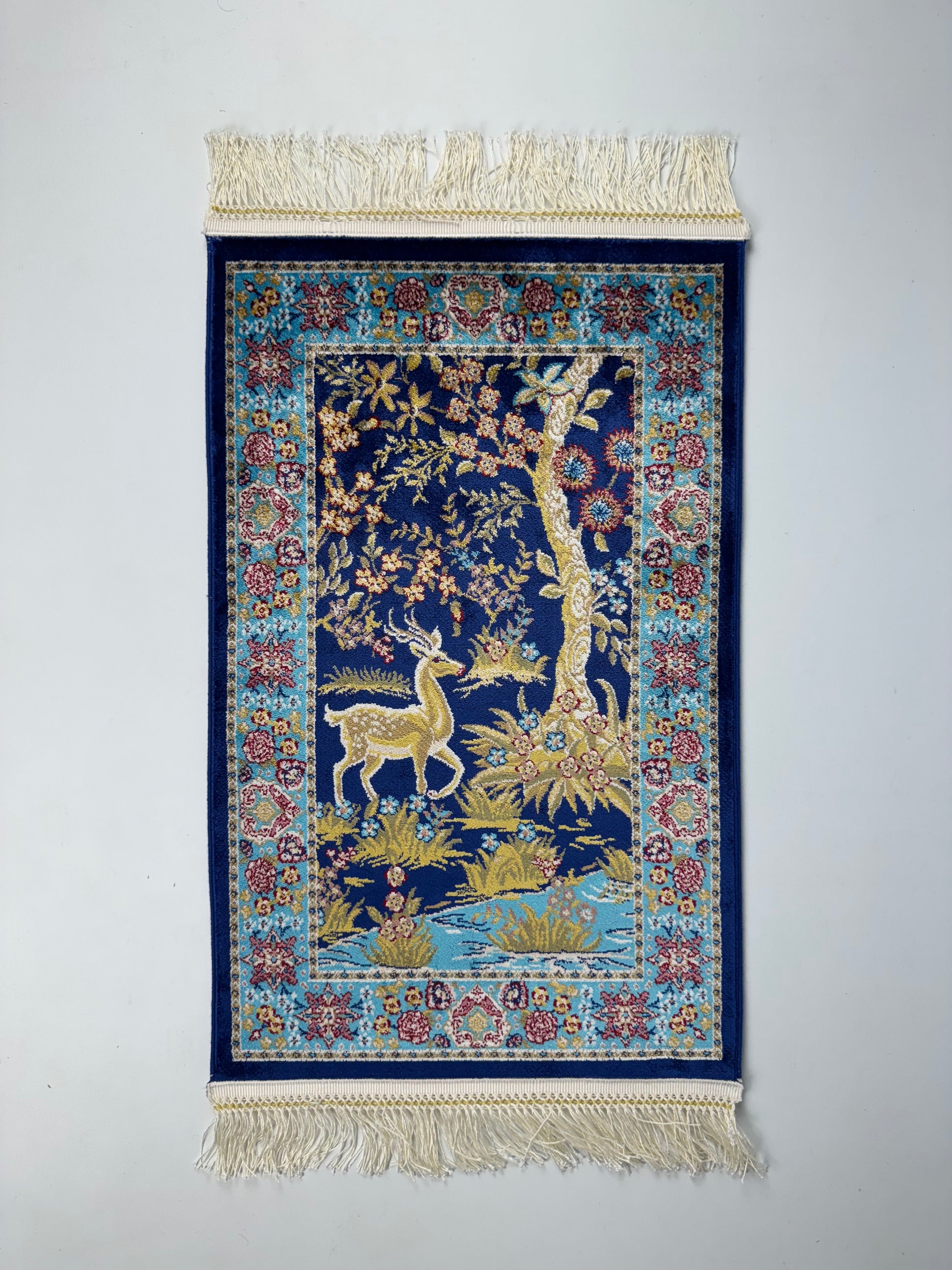 Silken Echo koleksiyonunun SE-0033 kodlu bu ipeksi dokuma halısı, lacivert zemin üzerinde altın sarısı ceylan motifi ve zarif doğa sahnesiyle öne çıkıyor. Çevresini saran çiçeklerle işlenmiş bordür, halıya hem klasik hem de romantik bir karakter katıyor. Parlak ipeksi dokusu ışığa göre farklı açılarda canlı bir parlaklık sergiler. Küçük boyutu sayesinde seccade, duvar dekoru ya da özel alanlarda göz alıcı bir sanat objesi olarak kullanılabilir.