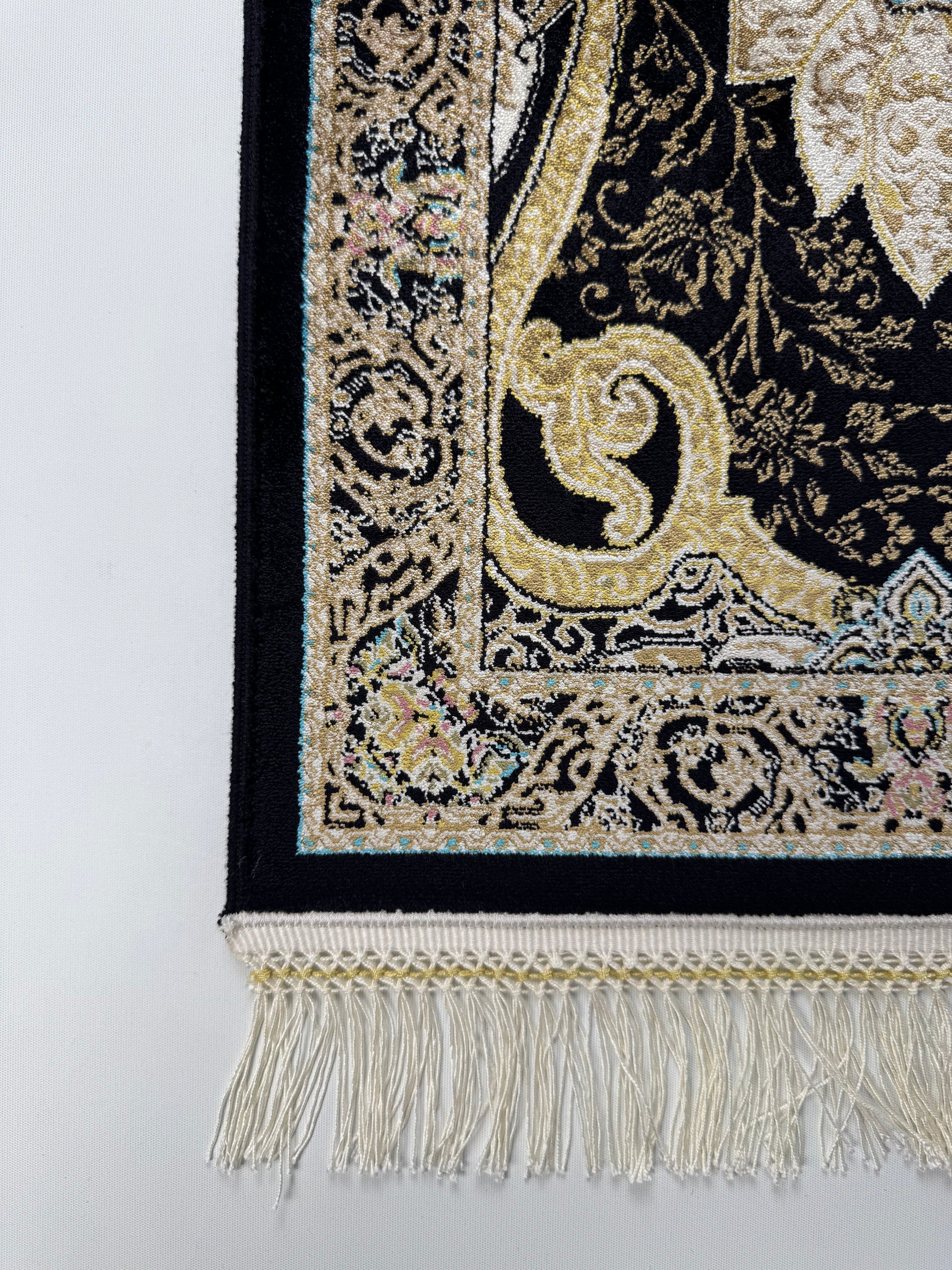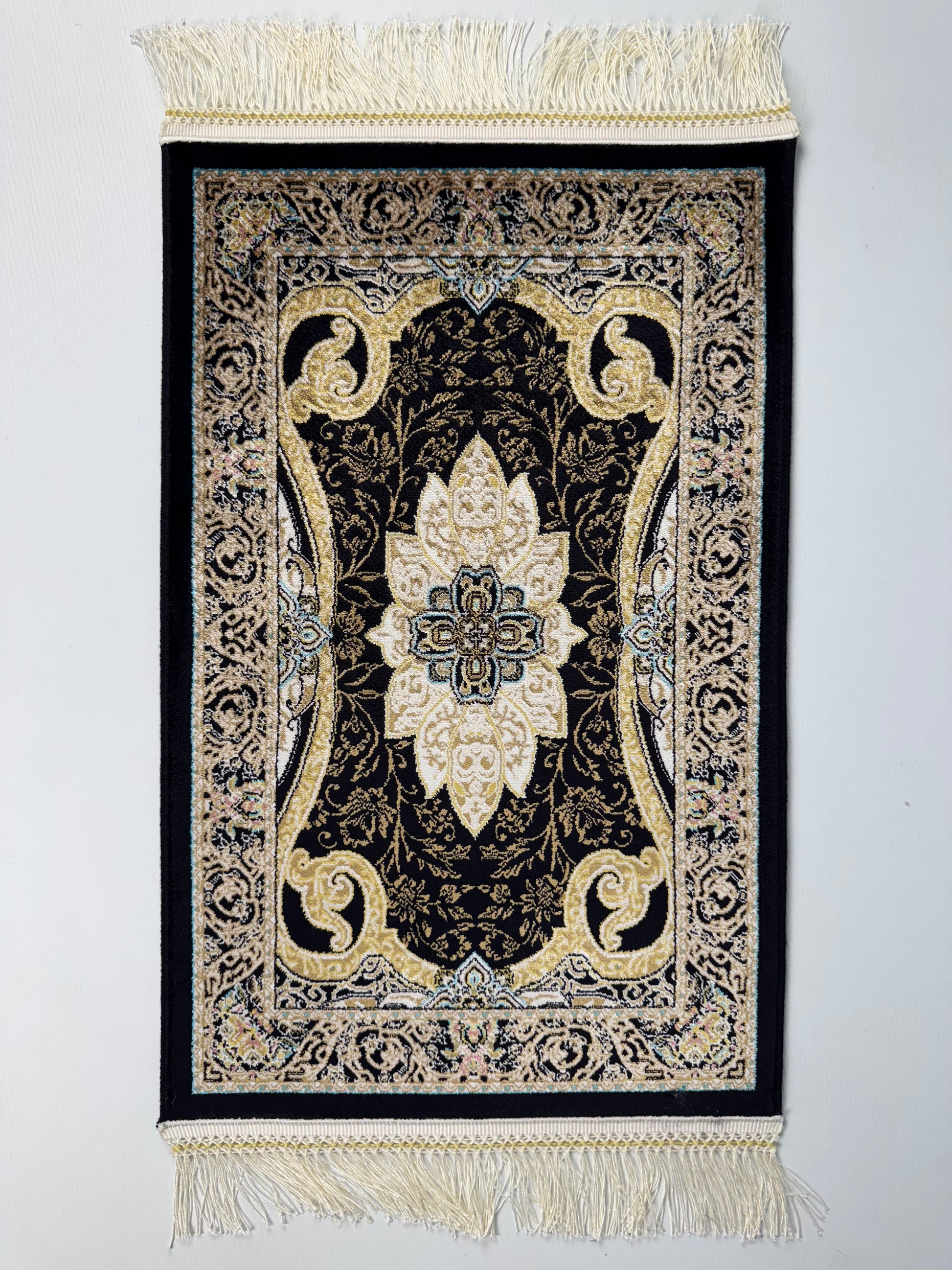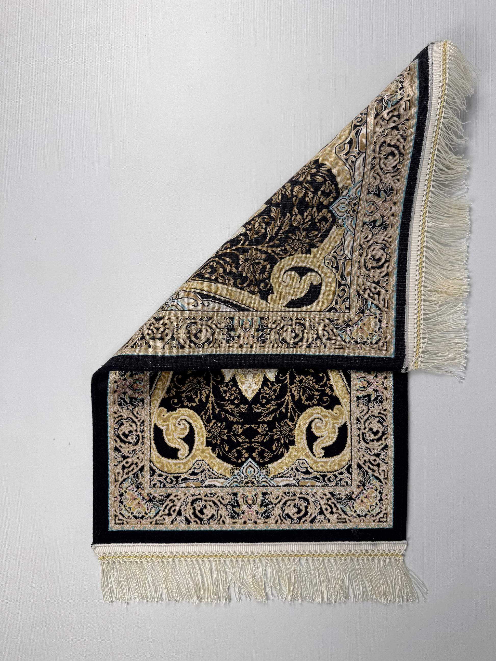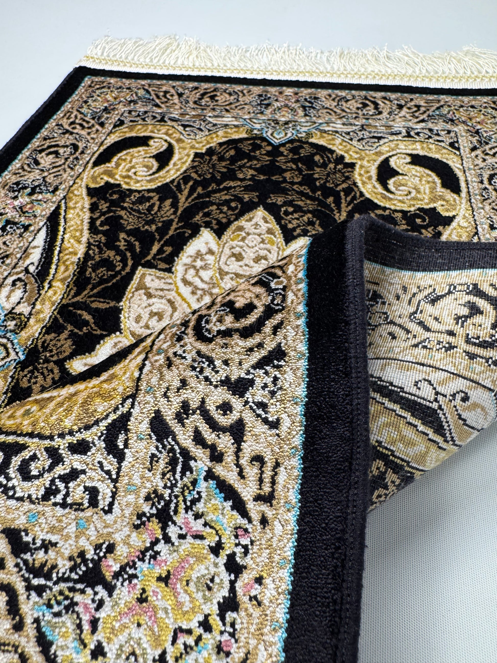 Silken Echo İpeksi Dokuma Halı – Siyah Zeminli Altın Varaklı Klasik Desenli Halı (0.40 x 0.60 m) | SE-0043