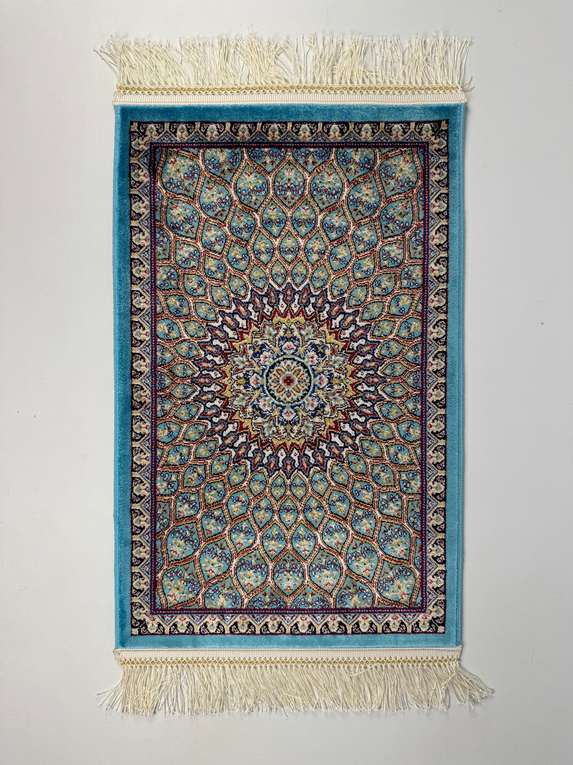 Silken Echo İpeksi Dokuma Halı – Turkuaz Kenarlı Medalyon ve Geometrik Desenli Halı (0.40 x 0.60 m) | SE-0038