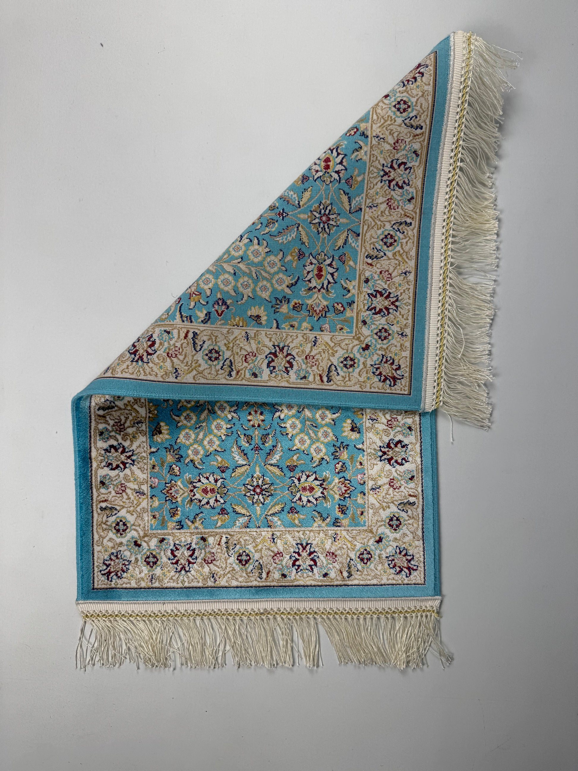 Silken Echo koleksiyonunun SE-0031 kodlu bu ipeksi dokuma halısı, canlı turkuaz zemin üzerine işlenmiş çiçek desenleriyle mekânlara ferah ve zarif bir hava katıyor. Çevresini saran krem ve altın tonlarındaki bordür, halıya klasik bir ihtişam kazandırırken, parlak ipeksi dokusu ışıltılı bir görünüm sunuyor. Küçük boyutuyla seccade, dekoratif duvar halısı ya da özel alanlarda estetik bir detay olarak kullanılabilir.